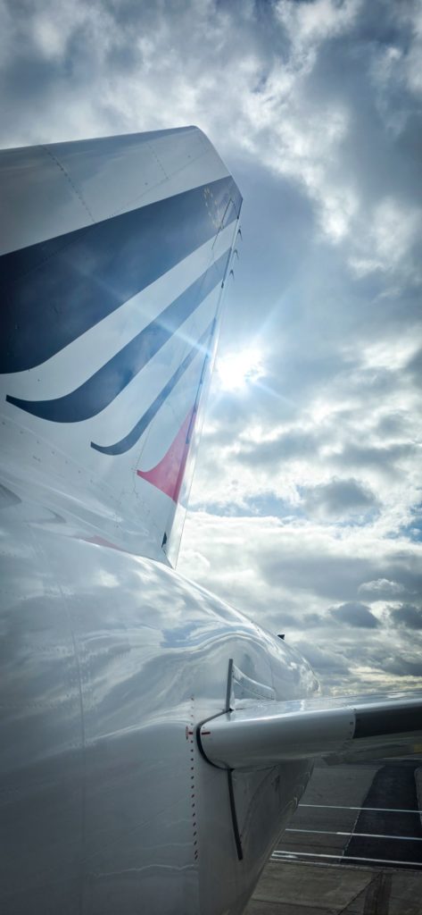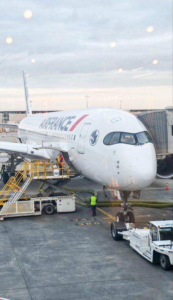 L’avion dans lequel nous montons est tout neuf, ultra high tech, les repas très bons…vive Air France !