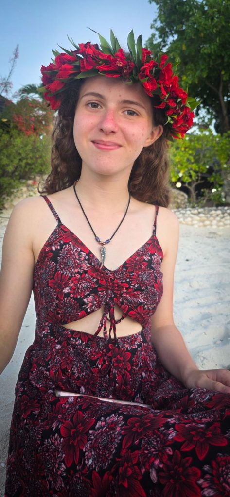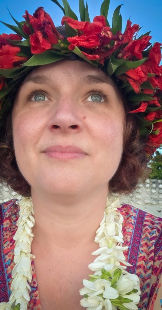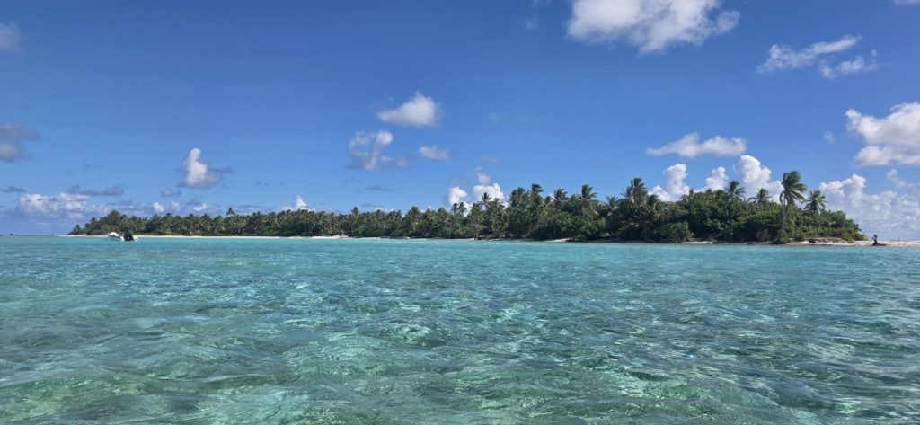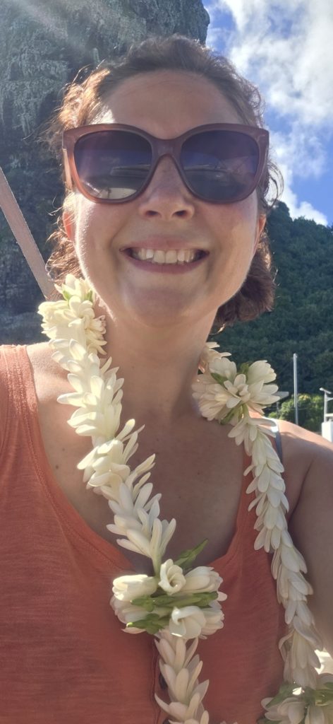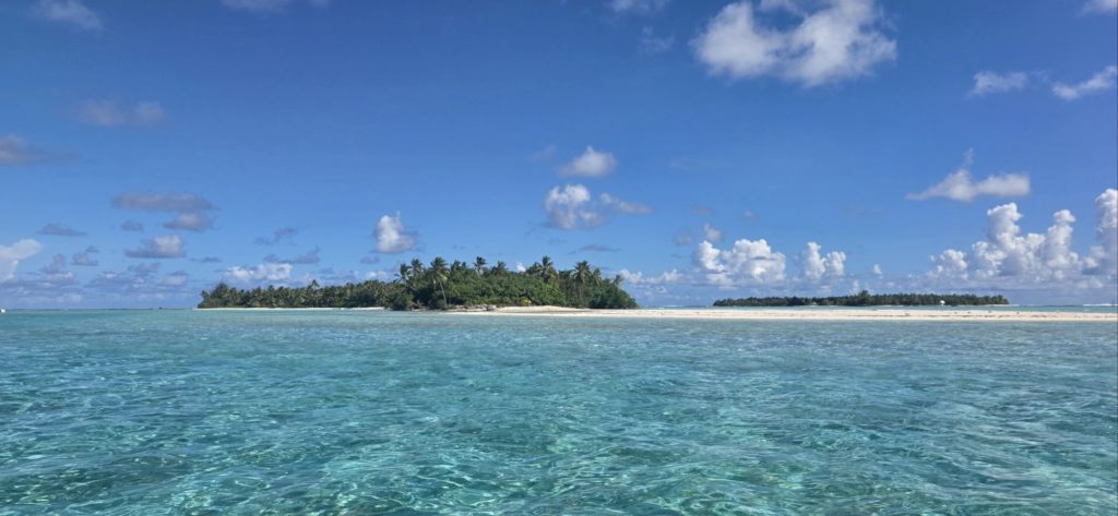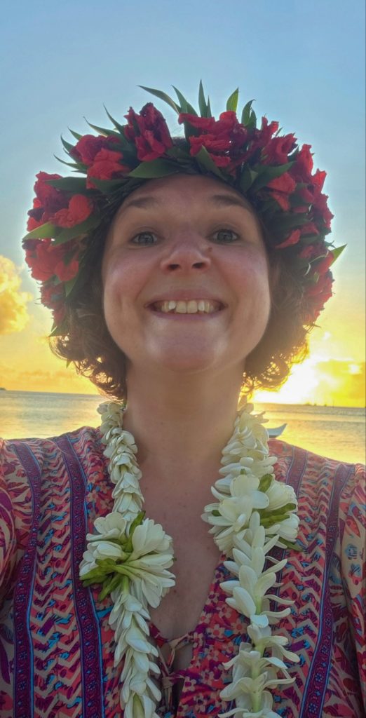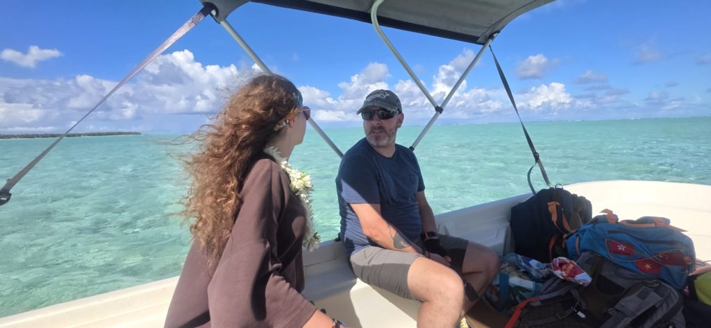 Nous accostons et sommes accueillis avec des colliers des fleurs de tiaré par Leila, qui doit nous emmener jusqu’à notre motu.