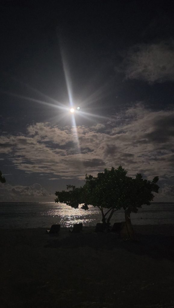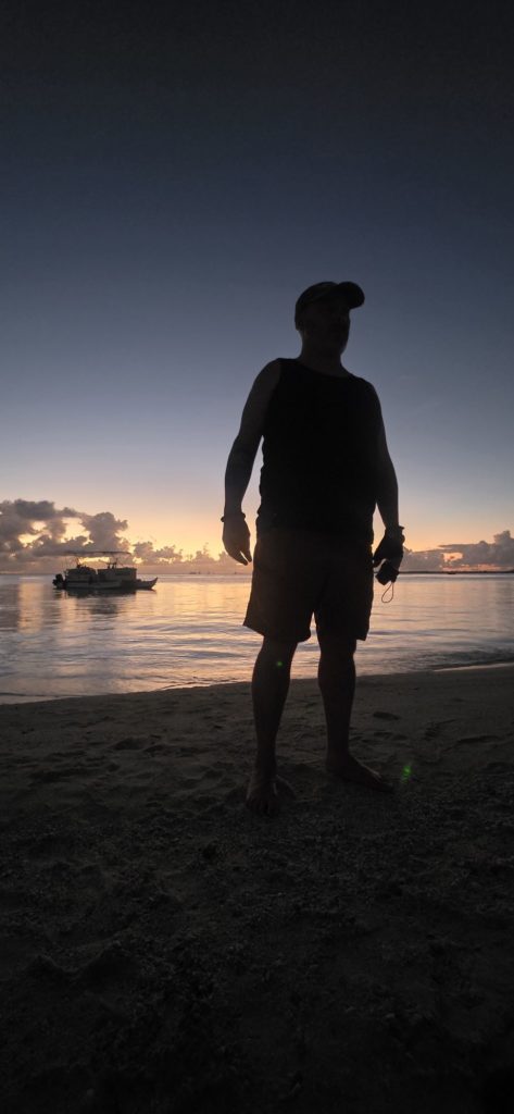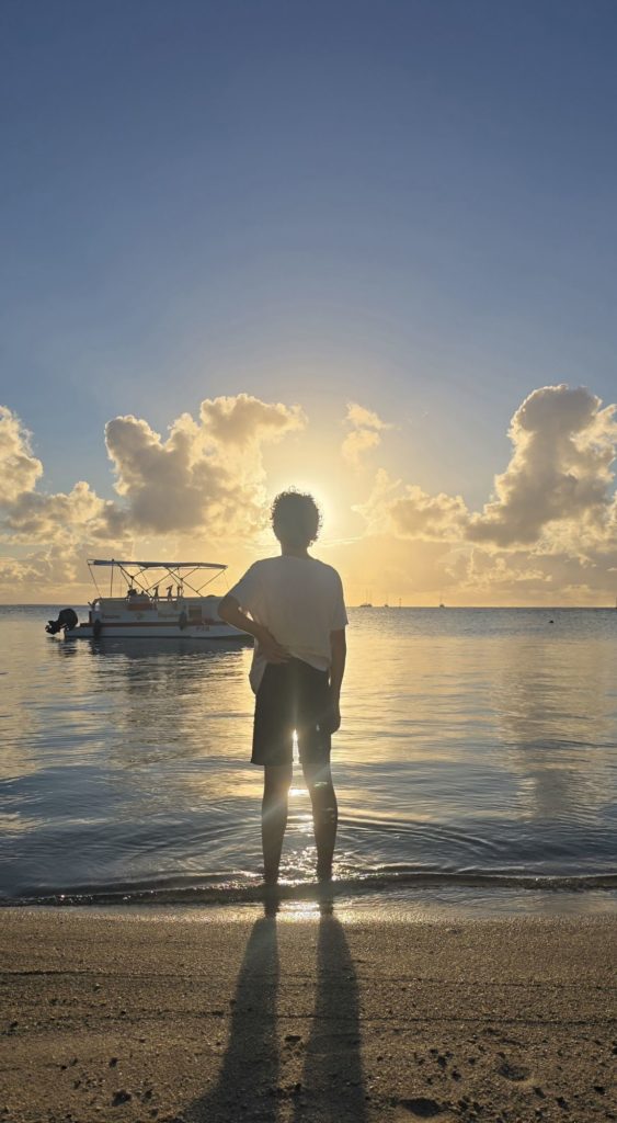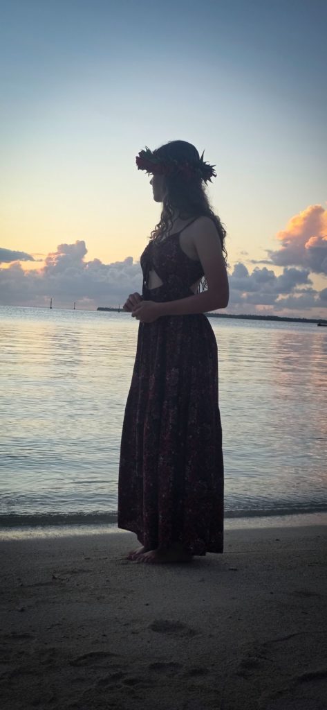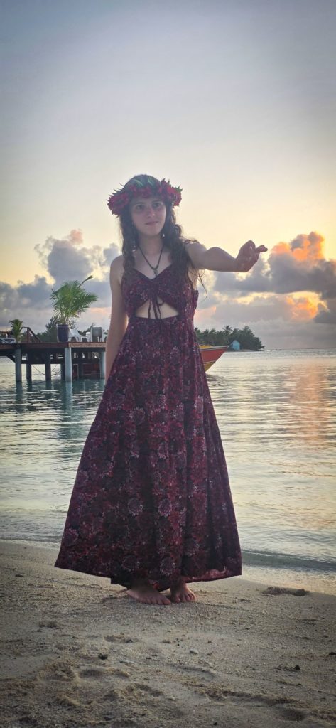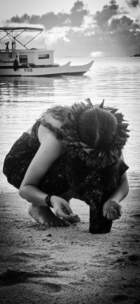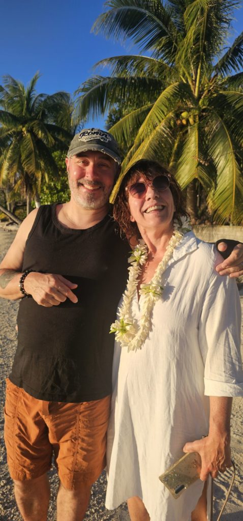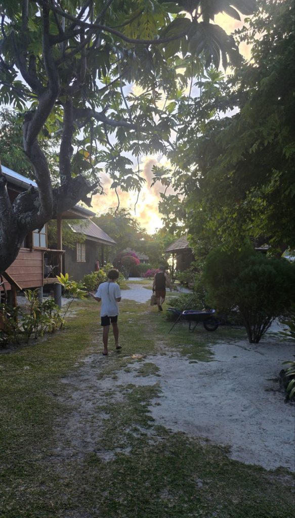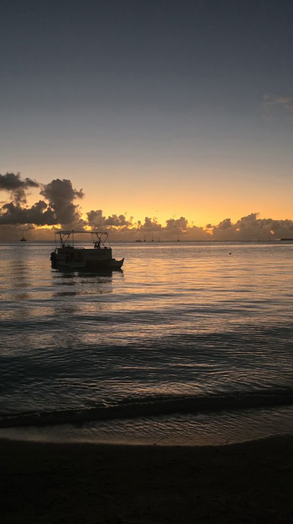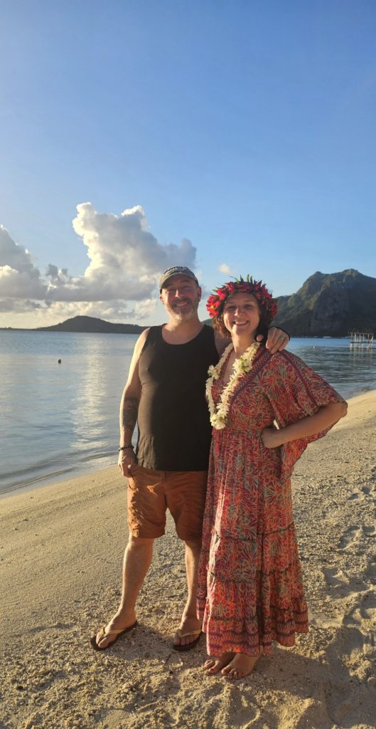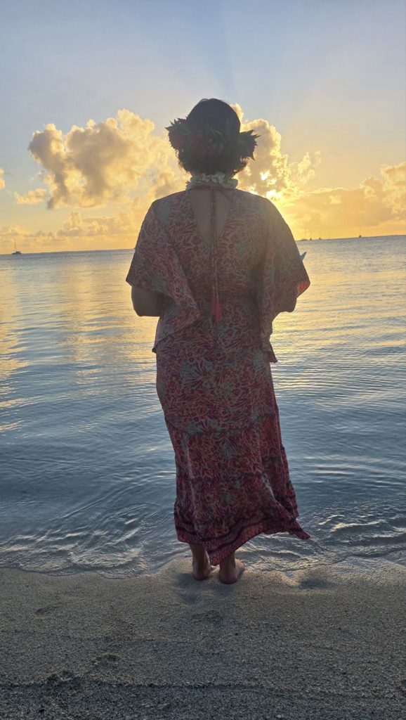 Nous nous installons sur la plage côté sunset pour prendre l’apéritif et admirer le coucher de soleil. Le parfum de nos colliers est enivrant. Du pur bonheur !