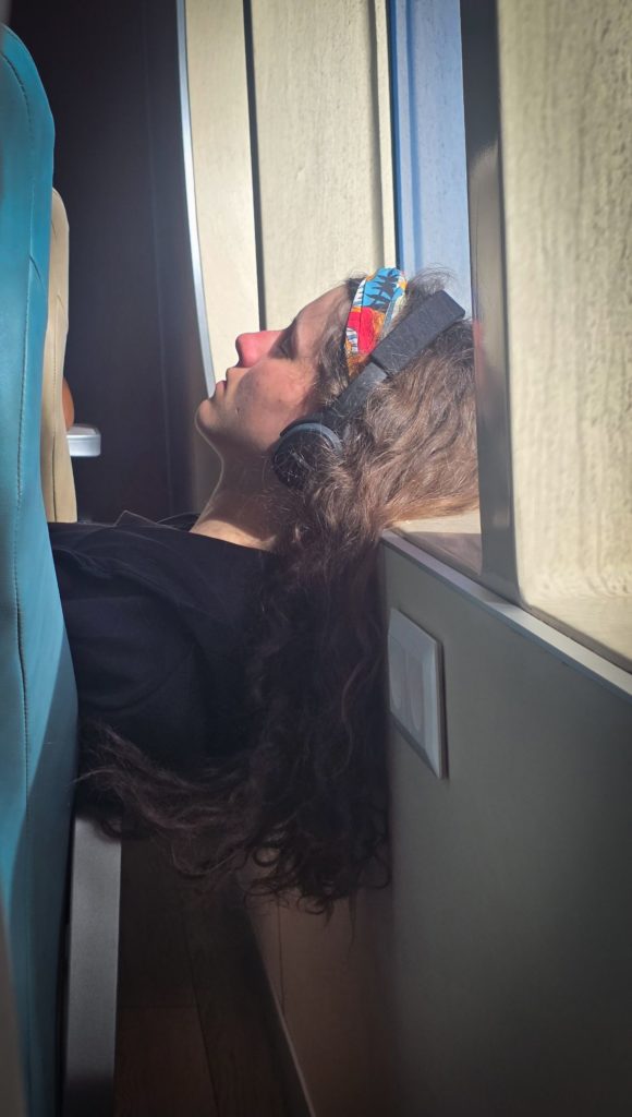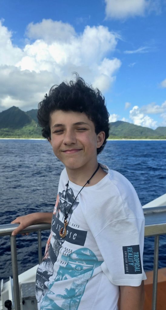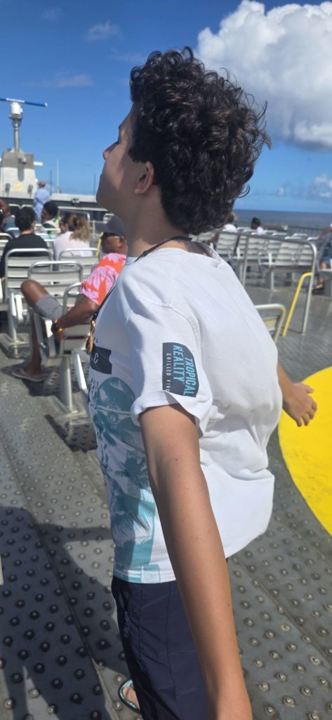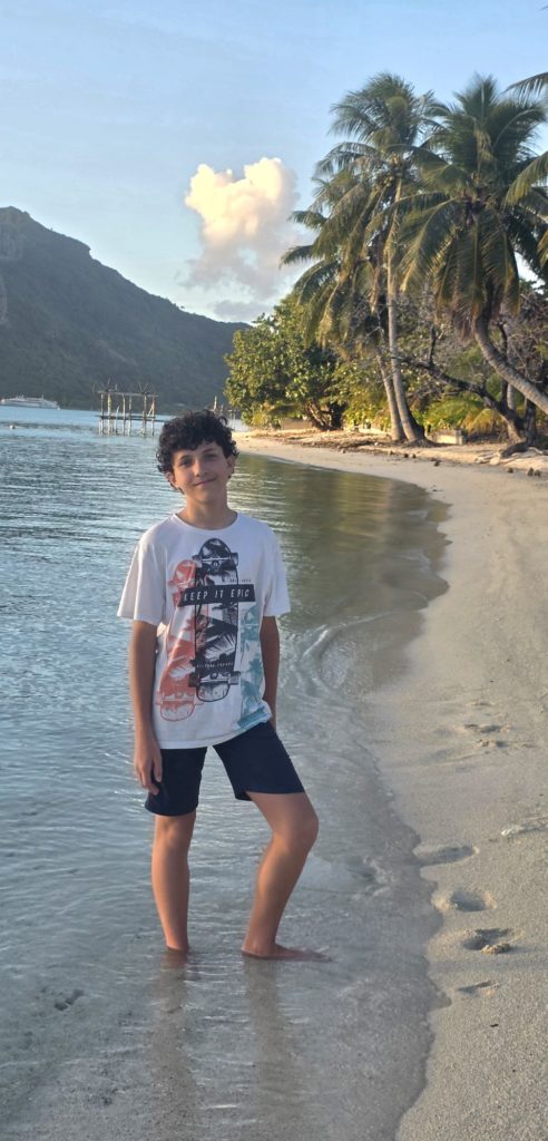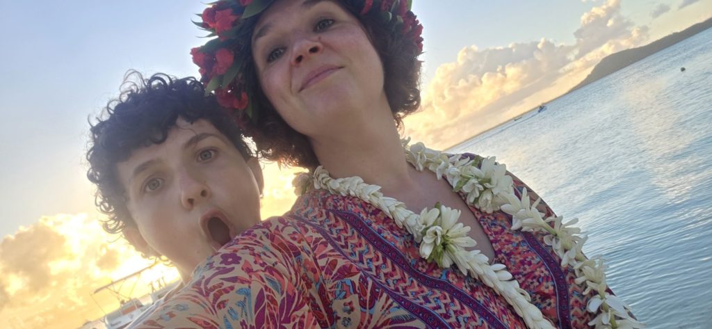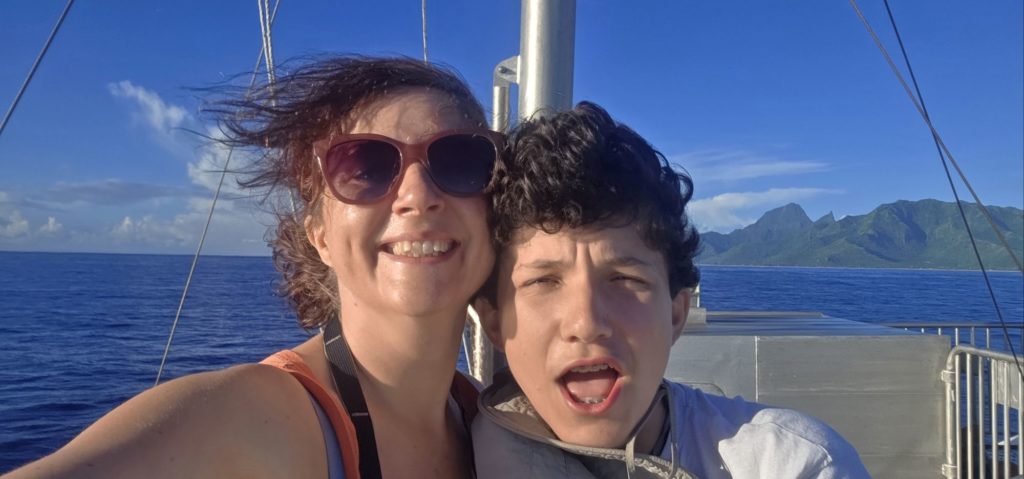 Nous partons pile à l’heure, à 6h30. Le bateau prend la direction de Huahine, où nous serons dans 3 heures. Valou, qui est malade en bateau, reste sur le pont supérieur, puis finit par descendre s’installer avec nous.