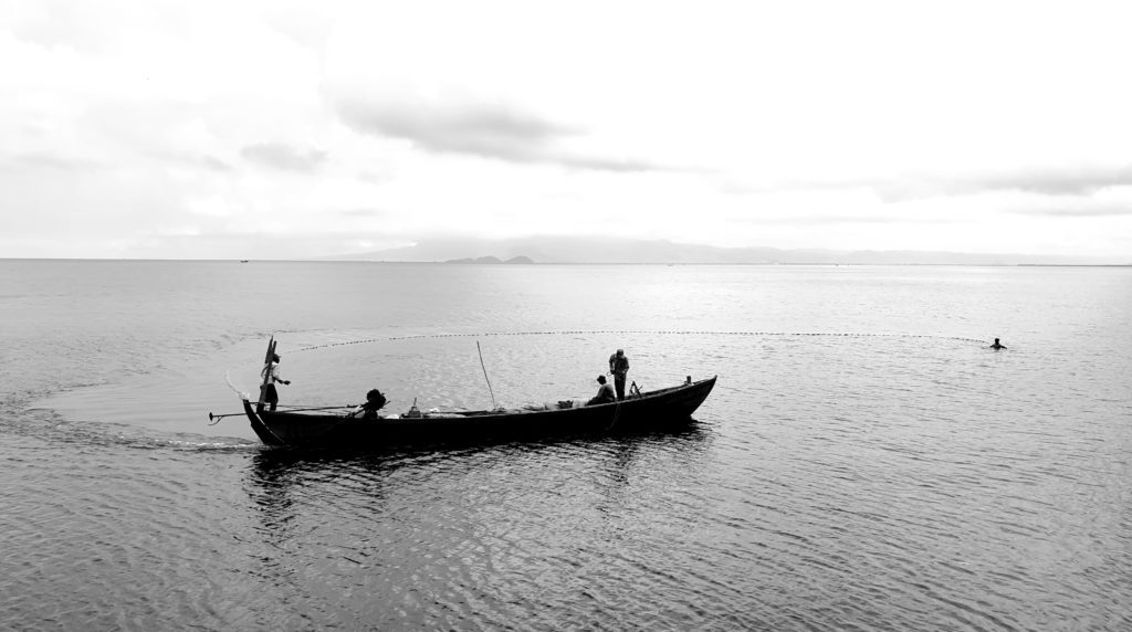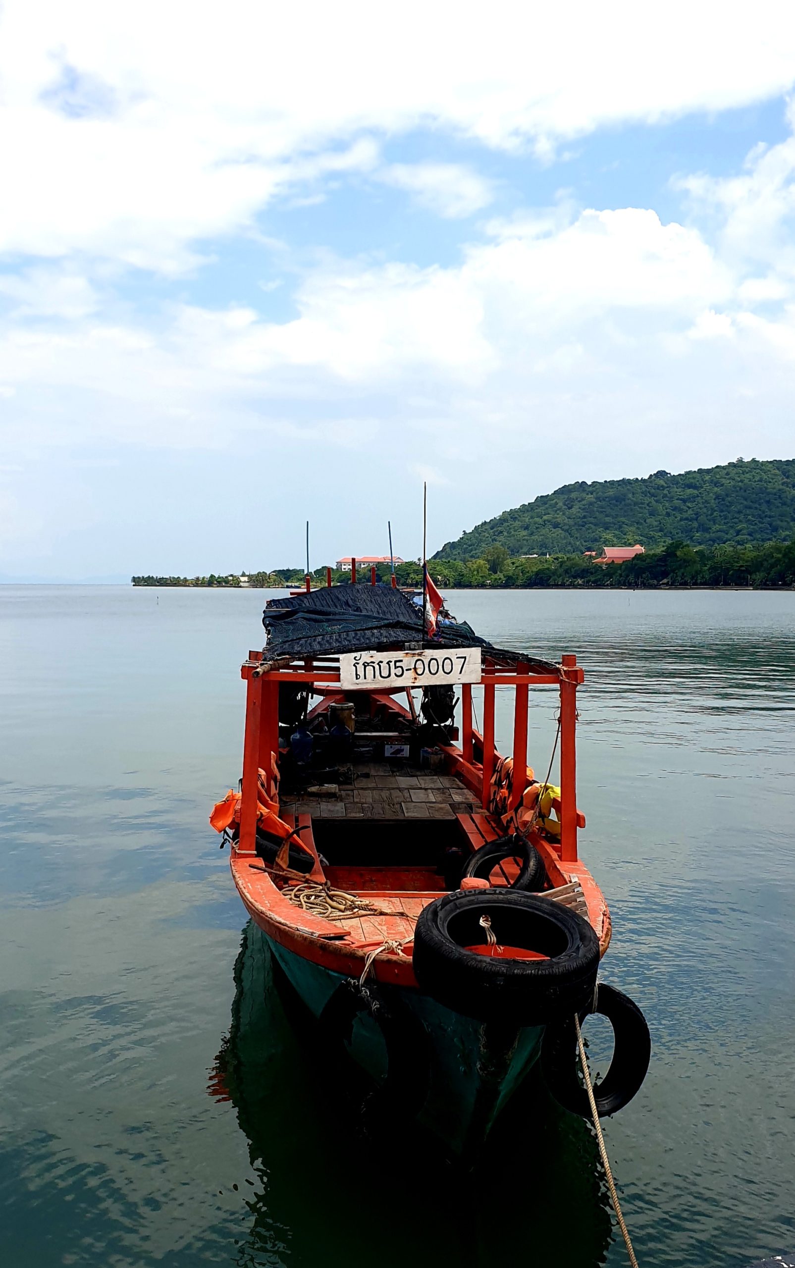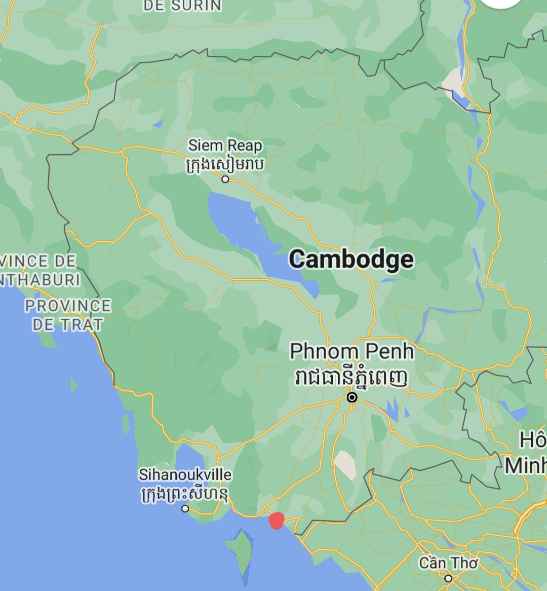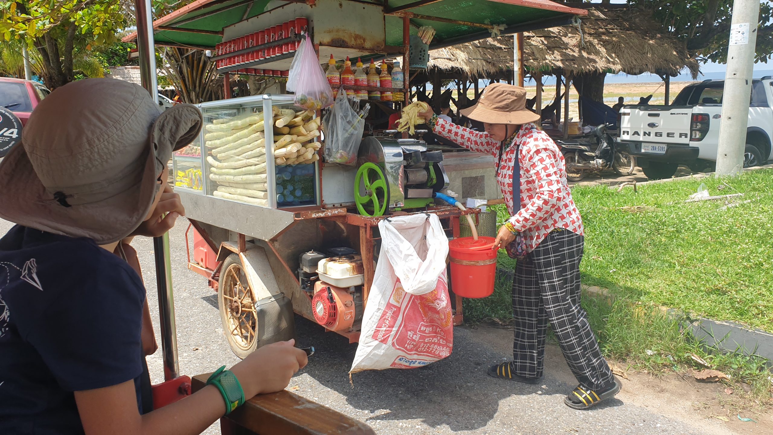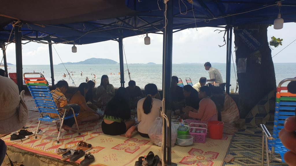 Comme il est un peu tôt pour manger sur place, Sas nous propose de faire un tour sur la côte. Nous nous arrêtons pour observer un bateau de pêcheurs, nous longeons sur des centaines de mètres des espaces au bord de la plage réservés aux pique-niques : il y a des nattes au sol, des chaises et surtout, l’élément indispensable ici que l’on trouve absolument partout : des hamacs !! Il faut savoir que chaque maison, chaque Tuk-Tuk, chaque boutique ou restaurant a son ou ses  hamacs. C’est là-dedans que les cambodgiens patientent ou font la sieste.