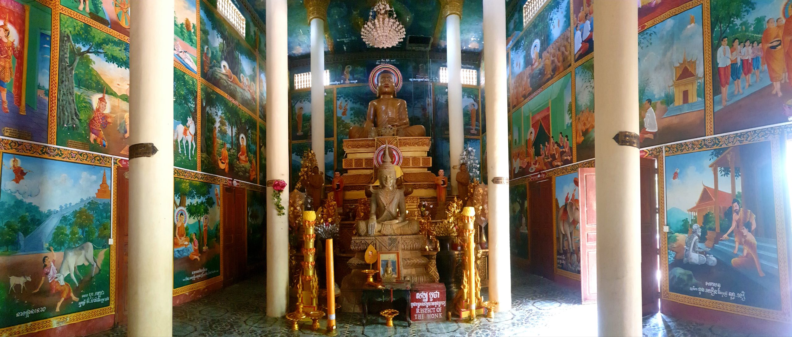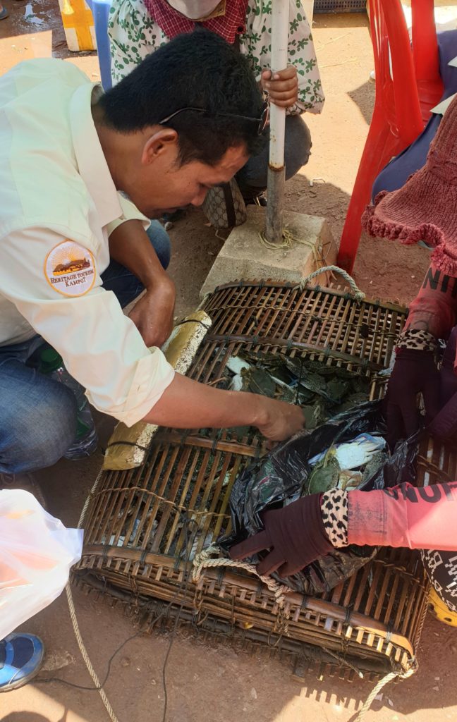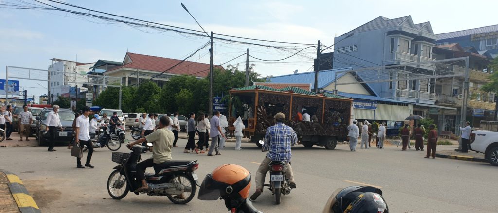 Nous nous arrêtons d’abord sur un marché aux légumes avec quelques spécialités cambodgiennes que nous ne connaissions pas. Il y a une cérémonie funèbre juste à côté, à laquelle nous assistons en retrait.