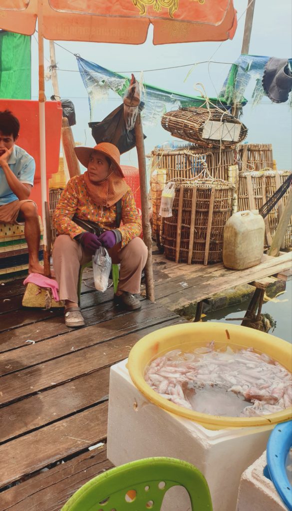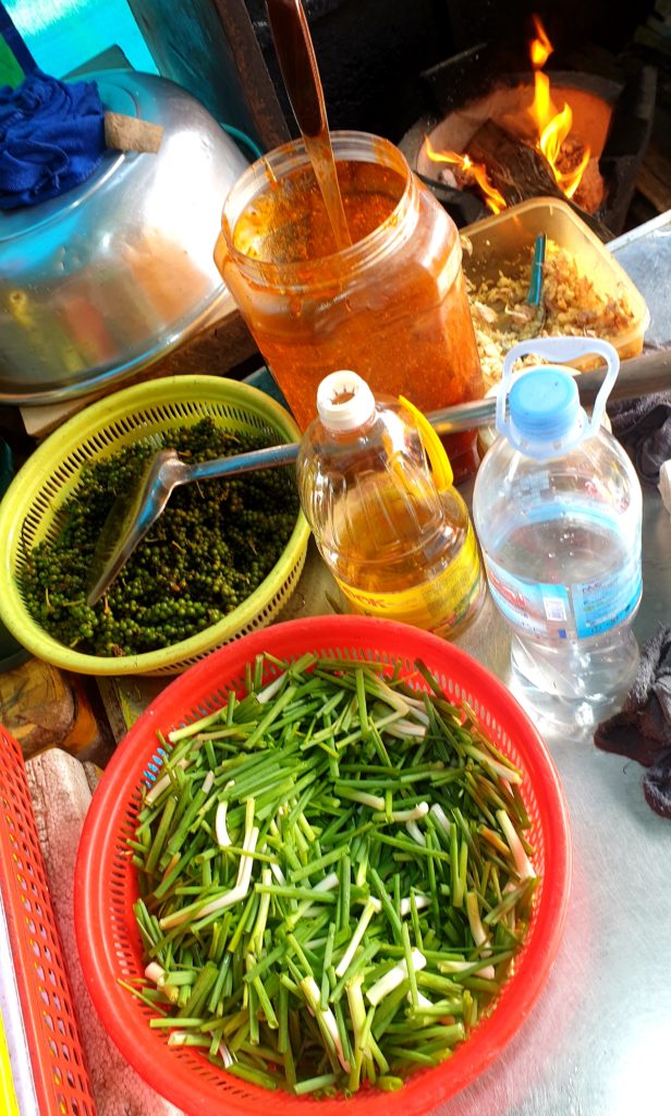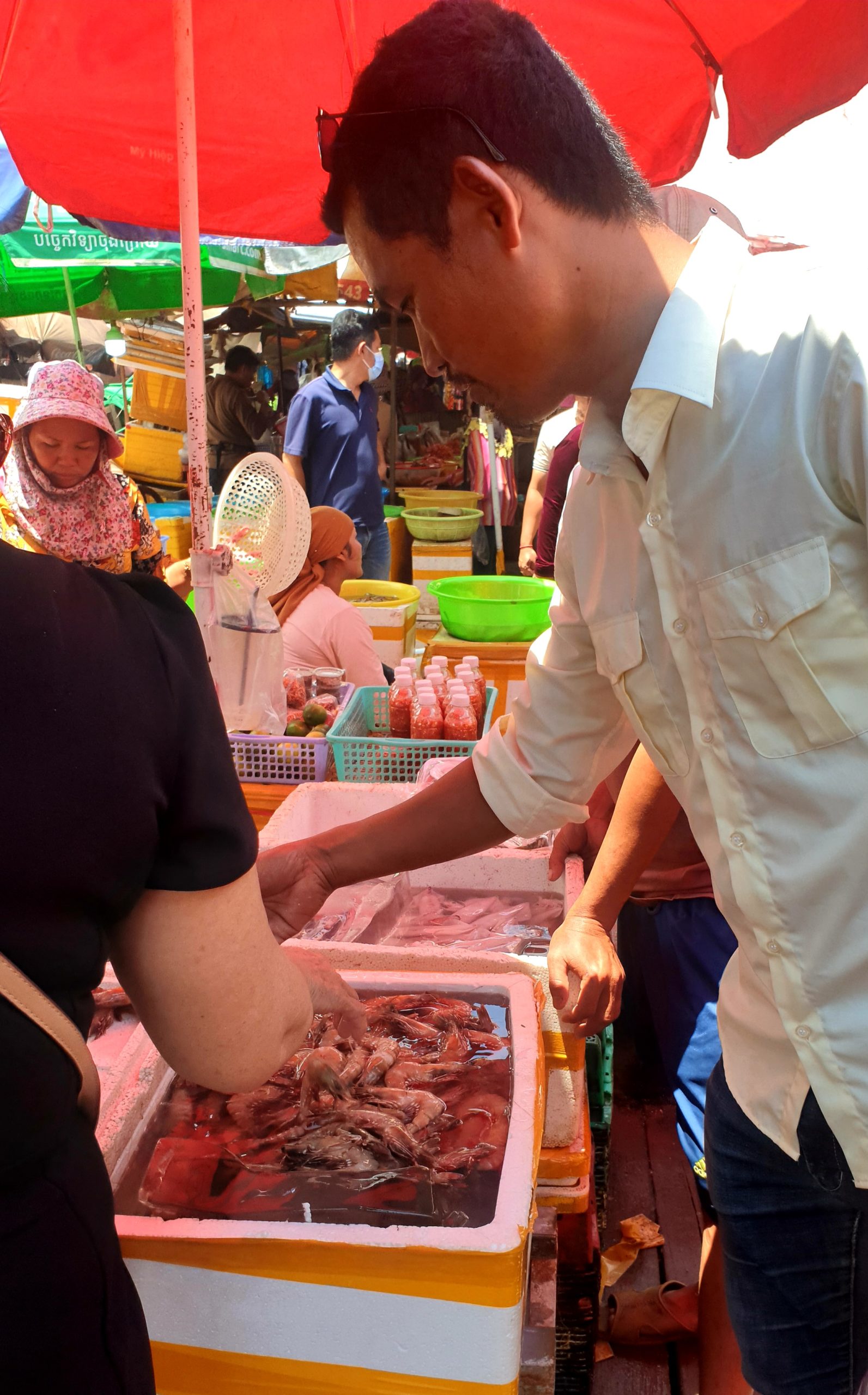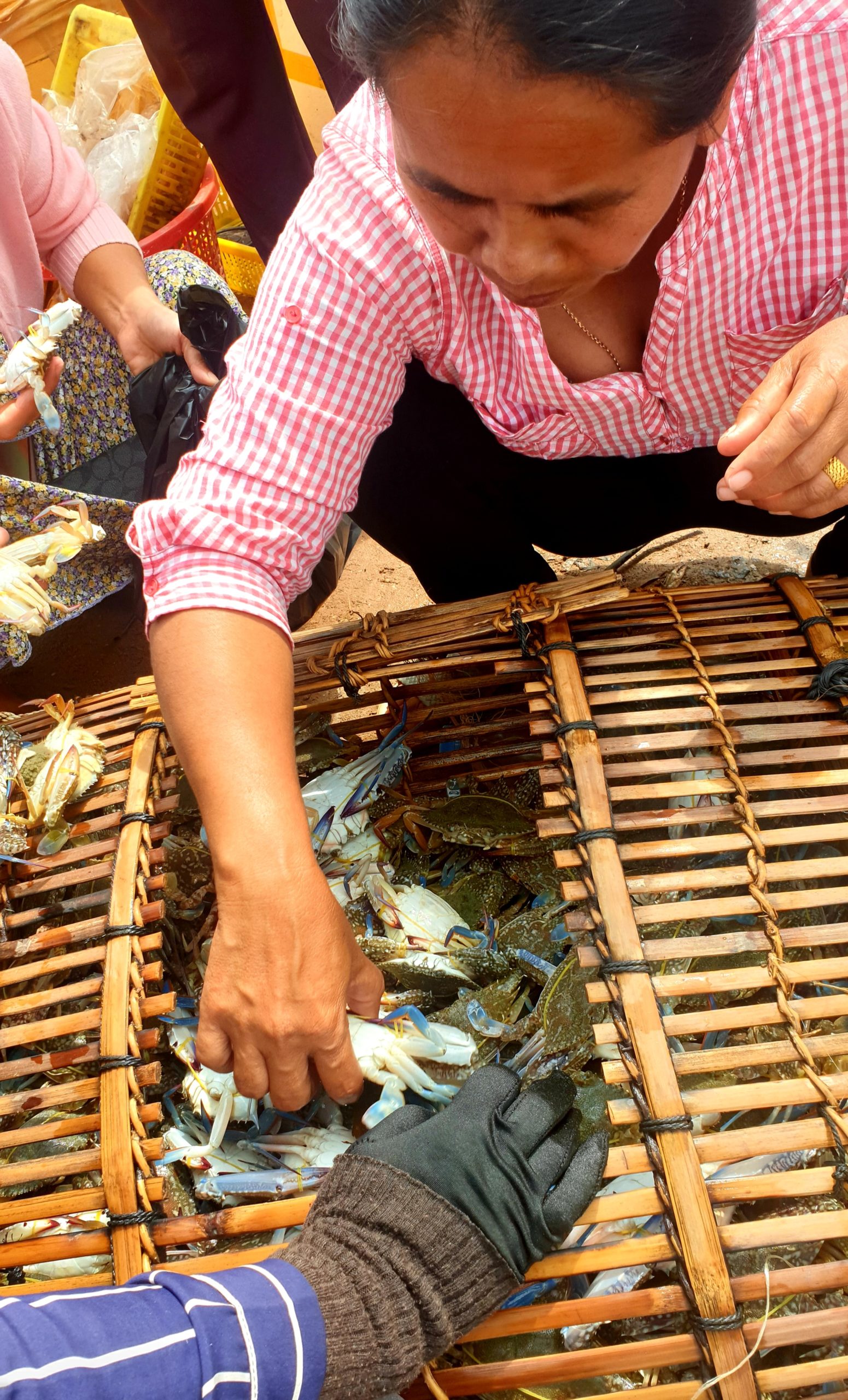 Il est l’heure de manger, nous retournons au marché car nous voulons absolument goûter ce fameux crabe au poivre vert de Kampot !
