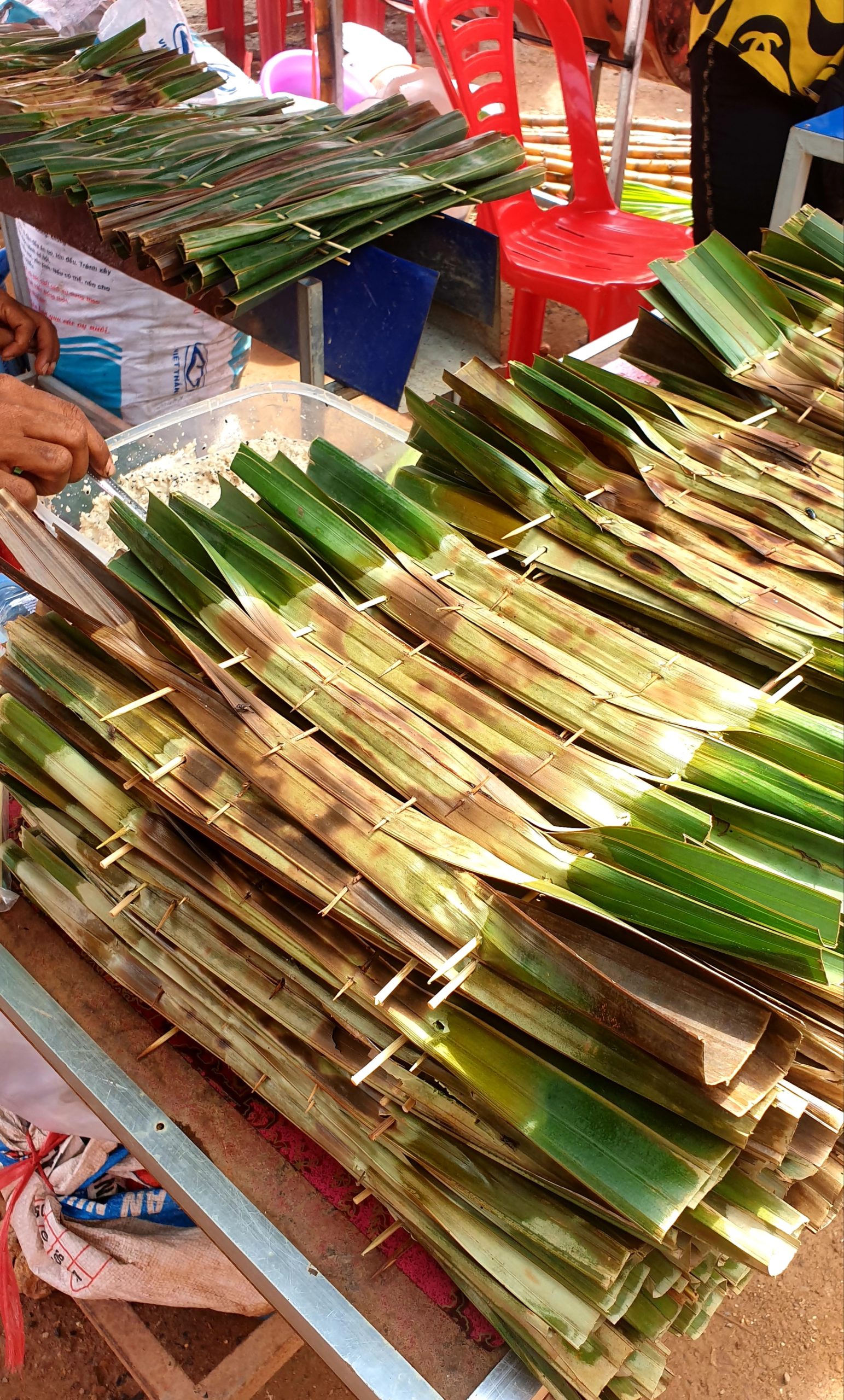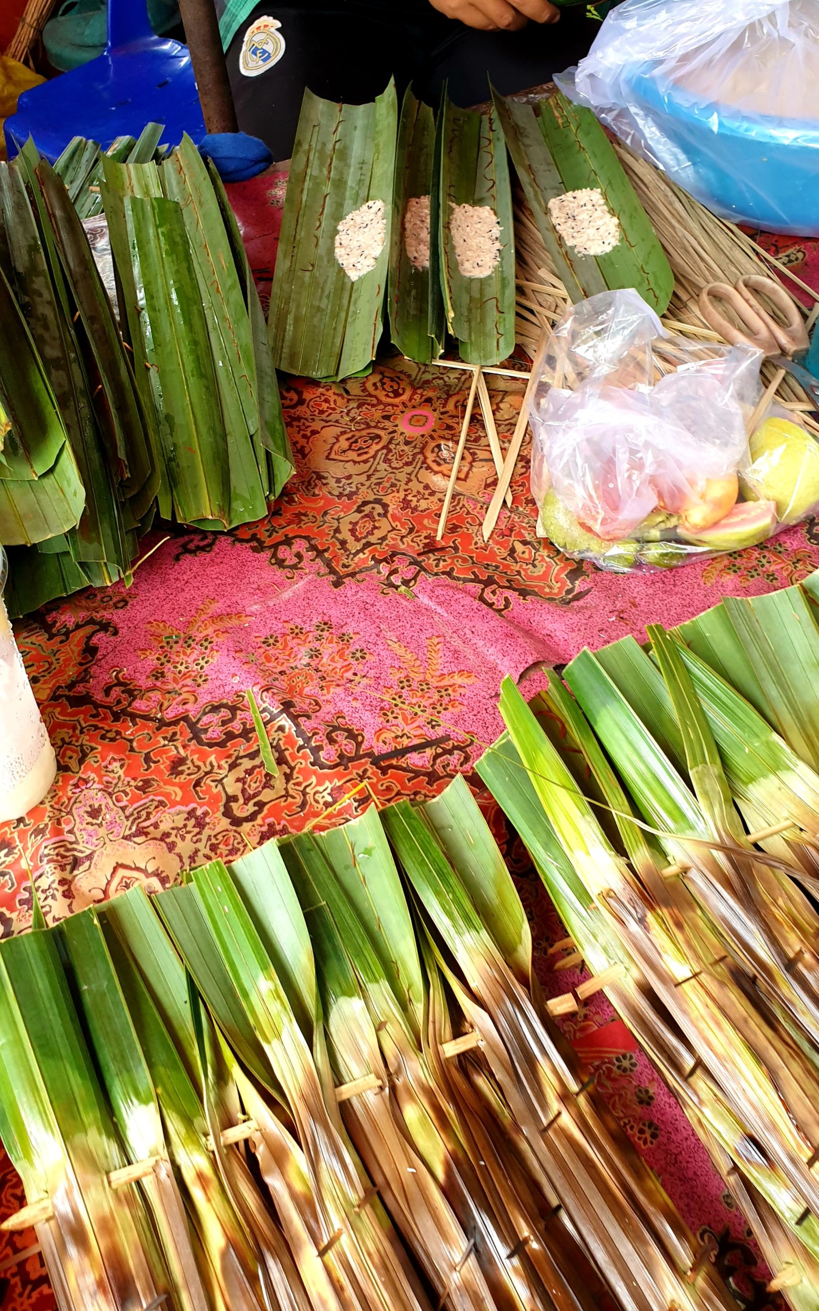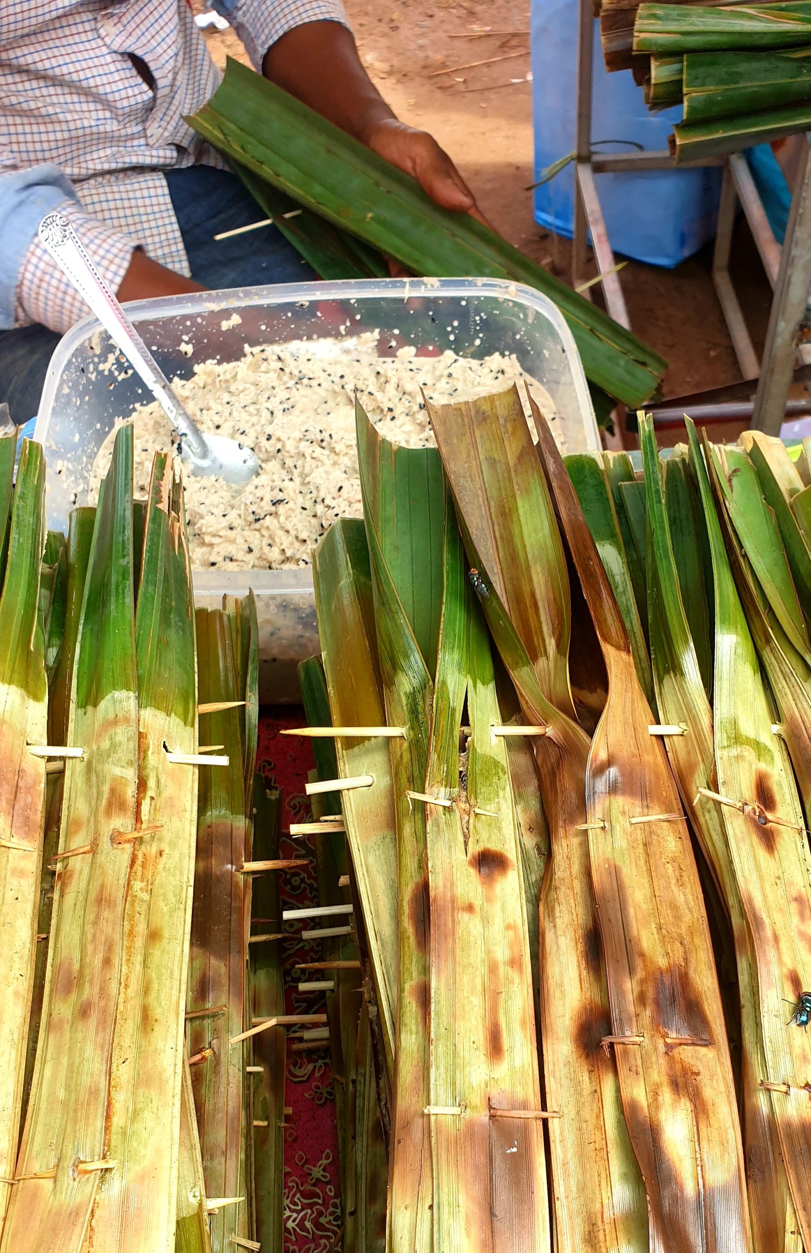 Brochettes de feuilles de bananier avec de la chair de crabe et de la coco