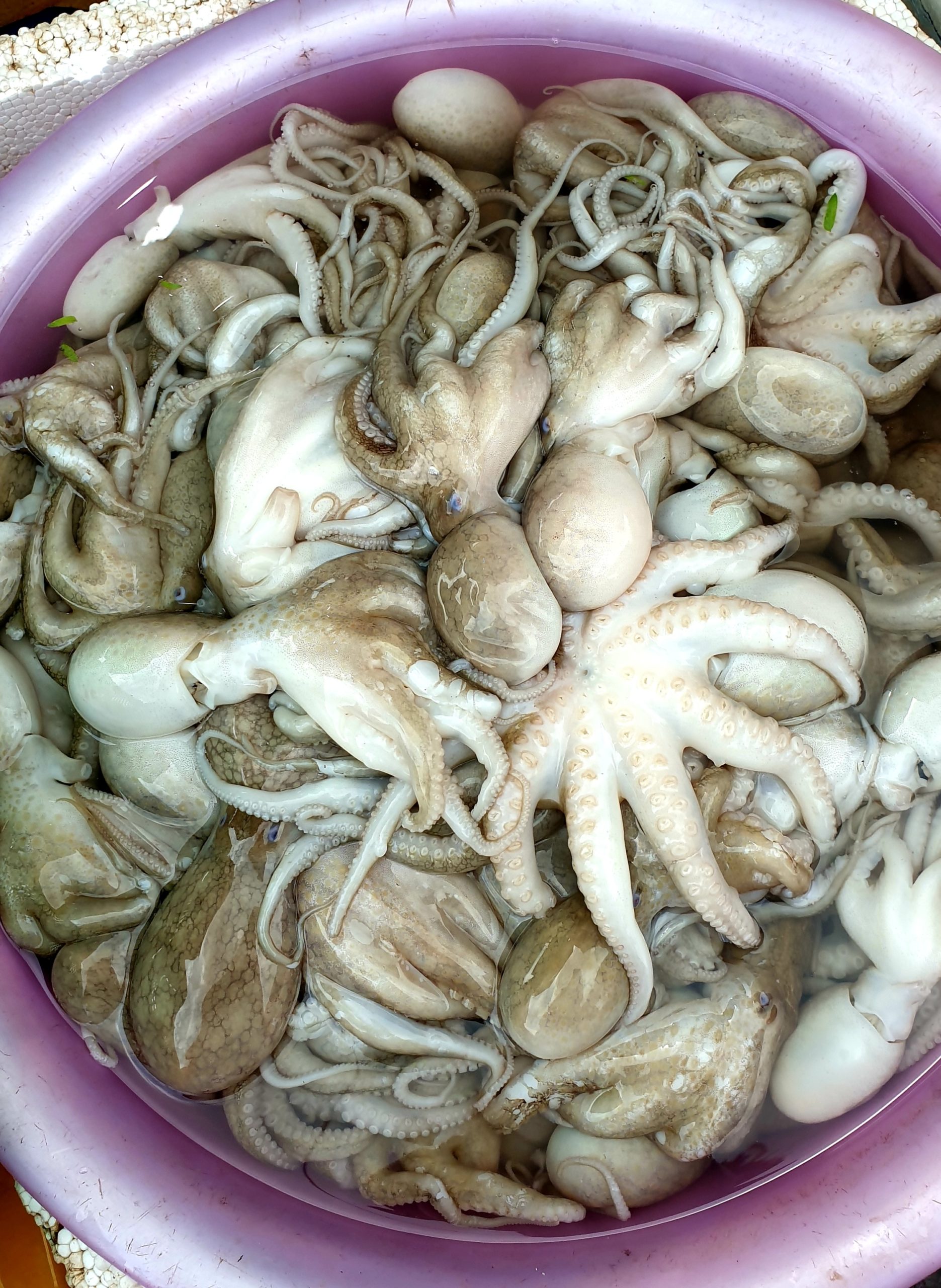 Il y a de la cuisine faite sur place, de la fumée partout, des réchauds au feu de bois, et nous sommes sous des parasols ou des bâches…je ne vous raconte pas la chaleur qu’il fait ici ! Mon téléphone décide de faire grève et ne veut plus prendre de photos tellement il est bouillant, alors qu’il est juste 10h00 du matin. Heureusement, de temps en temps, un air frais de la mer vient nous rafraîchir…mais nous sommes dégoulinants ! Malgré cela, ce marché est génial et nous sommes ravis de pouvoir l’explorer ainsi.