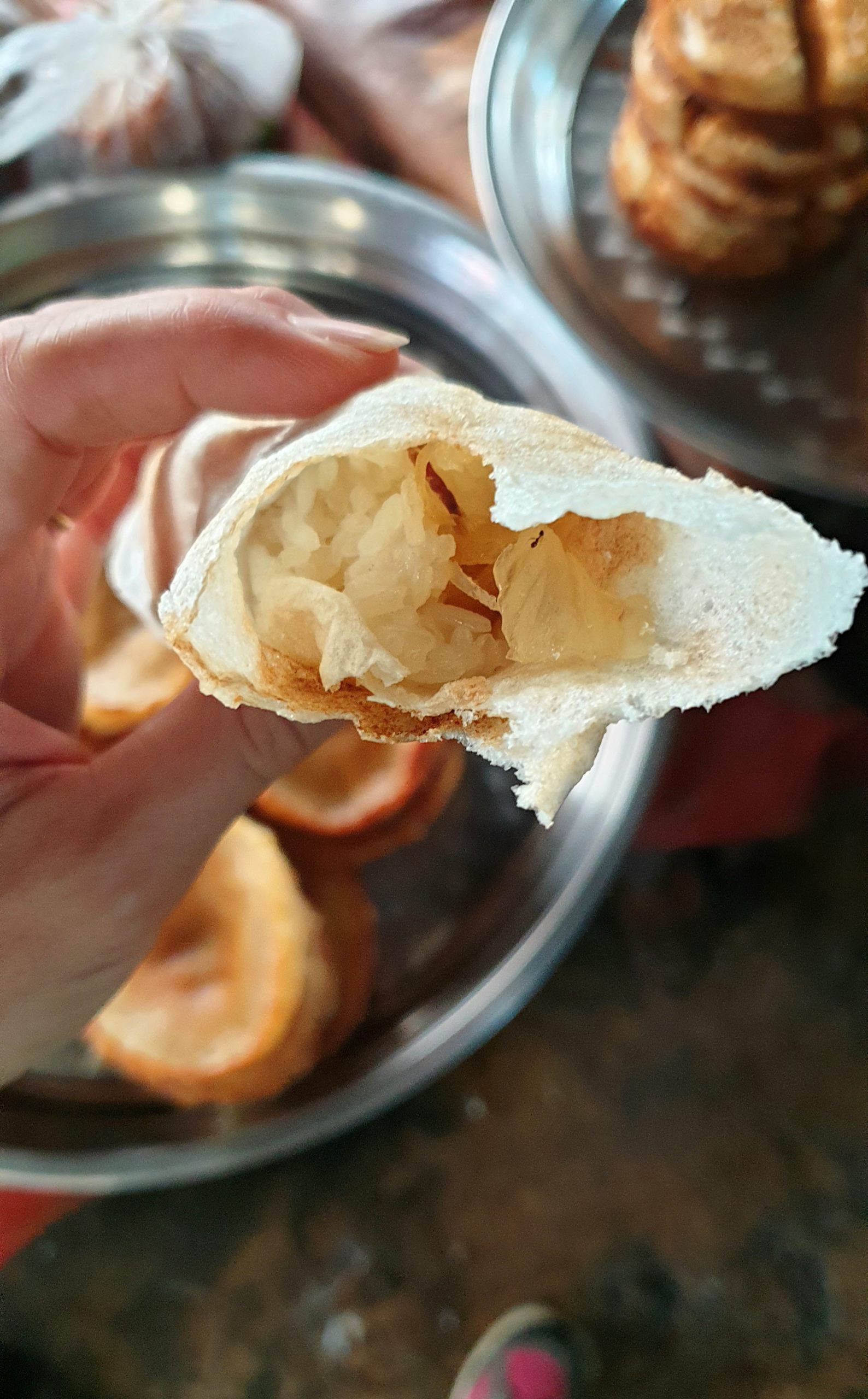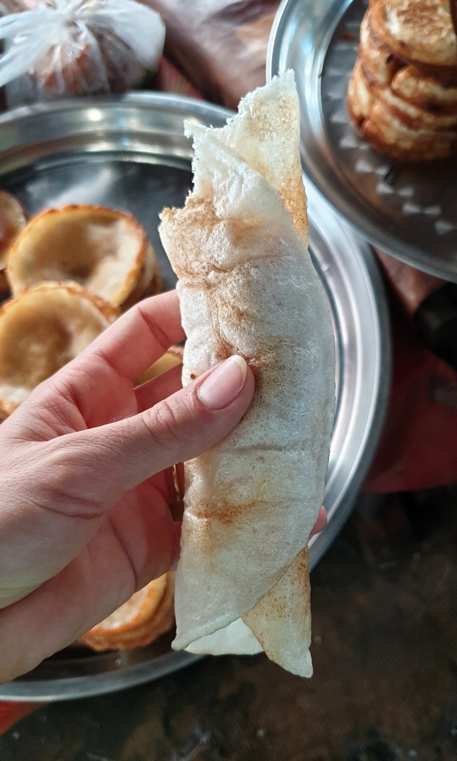 Sas’ m’offre une crêpe de riz fourrée de riz au sucre de canne et à la coco…une tuerie !