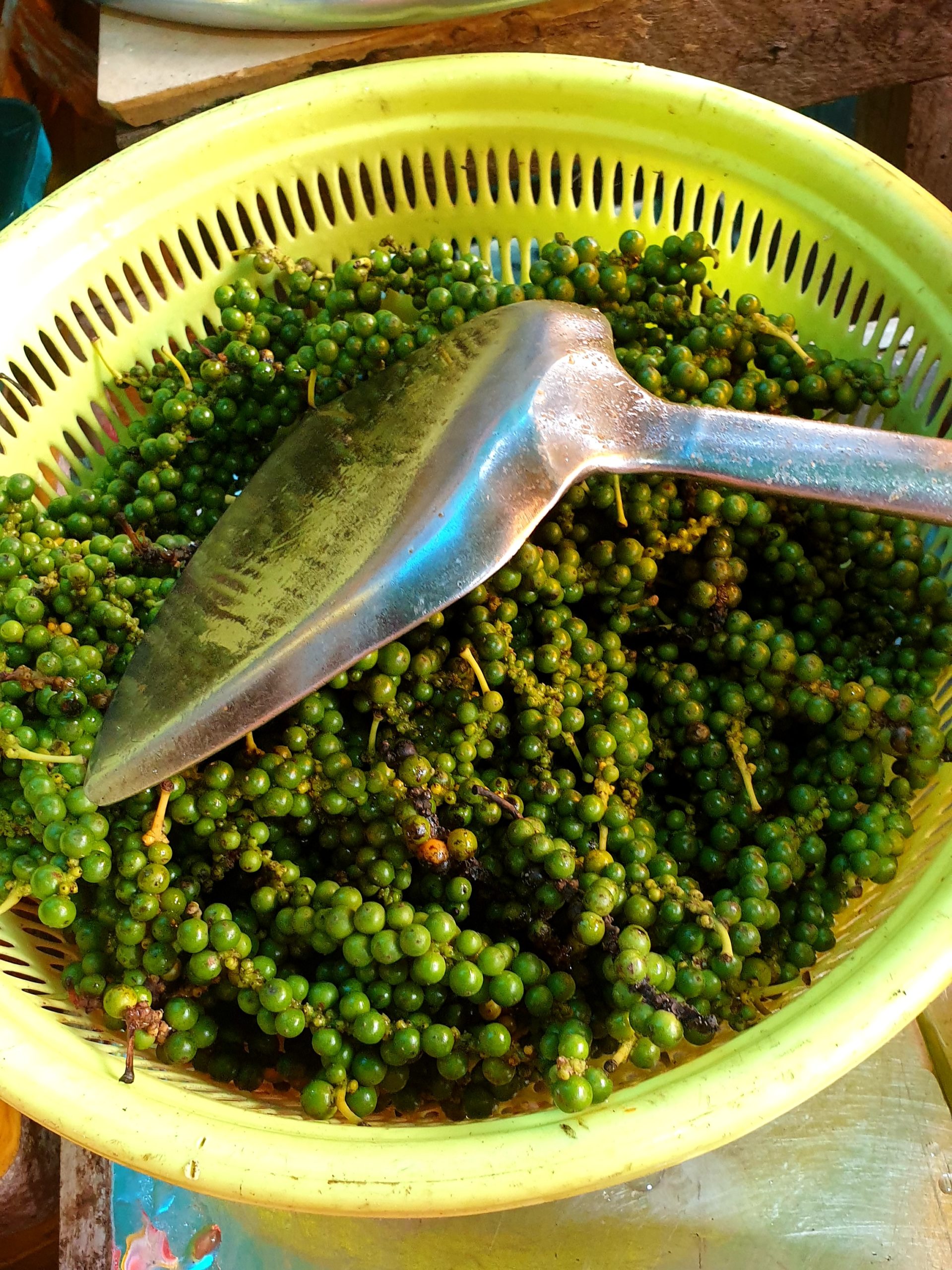 Des épices, du poivre vert (le frais qu’on ne trouve qu’ici), des petits oignons nouveaux, quelques minutes à l’étouffée sur le feu et le tour est joué !