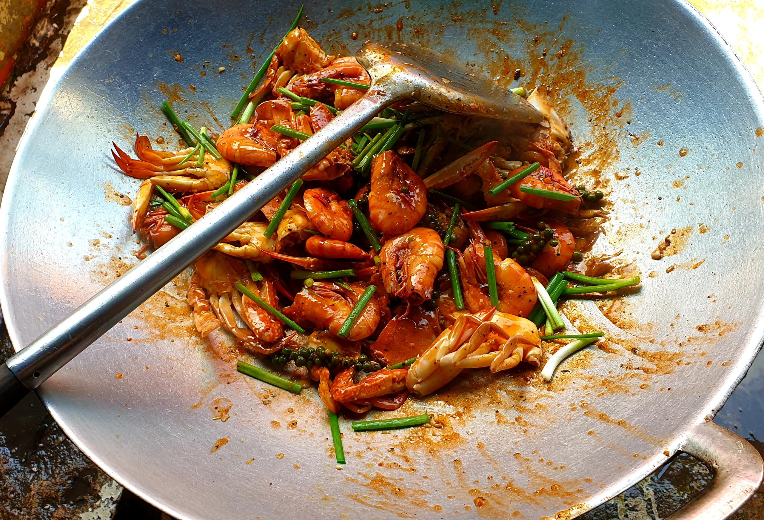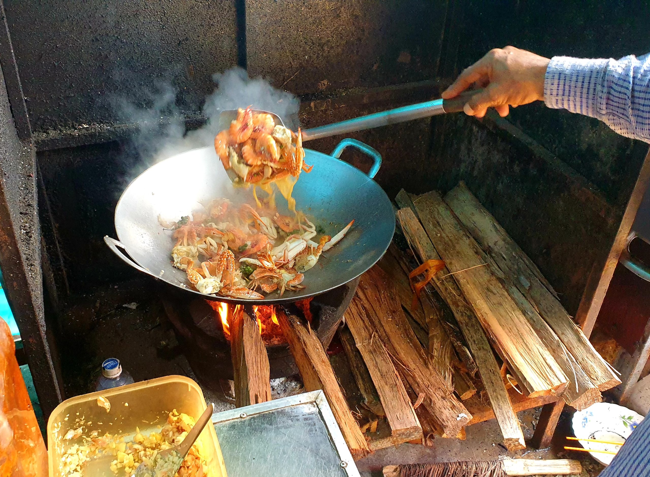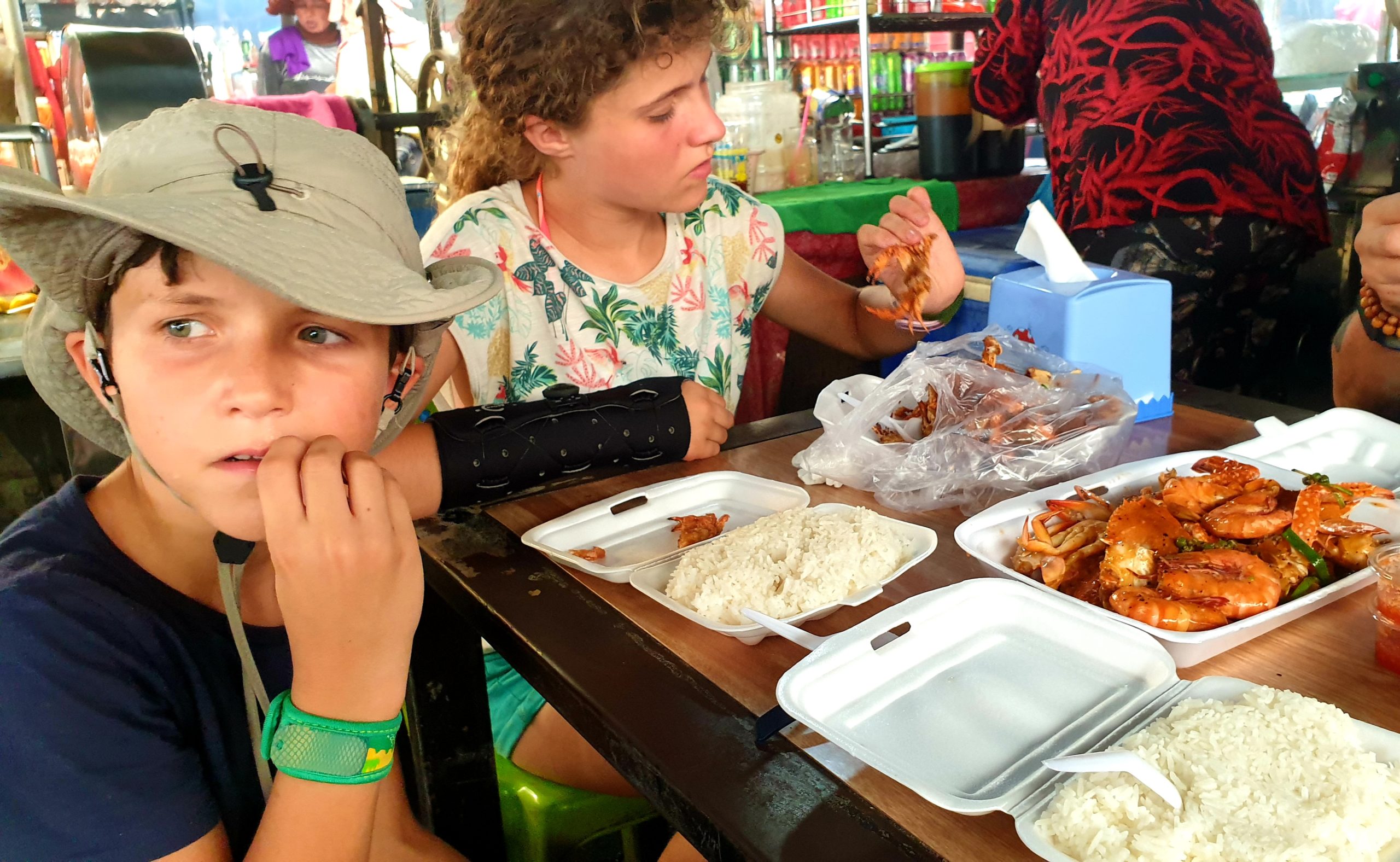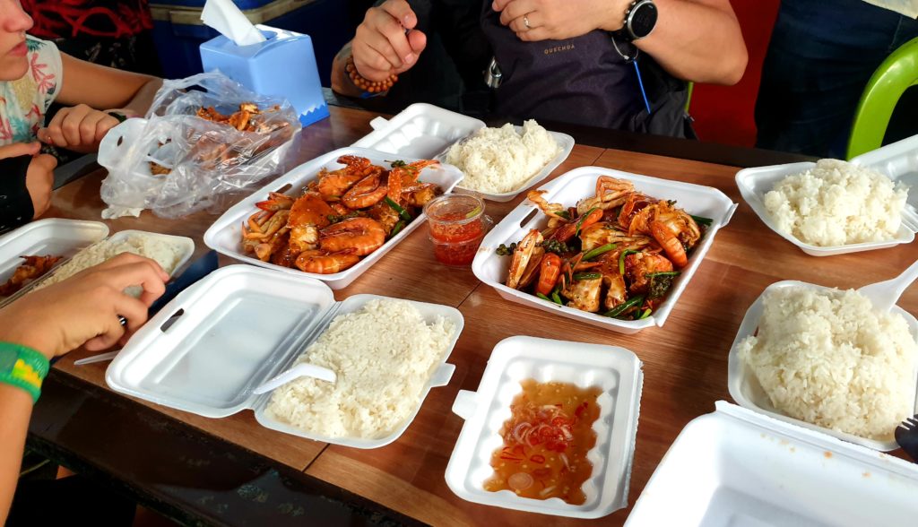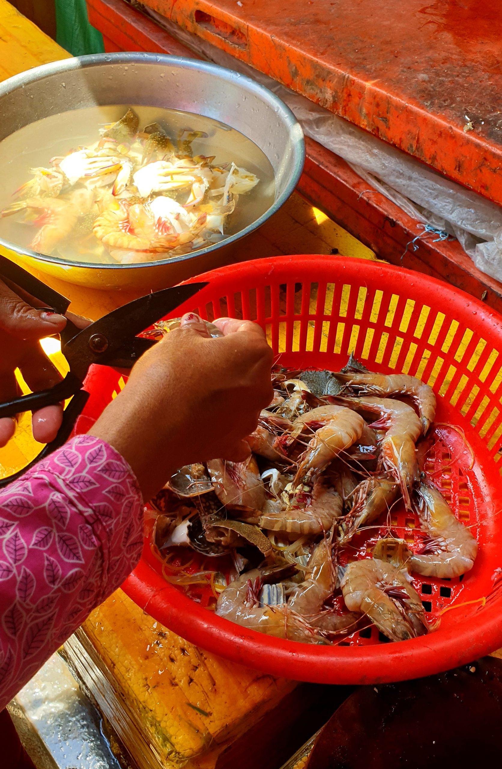 Il faut d’abord choisir ses crabes vivants et négocier le prix. C’est Sas’ qui s’en charge pour nous. Il nous choisit également quelques crevettes. Nous les portons ensuite à des personnes un peu plus loin qui, pour 3 dollars, se chargent de tout cuisiner pour nous.