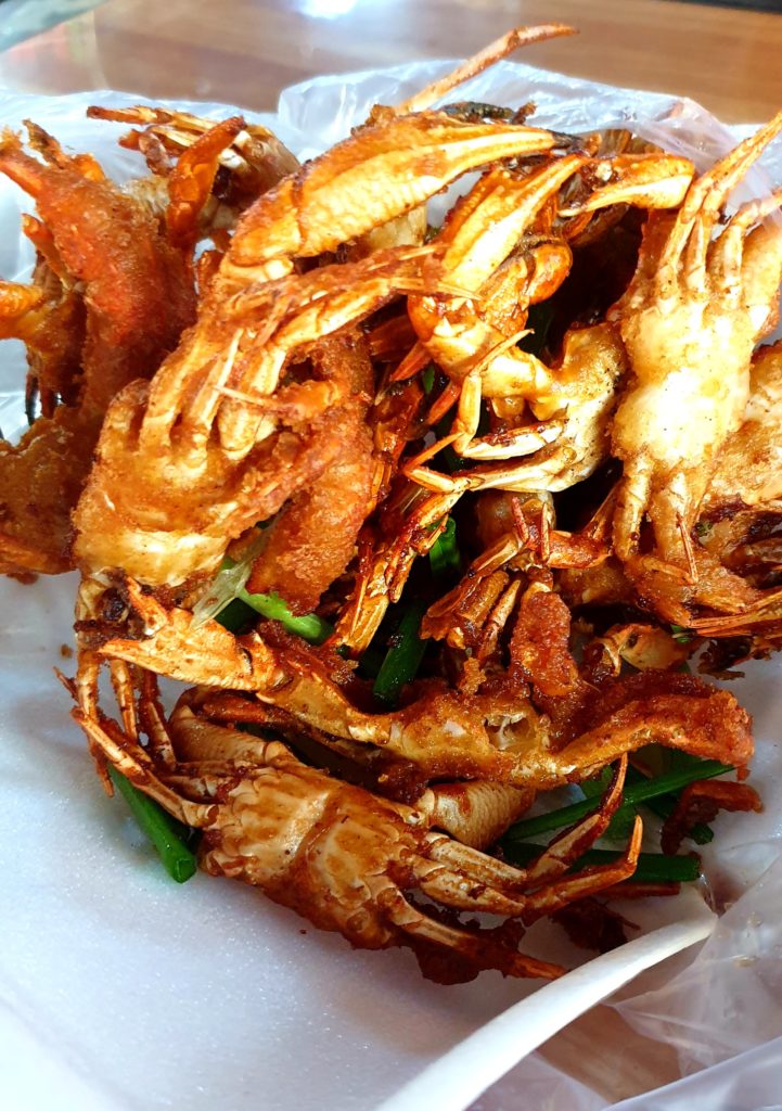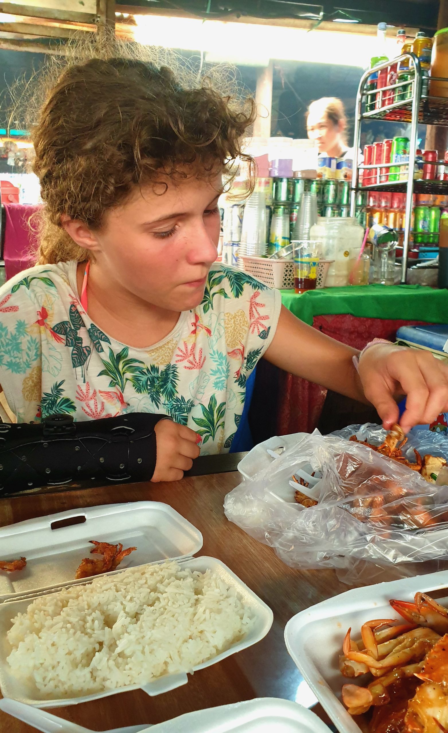 Nous achetons quelques mini-crabes frits (juste enrobés de chapelure et frits) que l’on mange entièrement, sans les éplucher : une tuerie !! Emma, qui n’aime pas particulièrement le crabe, ne s’arrête plus d’en manger ! Elle culpabilise la pauvre, de manger pour une fois ces animaux qu’elle a vus vivants peu de temps auparavant… Pour une fois qu’elle en mange, ma pauvre choupette, je la rassure comme je peux pour qu’elle déculpabilise.