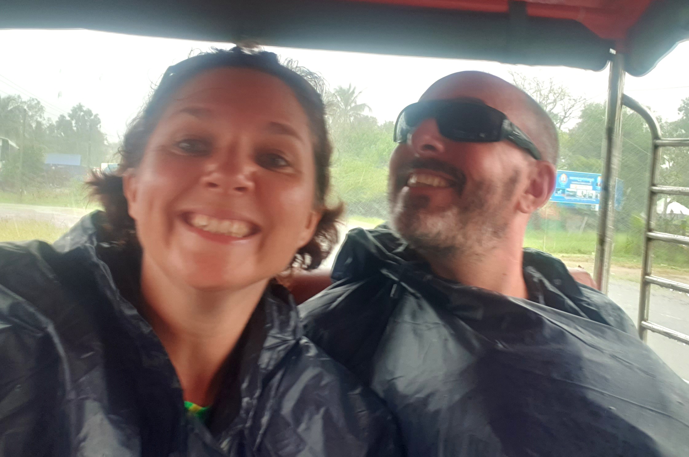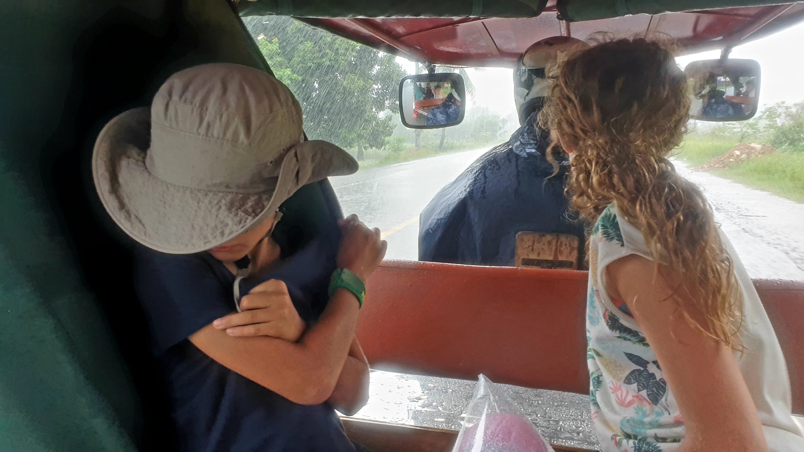 Nous sommes tellement fumés que nos vêtements sentent très très forts, mais ce n’est pas grave, ça en valait vraiment la peine. Nous rentrons à l’hôtel sous un orage de mousson incroyable ! Nous enfilons nos ponchos, les enfants préfèrent profiter de la pluie et rient d’être trempés jusqu’aux os. Sas’ est extrêmement prudent et roule tout doucement.