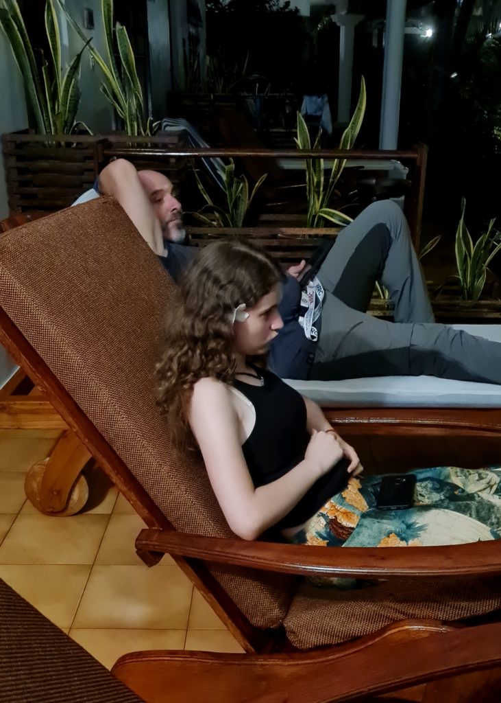 Notre chambre familiale est face à l’océan, avec une terrasse, tout semble parfait ! En y entrant, nous ne voyons que 3 lits…nous rappelons que nous sommes 4, la femme qui nous a accueillis s’excuse mais si on veut un 4ème lit, ça ne pourra être qu’un matelas au sol, vu la place qui reste, à payer en supplément. Soit…de tout façon, les enfants sont trop grands maintenant pour dormir tête bêche sur un lit 1 place…
