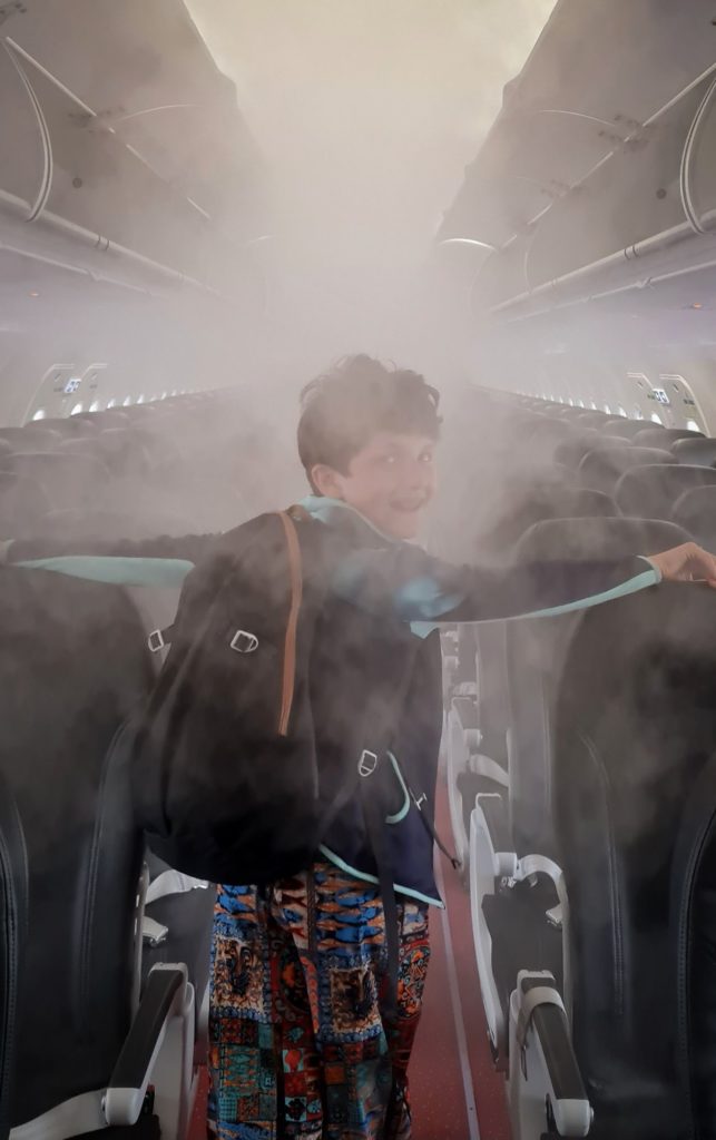 Nous sommes accueillis par des militaires sur le tarmac. Ce sont eux qui nous font monter dans l’avion. Nous sommes les 1ers à y entrer…l’air est en train d’être humidifié pour contrecarrer la sécheresse de l’air conditionné ! C’est étrange toute cette brume !!