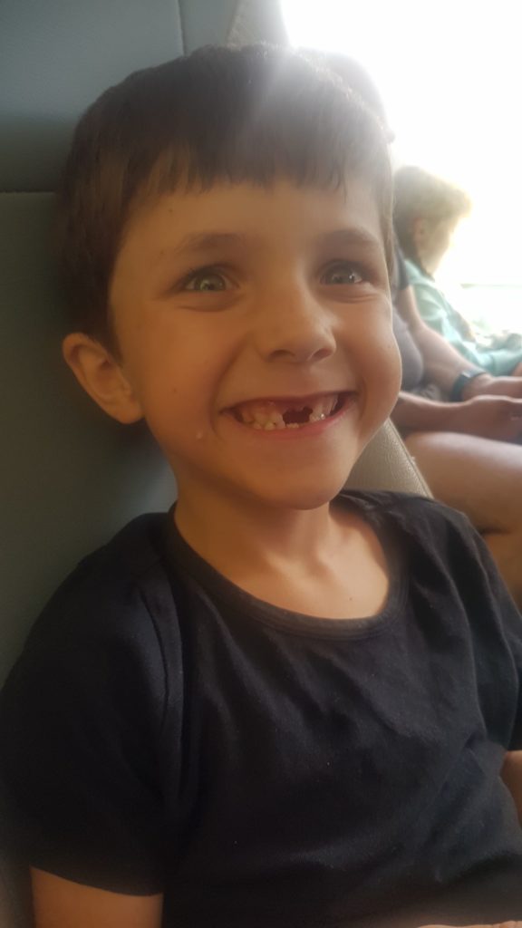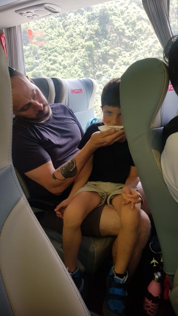 Sacha, qui a perdu une dent juste avant notre départ pour la Chine, en a une 2ème qui bouge et qui le gène terriblement… Il n’arrive plus à manger et décide alors de la faire tomber en forçant un peu le destin ! C’est donc sur la route, dans le bus, au milieu de tout le monde qui l’encourage, qu’il s’arrache sa dent !!! Bravo mon loulou !