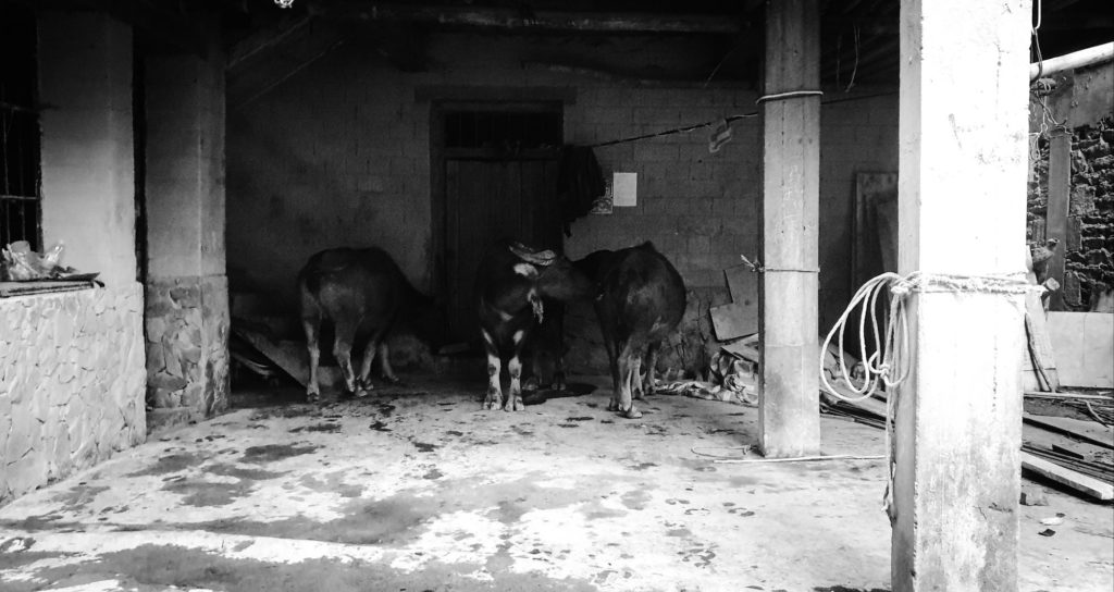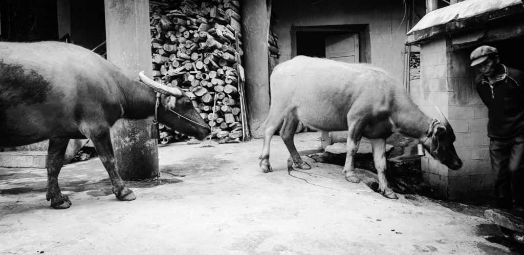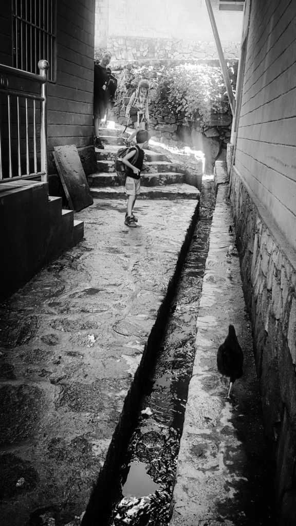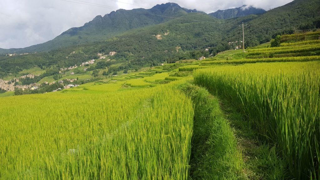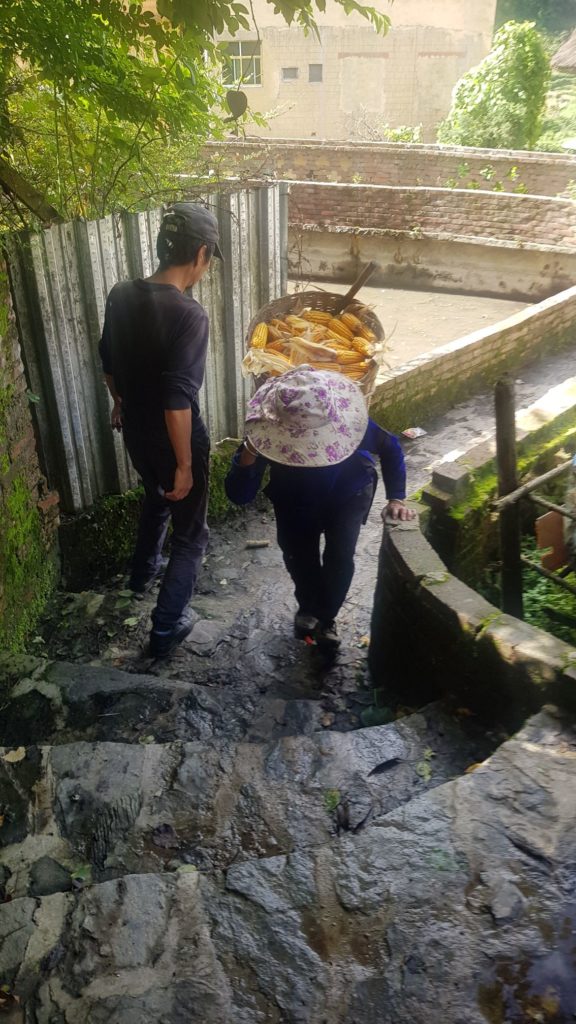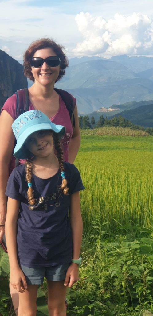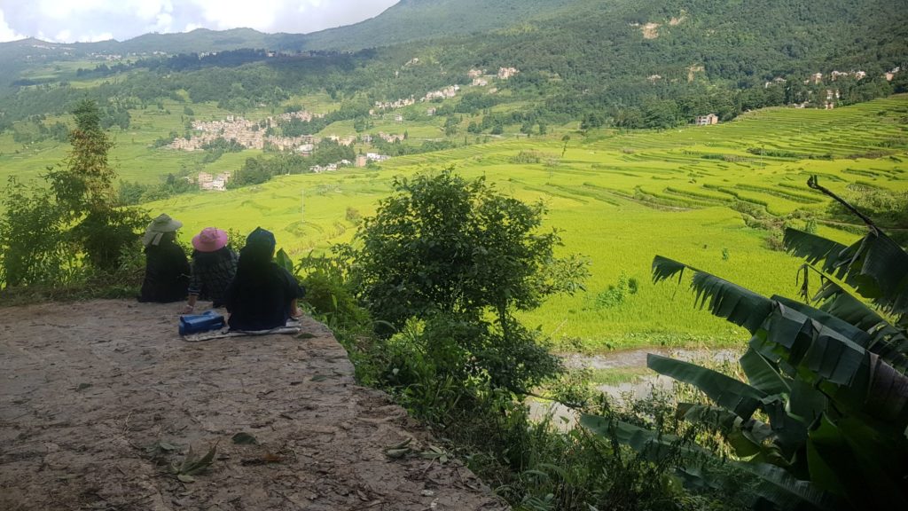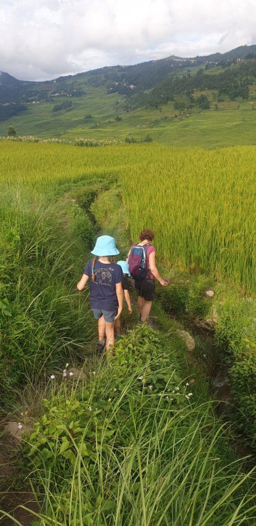 Nous traversons le village. Il s’agit ici d’un petit village de montagne avec ses poules et ses cochons dans les rues, et traversé de part en part de dizaines de canaux où coule l’eau en petits torrents, directement venue de la montagne. Les gens que nous croisons, la minorité Hani, ne semblent pas parler le mandarin. 3 dames nous interpellent en voyant les enfants mais nous ne comprenons rien à ce qu’elles disent…