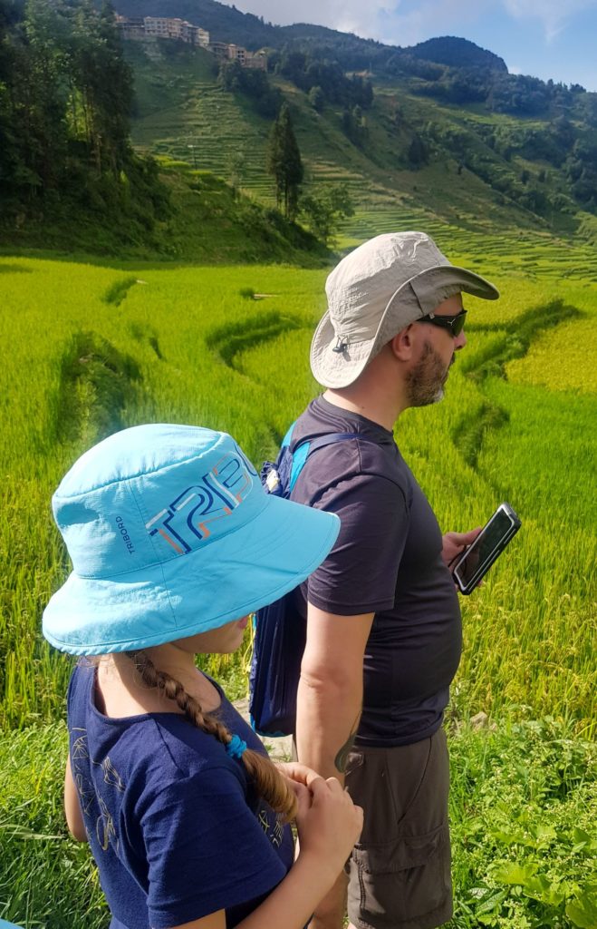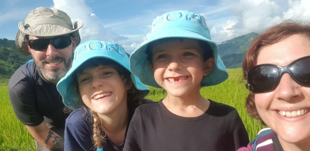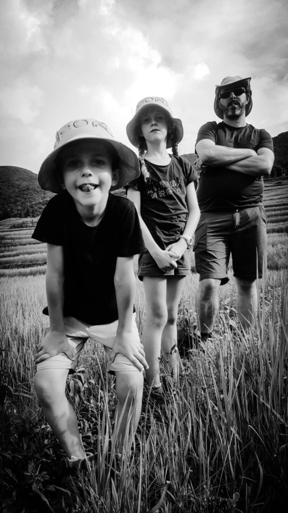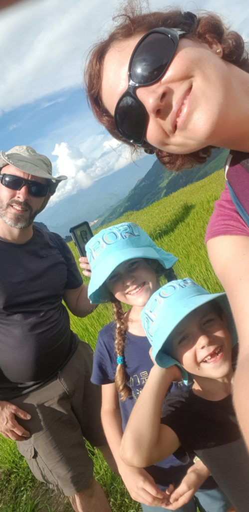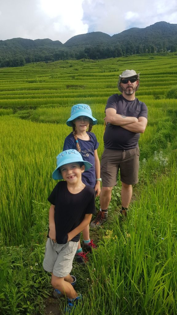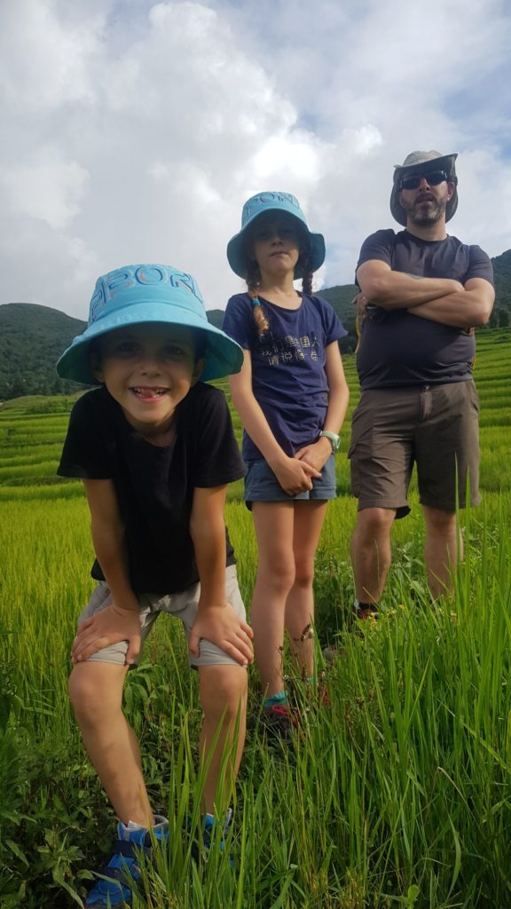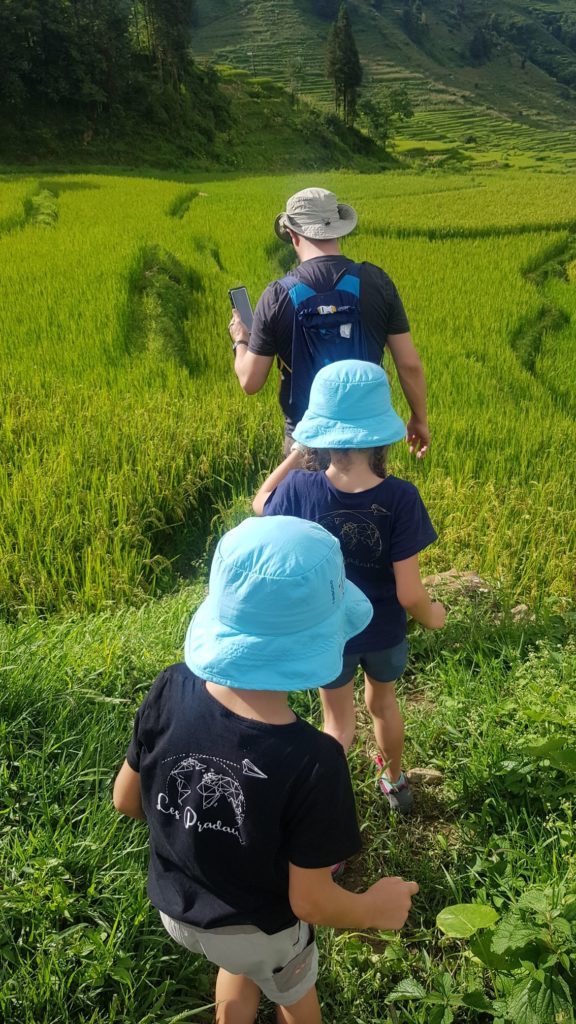 En remontant vers le village, nous tombons nez à nez au milieu des rizières sur Laurent, Coralie et leurs 2 filles pour découvrir que nos guesthouses sont collées l’une à l’autre !! Nous décidons de nous retrouver dans leur auberge pour dîner ensemble ; les enfants, qui s’entendent très bien sont ravis.