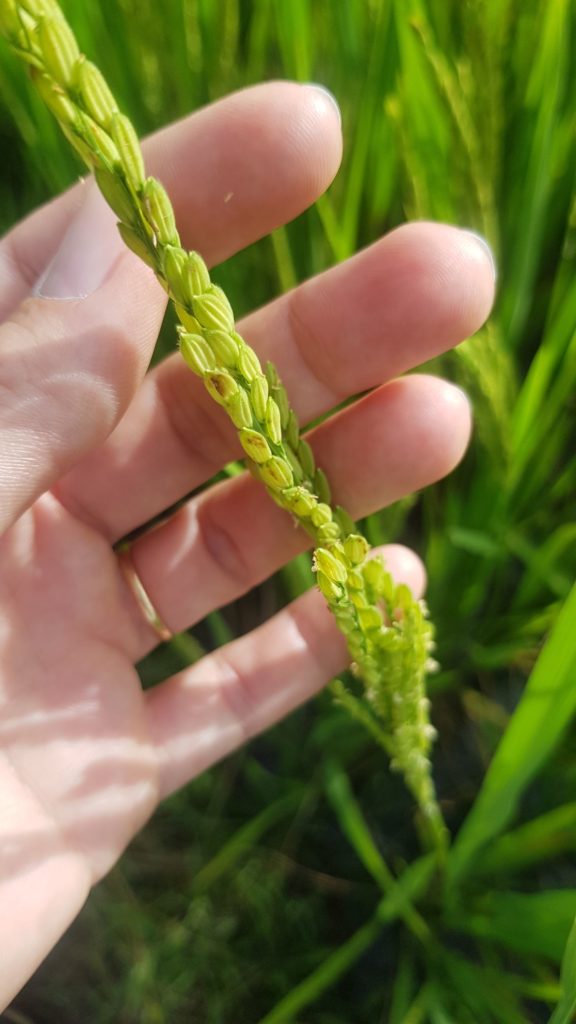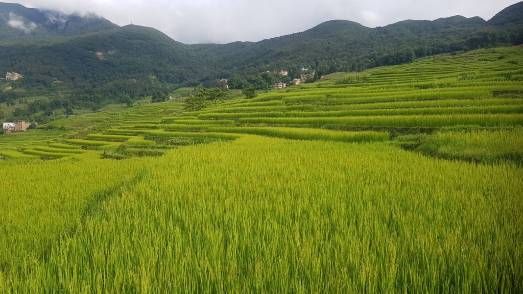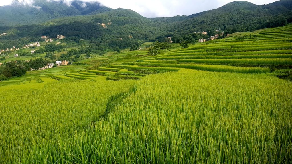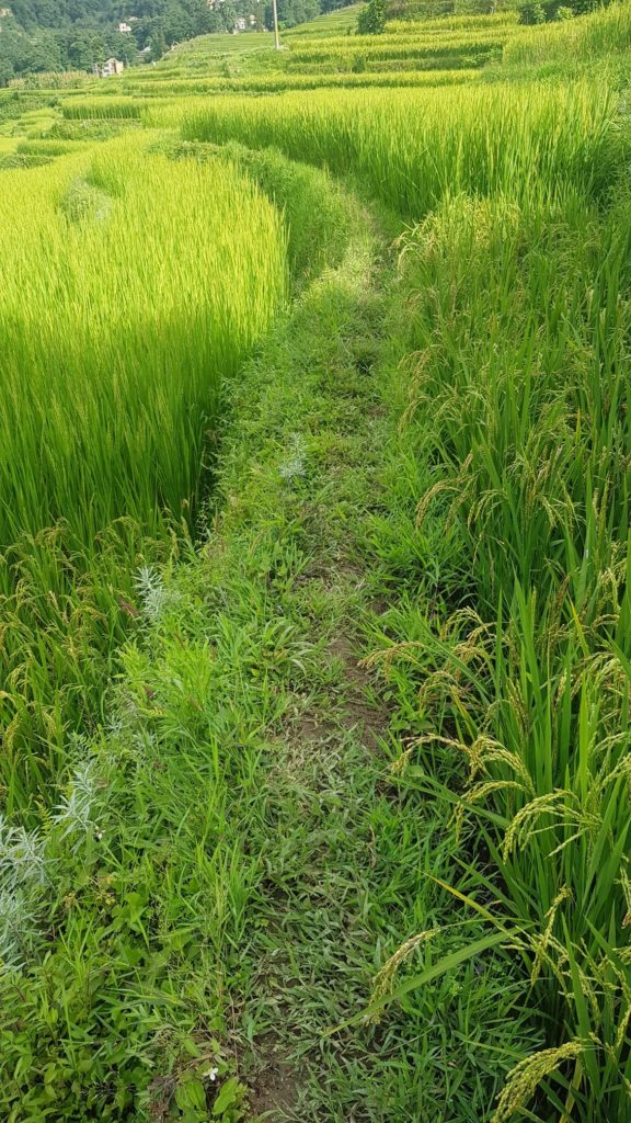 Nous arrivons enfin dans les rizières et là, quel spectacle !! C’est époustouflant !… Le soleil a pointé le bout de son nez (ce qui n’est pas des plus fréquent ici à cette époque), les rizières sont recouvertes de riz d’un vert tendre, c’est tout simplement magique. J’ai l’impression de rêver éveillée !!
