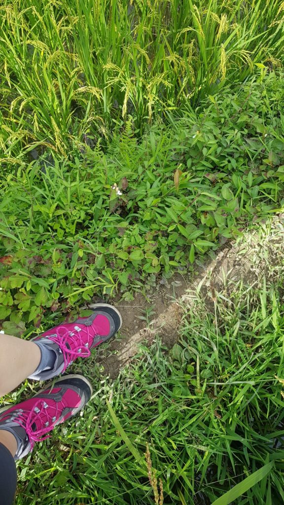 Nous partons à pied déambuler sur les petits sentiers qui forment les limites des parcelles. Sacha comprend alors que nous allons marcher sur des chemins bordés d’eau ne dépassant pas 50 cm de large et, pour lui, c’est la panique ! Un peu stressé, mais du coup concentré, il fait très attention et ce n’est pas lui qui mettra finalement un pied dans l’eau !…