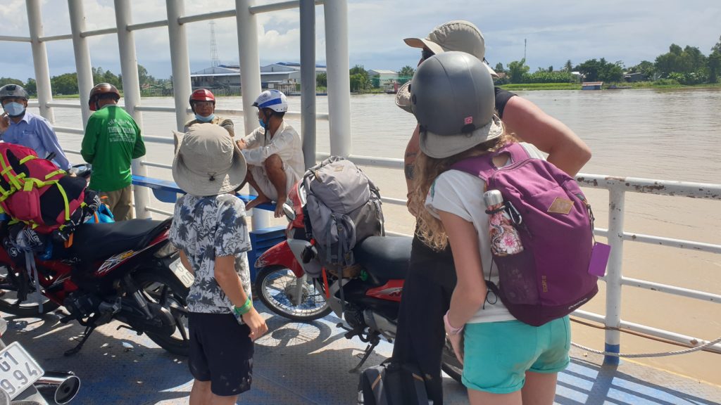 Ça y est, tout est bon, nous allons pouvoir y aller. Sauf qu’à partir d’ici, il faut qu’on rejoigne une ville à 30 km d’ici pour prendre un bus qui devrait nous conduire à notre 1ère destination, sur le delta du Mekong. Il n’y a pas un chat pas un taxi, rien ! 3 retraités un peu routards (anciens douaniers ?) nous proposent de nous y conduire sur leurs motos. Le tarif est un peu cher mais… avons-nous vraiment le choix ?!