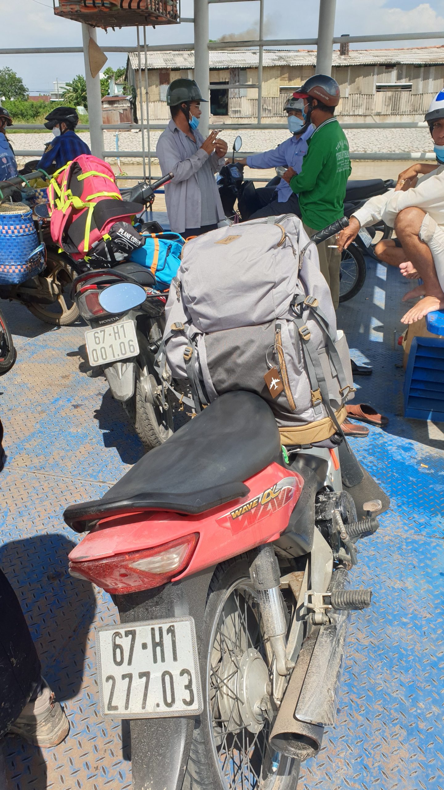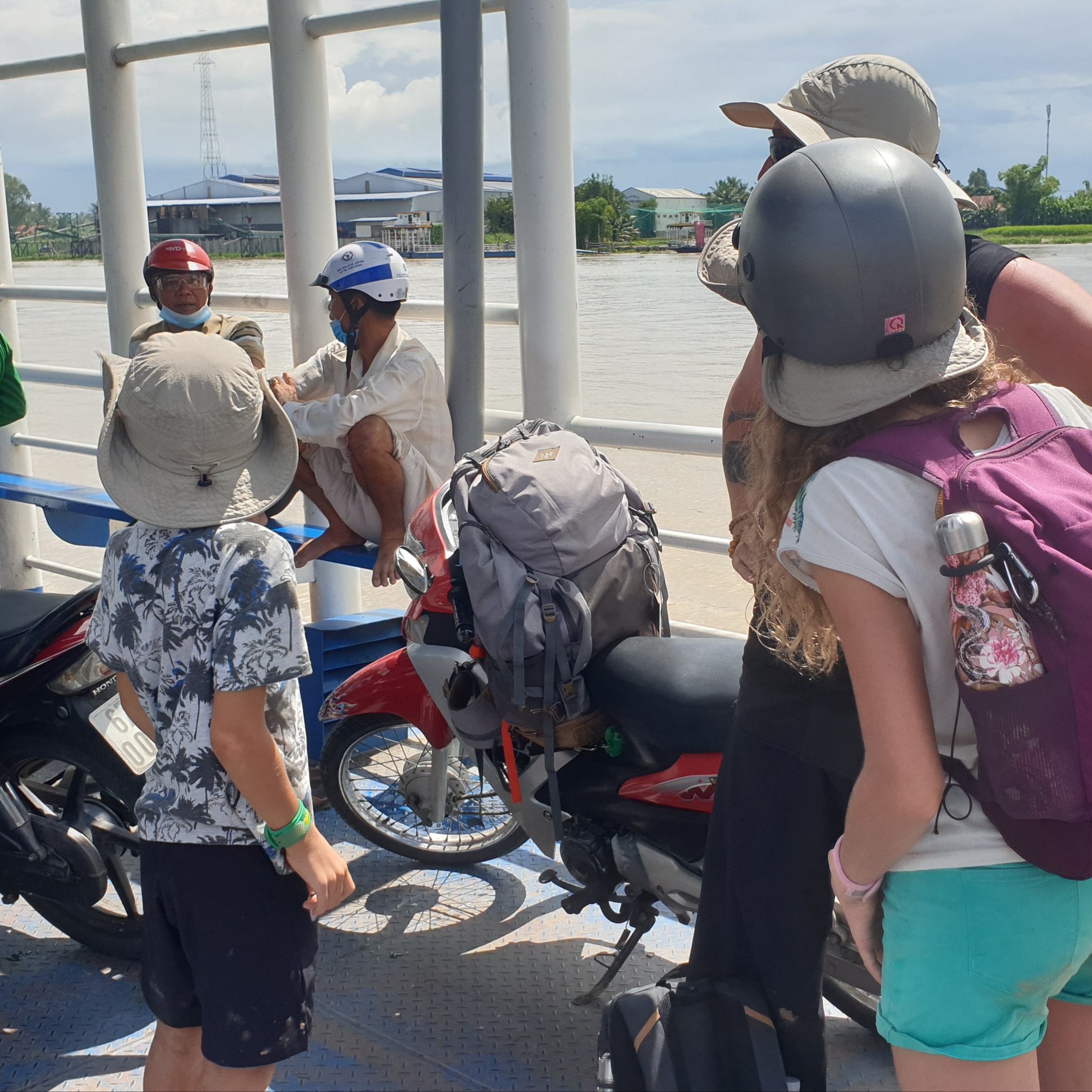 C’est parti, ils embarquent nos sacs devant eux, Emma monte sur une moto, Éric sur une autre et Sacha et moi sur la dernière. Ils conduisent très bien, malgré les règles de circulation locales ! La pluie se met à tomber, nous ne sommes pas super rassurés, mais ils maîtrisent parfaitement leurs machines. Nous passons le fleuve avec un bac et nous parcourons ainsi les 30 km. Quelle entrée en matière ! De suite, tout est complètement différent, rien à voir avec le Cambodge ! Les gens ont l’air plus riches, tout est plus entretenu.