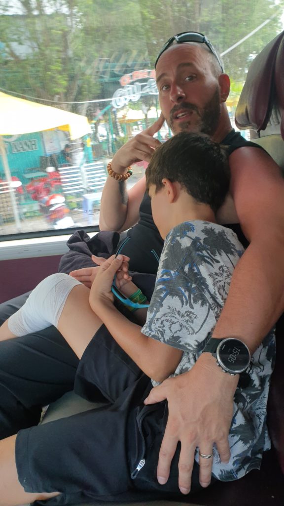 Rentrés tard à notre hôtel, Éric contacte Lauren, notre amie urgentiste, pour en savoir plus sur la blessure de Sacha. Brûlure au 2ème degré profond, elle nous donne le protocole de soin. Merci Lauren !! Nous refaisons son pansement.