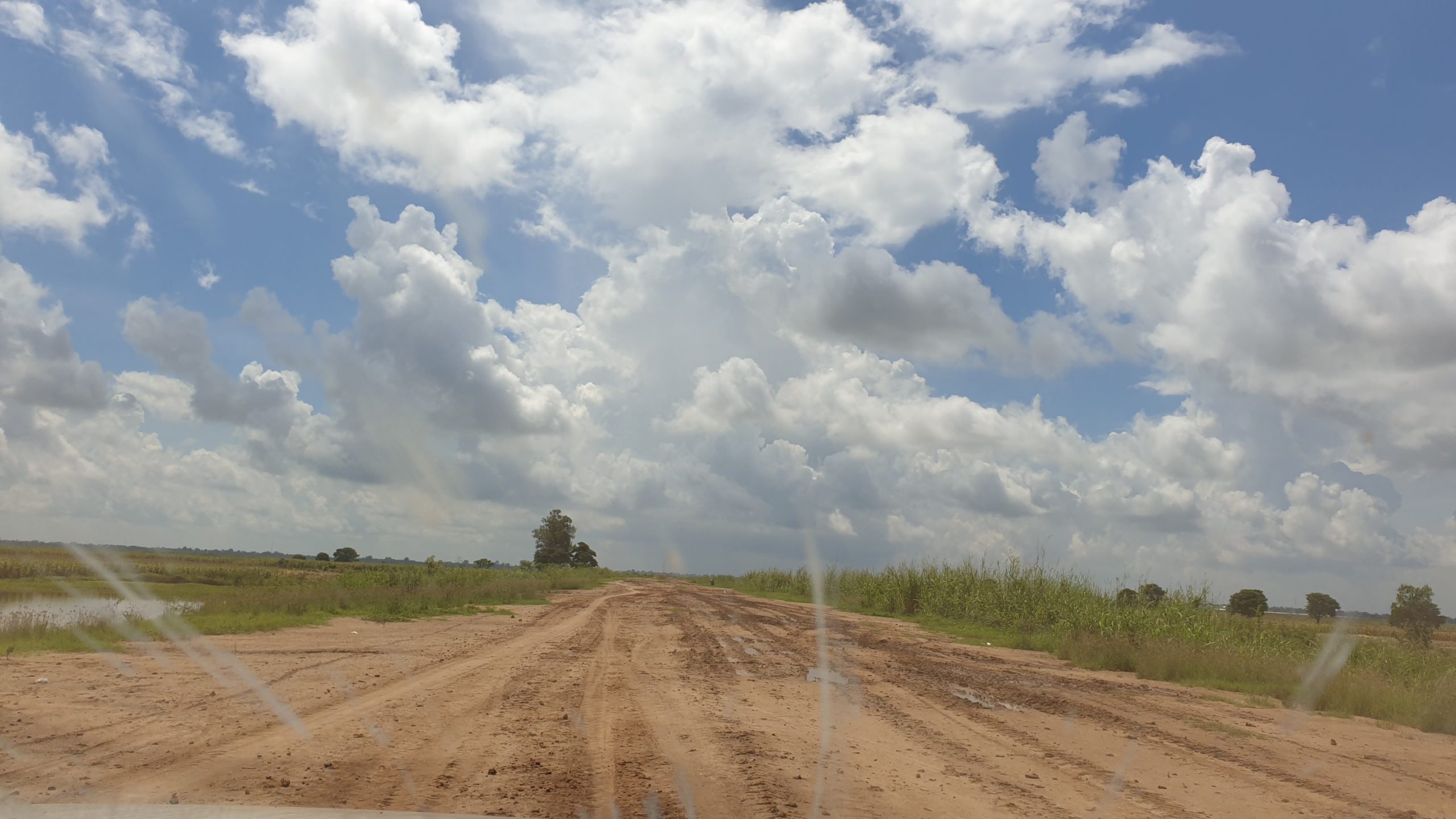 À 10h35, la piste s’arrête tout d’un coup : plus de route. Comment ça, plus de route ?! Il nous restait 10 min de voiture, nous ne sommes plus qu’à 5 km de la frontière ! Des agriculteurs en train de travailler sur le bas côté expliquent que la route a été arrêtée et qu’il faut continuer à pied. C’est une blague ??! Notre chauffeur nous ouvre les portes et nous tend nos sacs…non, ce n’est pas une blague !