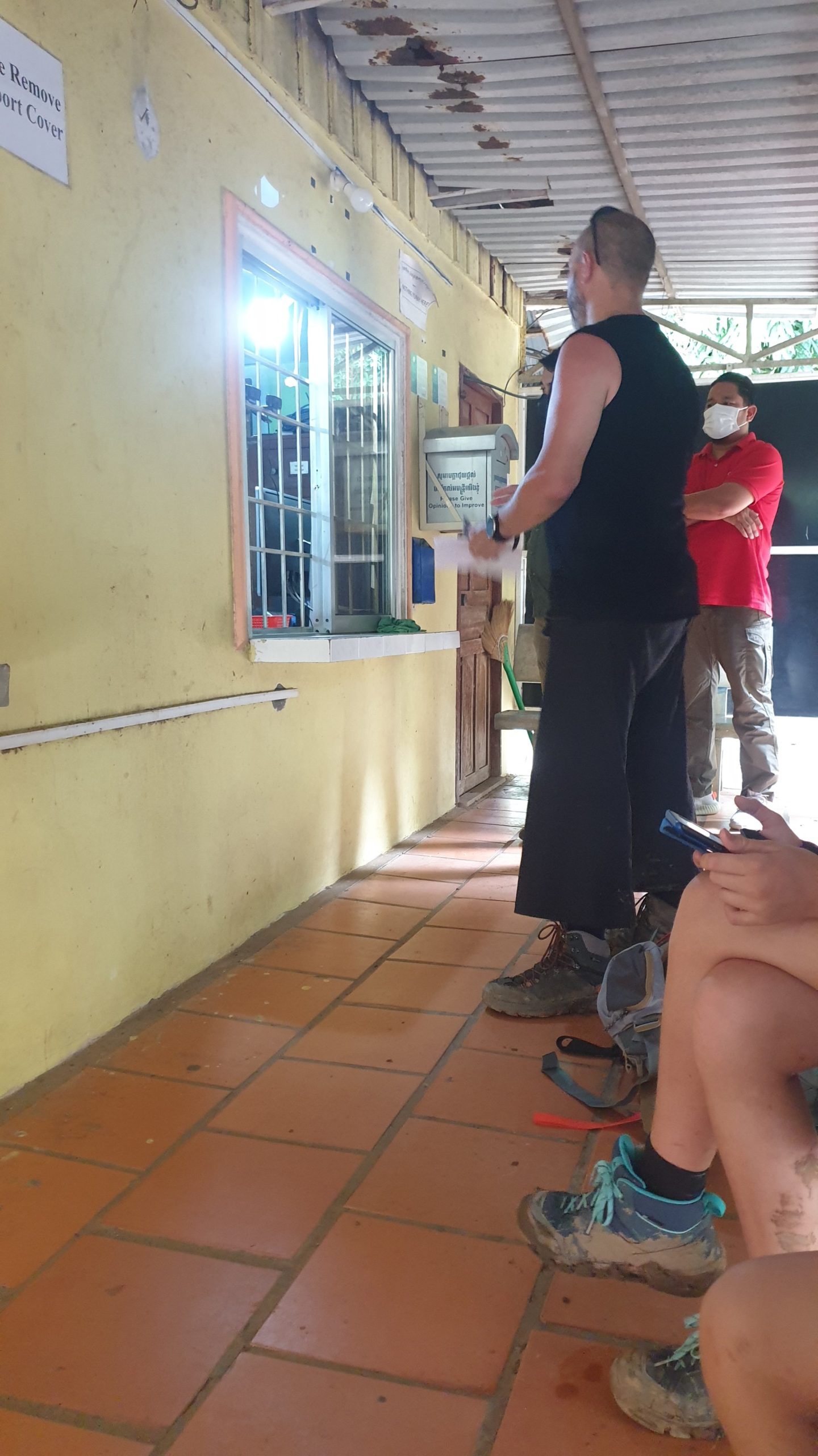 Le poste d’immigration est…comment dire…rural !! Les douaniers sont en train de se balancer dans leurs hamacs, on va les déranger. L’un, petite soixante avec un air gentil, prend nos passeports, l’autre, bedonnant et avec un énorme trousseau de clés accroché à la ceinture, nos visas vietnamiens. Il joue un peu au cow-boy, tourne et retourne nos papiers (peut-être qu’il ne sait pas lire ?) passe des coups de fils, nous montre qu’il est important. Un vrai sketch à lui tout seul ! Finalement, il nous explique dans un anglais approximatif que nous devons aller au Vietnam montrer nos visas afin qu’ils vérifient qu’ils sont valables, puis revenir ici pour pouvoir faire tamponner officiellement nos passeports pour attester de notre sortie du Cambodge. Heu….