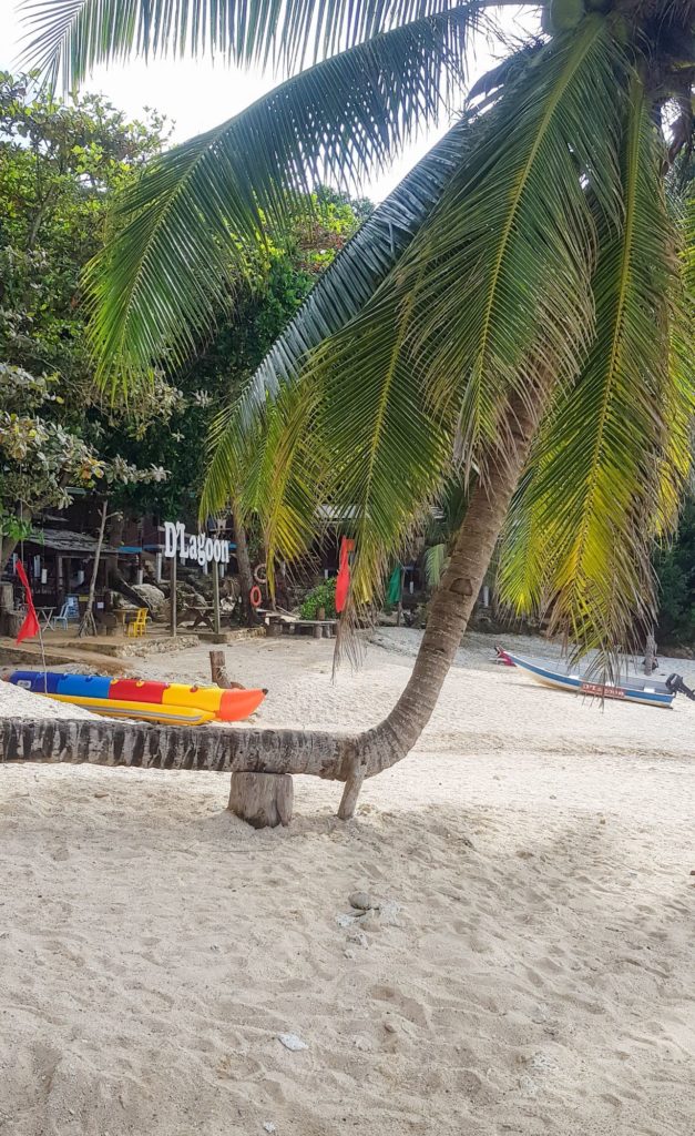 Ici c’est l’adresse de Robinson Crusoe : une petite plage, des chalets sur pilotis, des cocotiers, une barque, des hamacs qui se balancent doucement au gré du vent et même une balançoire !