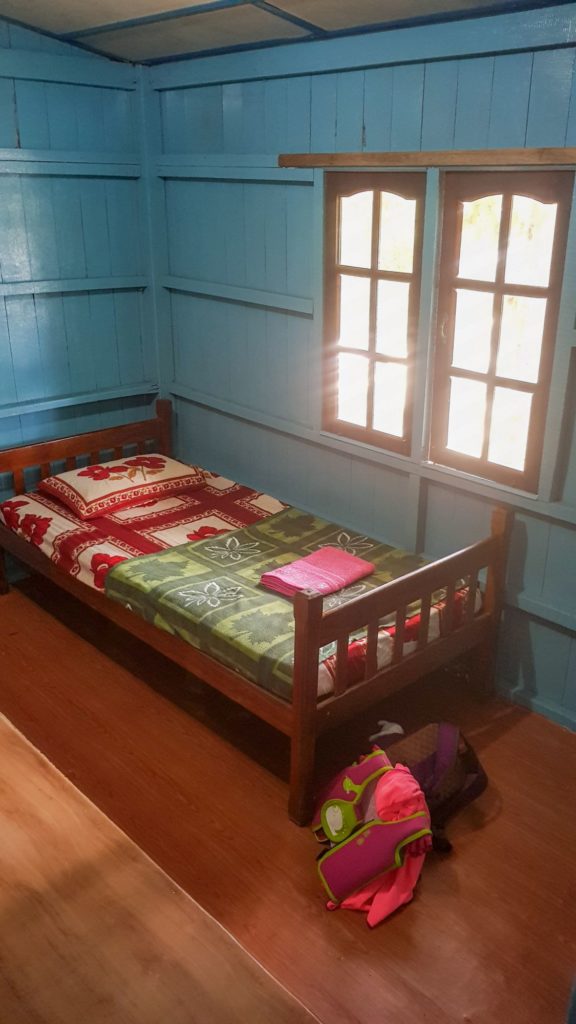 Nous repartons sur notre petite plage de Robinsons et allons nous installer dans notre cabane. Elle est simple, mais peinte avec des couleurs vives et ressemble à une cabane de pêcheur.