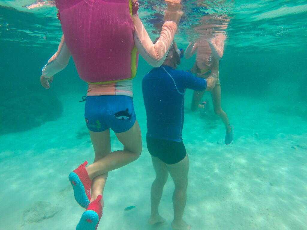Nous partons équipés d’eau, d’un pique-nique et nous embarquons, couverts des pieds à la tête !! (et oui, c’est souvent pendant que nous observons joyeusement les fonds que nos fesses se mettent à cuire !…)