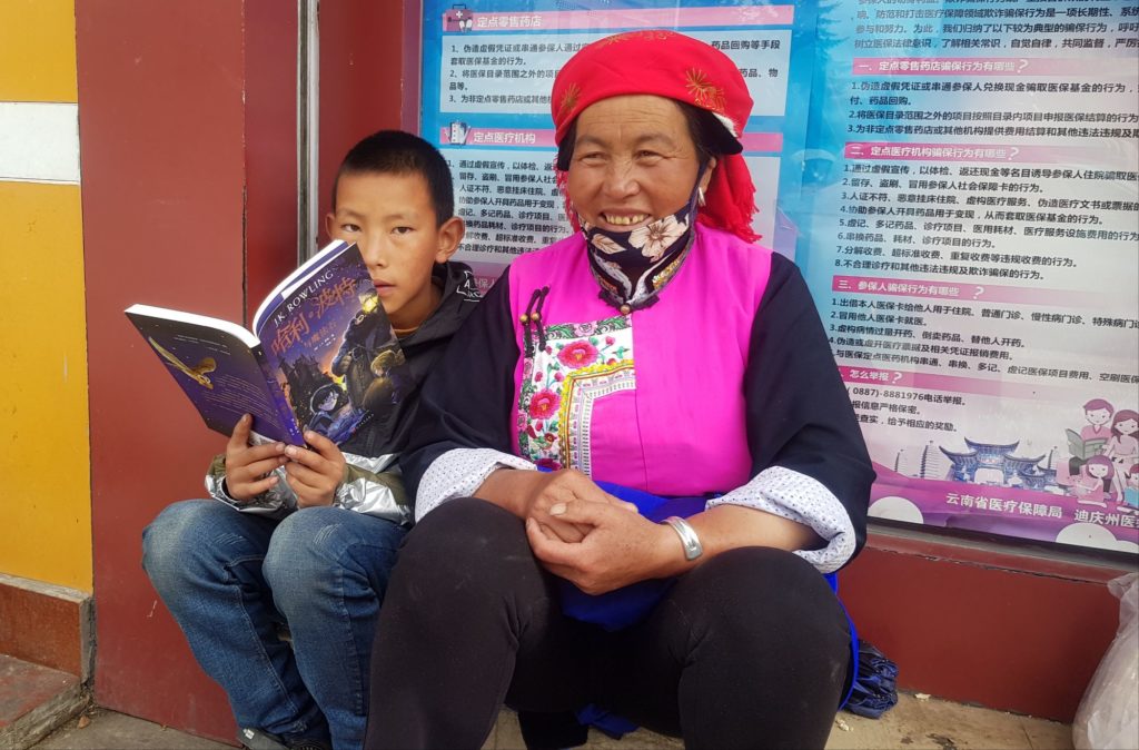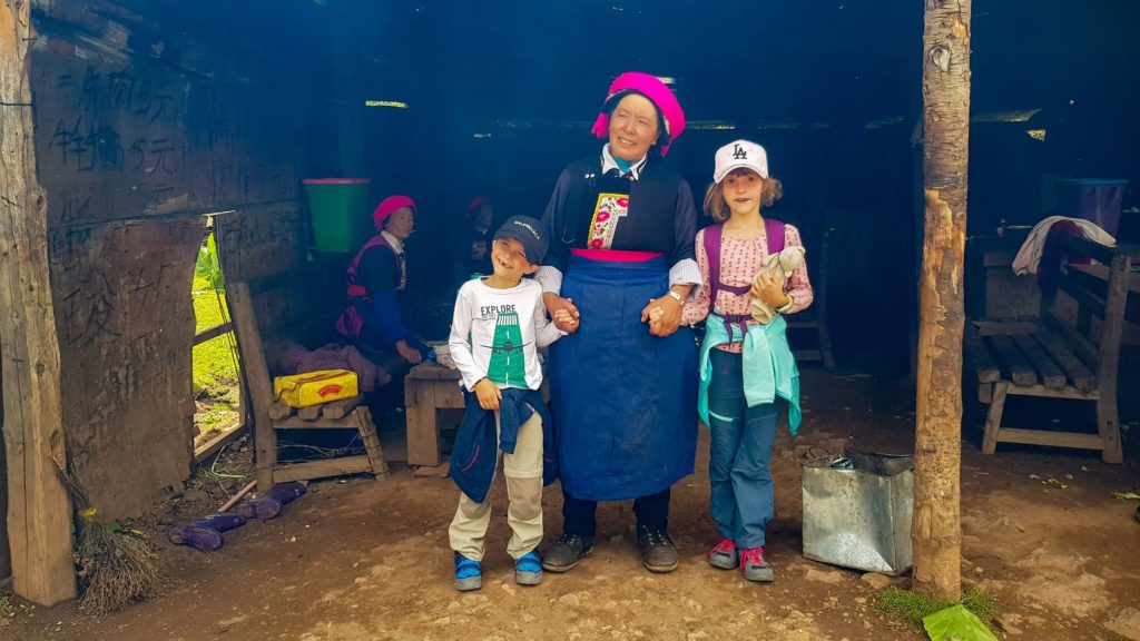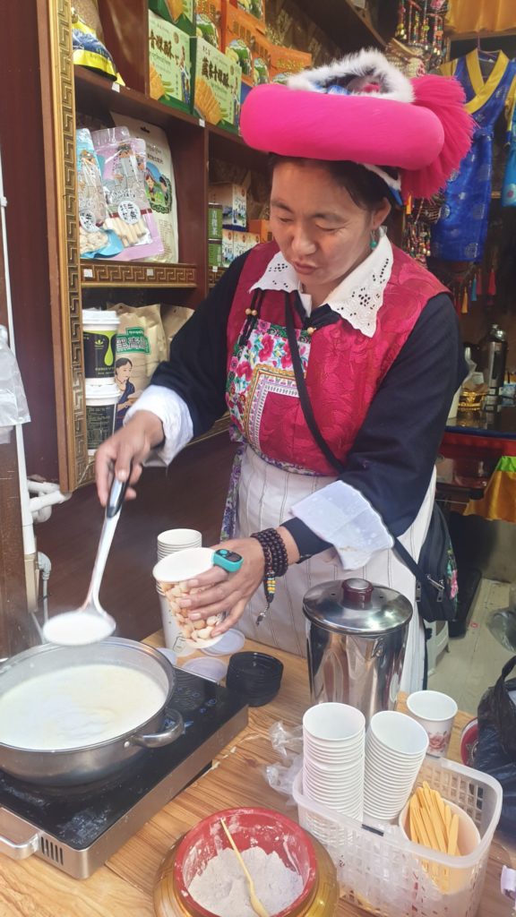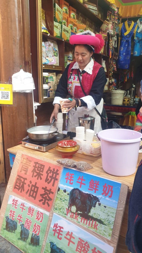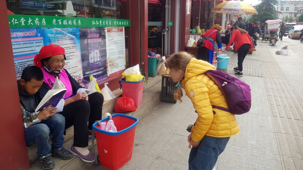 À peine 5 min après, une voiture s’arrête : une dame est à son bord et nous propose de nous emmener. Elle va dans Shangri-la. Nous discutons avec elle, elle est tibétaine et tient une auberge près de la nôtre !
