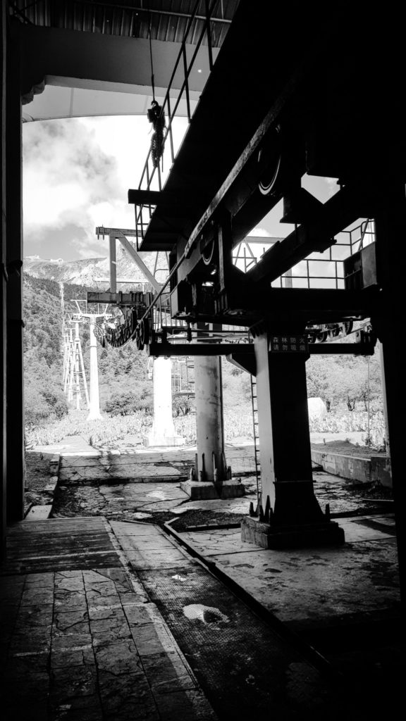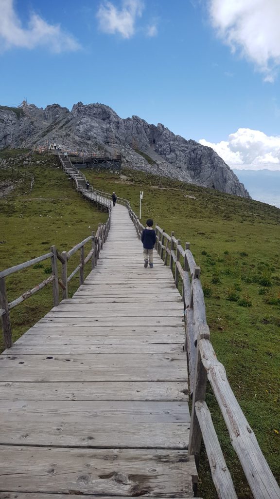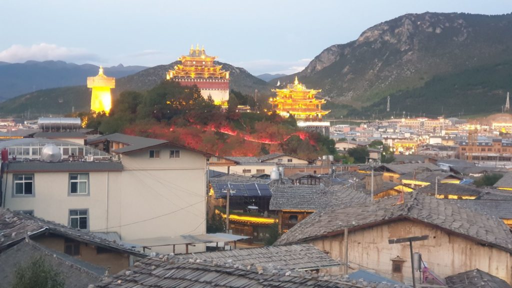 Nous reprenons le dernier téléphérique. Arrivés en bas, plus de taxis qui puissent nous ramener à Shangri-la. Nous partons à pied en nous disant que nous trouverons peut-être un véhicule plus loin (le site est touristique, il y a quelques voitures qui passent). On joue à Shangri-la Express ?!…