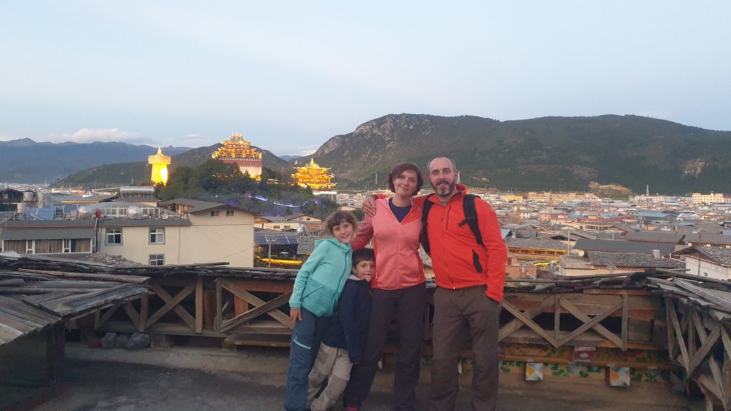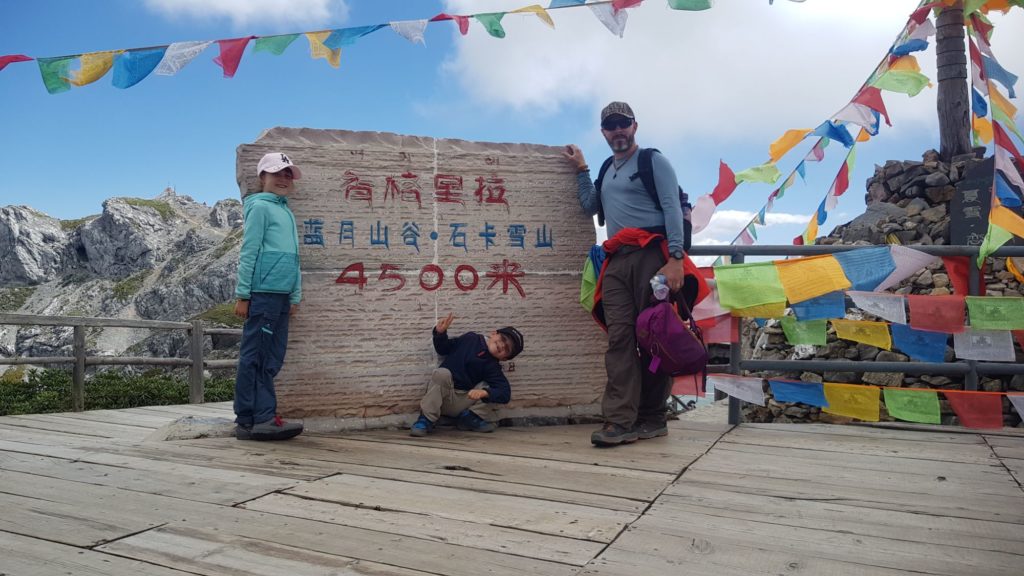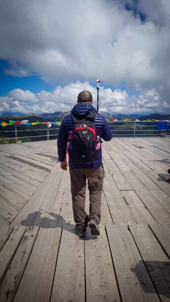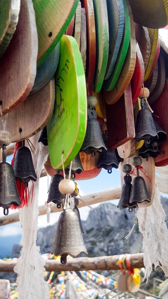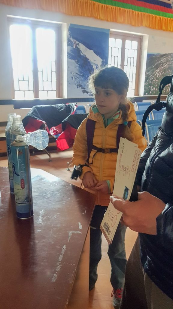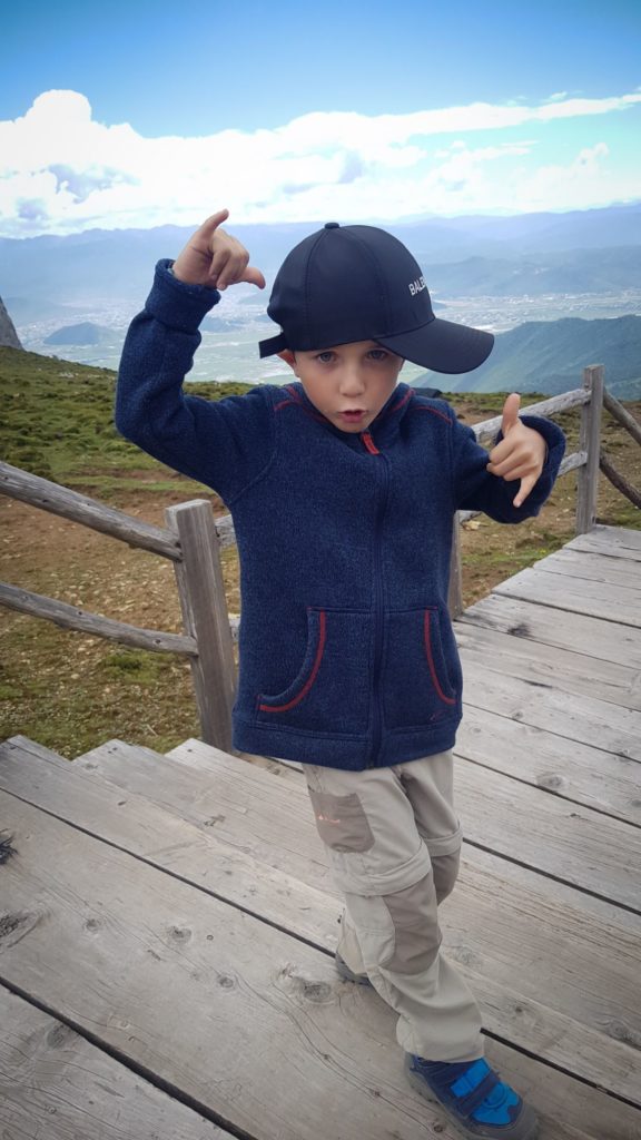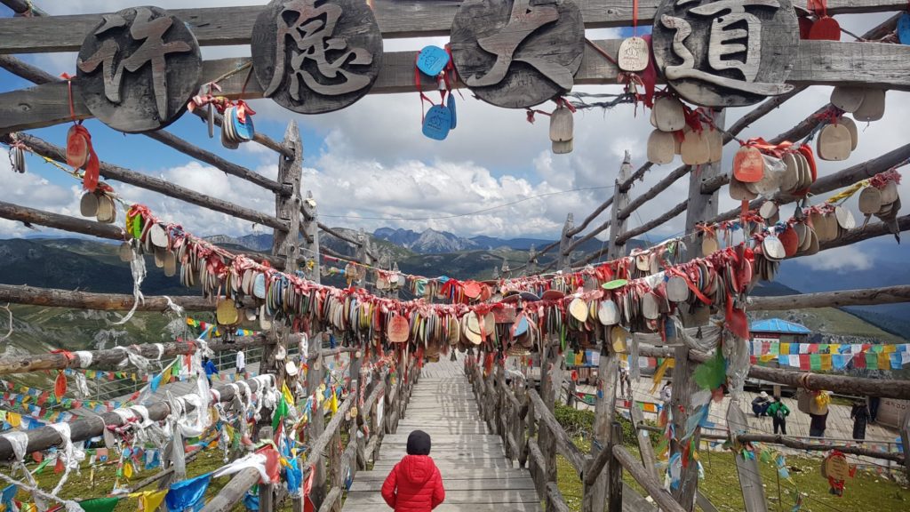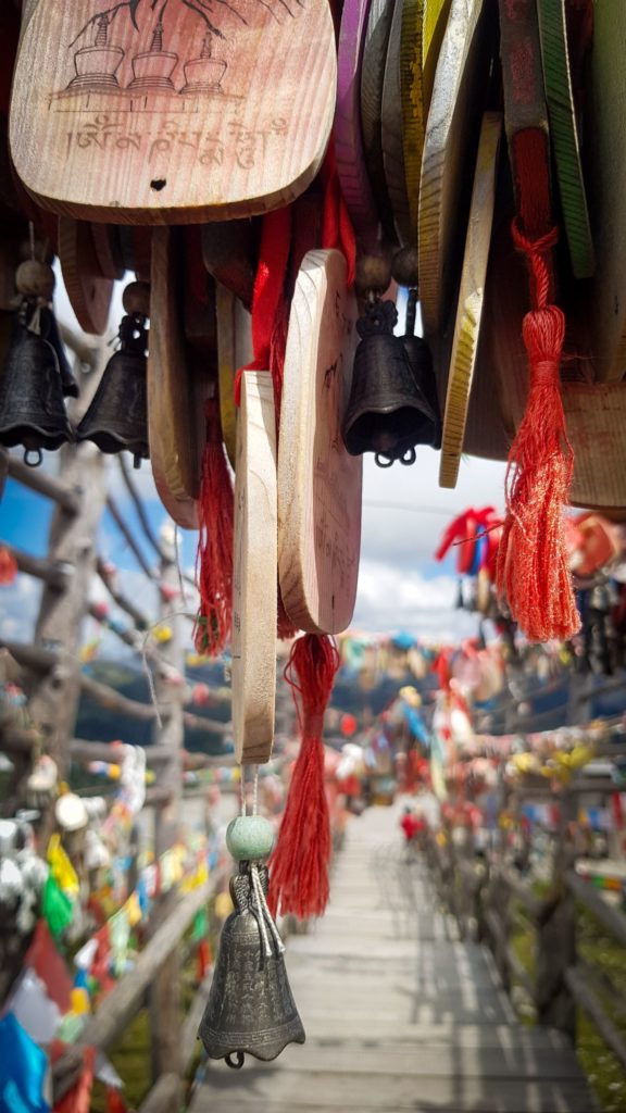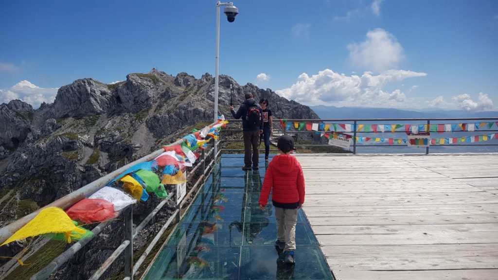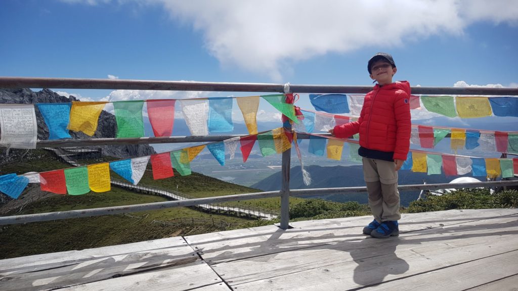 La montée se fait en 2 fois (2 téléphériques différents), histoire de s’acclimater un peu. Arrivés en haut, c’est superbe !! Nous avons une vue à 360° sur toute la chaîne de montagnes environnantes. Au loin, sur certains pics : la neige ! Nous parcourons différents plateformes où les drapeaux tibétains claquent dans le vent…Emma a un peu de mal à respirer, nous lui donnons de l’oxygène régulièrement. A cette altitude, nous sommes vite essoufflés et nous allons lentement pour parcourir tout le site.