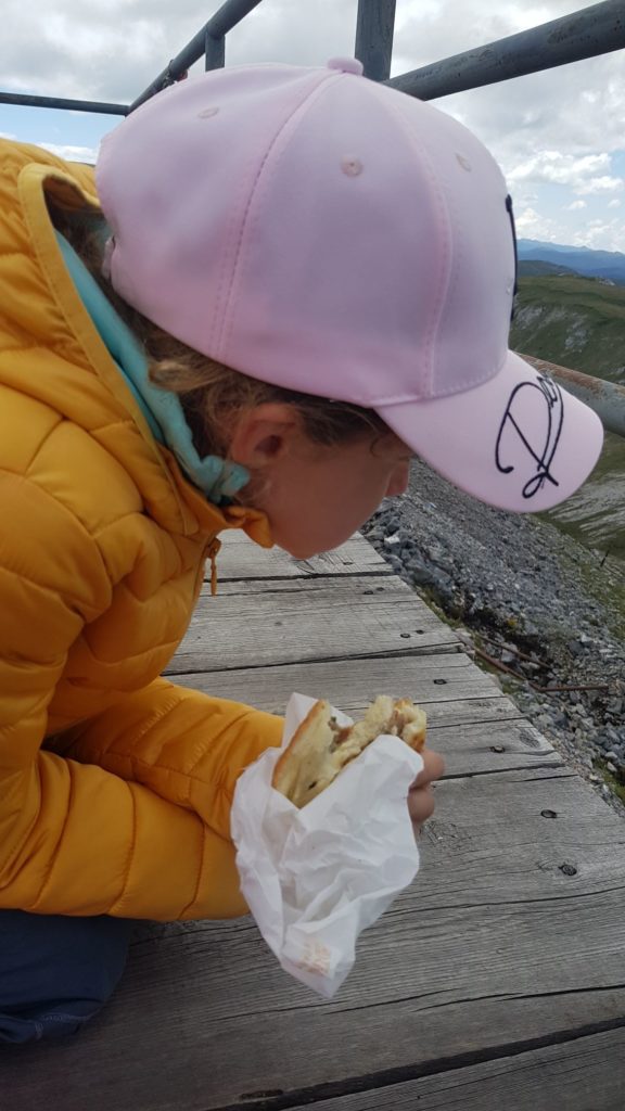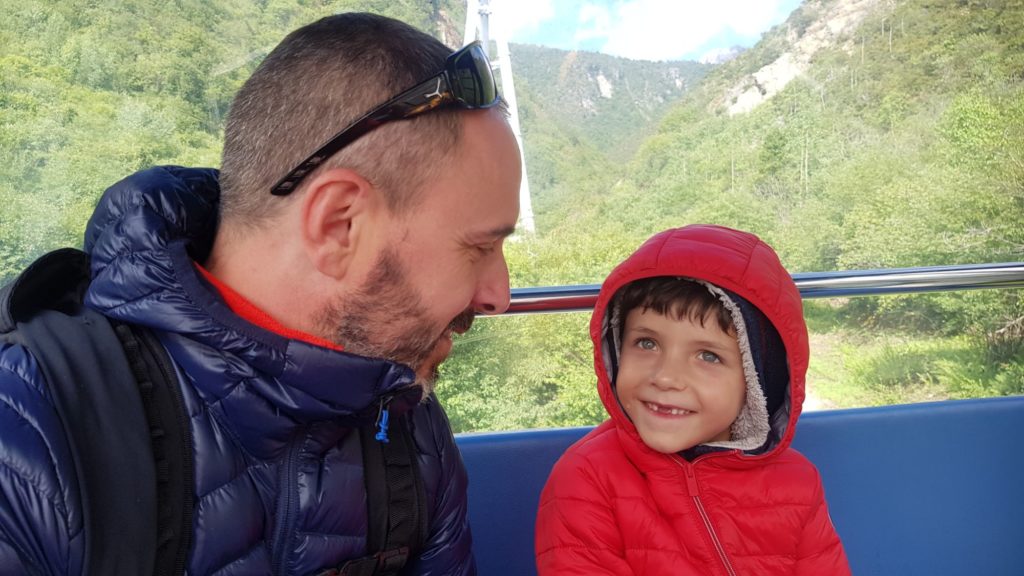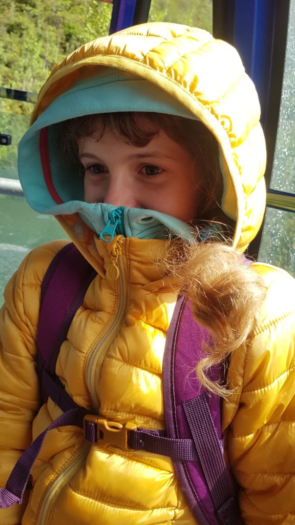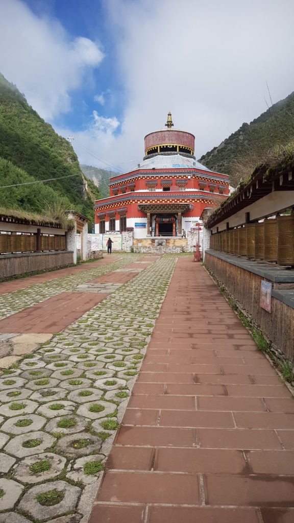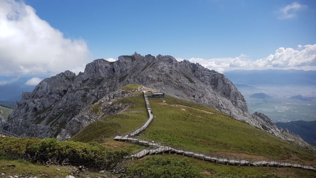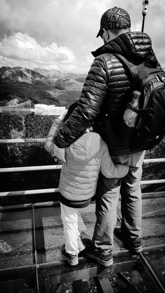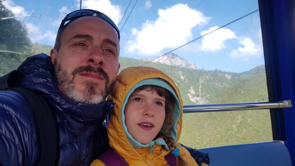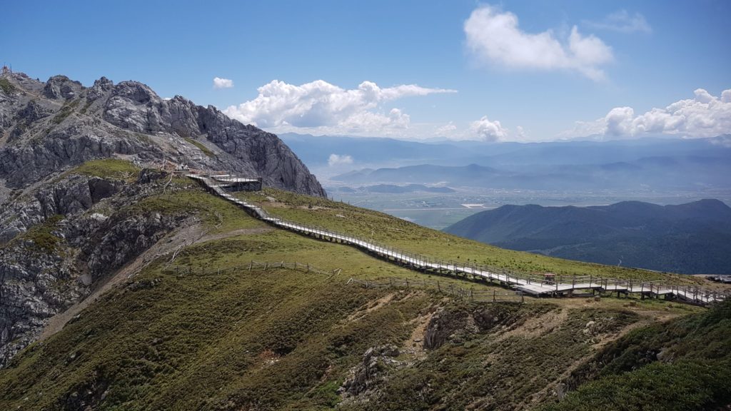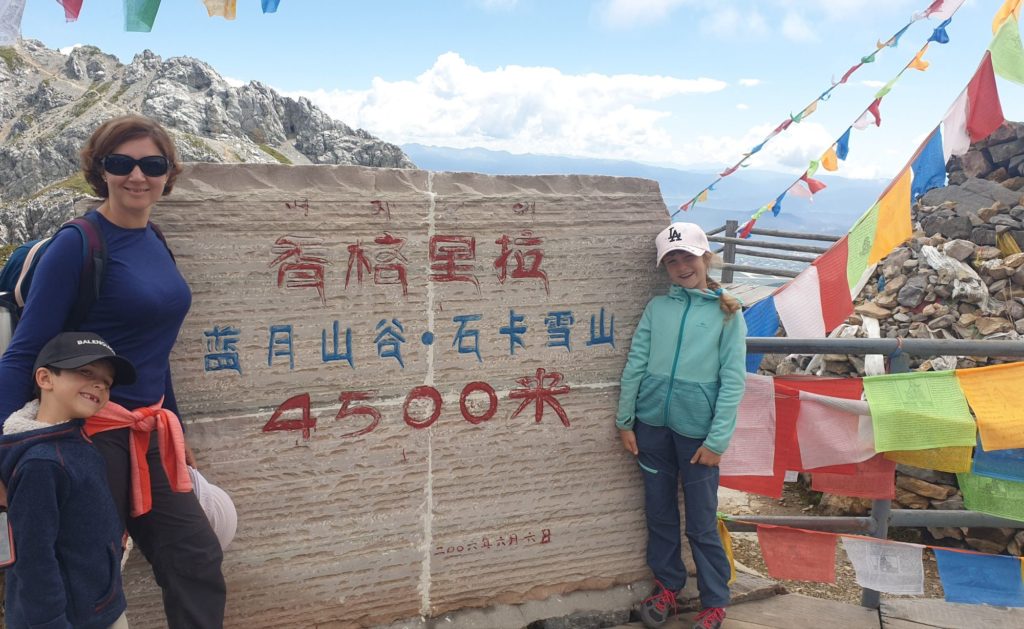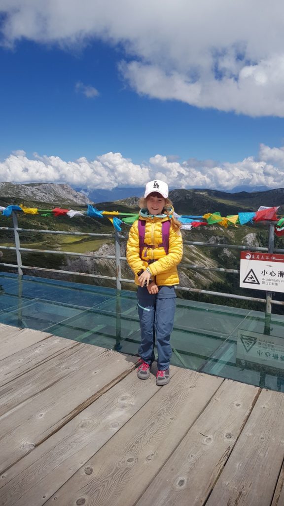 La montée se fait en 2 fois (2 téléphériques différents), histoire de s’acclimater un peu. Arrivés en haut, c’est superbe !! Nous avons une vue à 360° sur toute la chaîne de montagnes environnantes. Au loin, sur certains pics : la neige ! Nous parcourons différents plateformes où les drapeaux tibétains claquent dans le vent…Emma a un peu de mal à respirer, nous lui donnons de l’oxygène régulièrement. A cette altitude, nous sommes vite essoufflés et nous allons lentement pour parcourir tout le site.