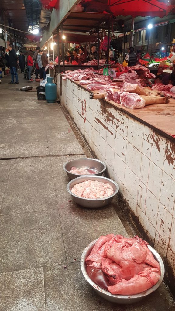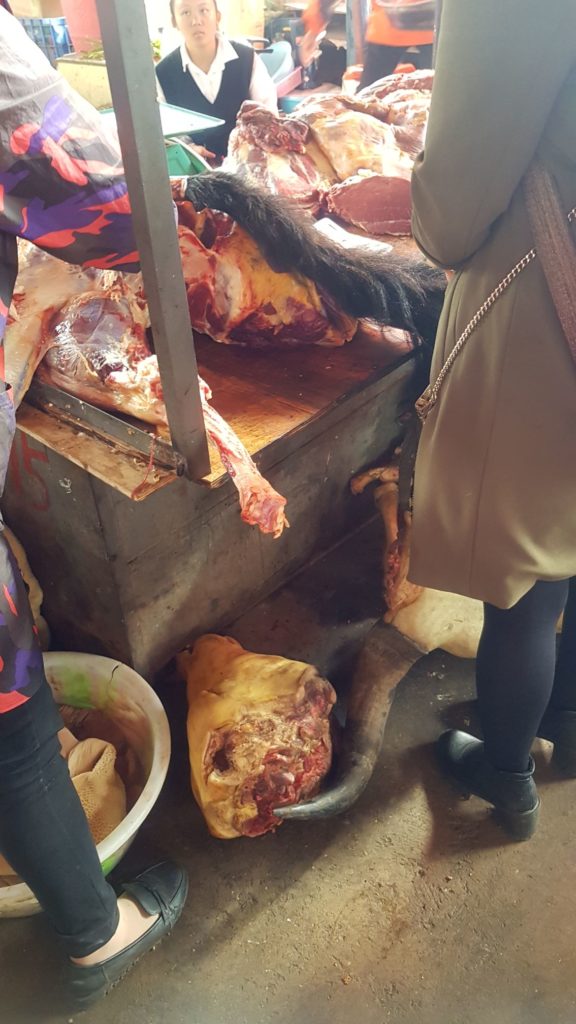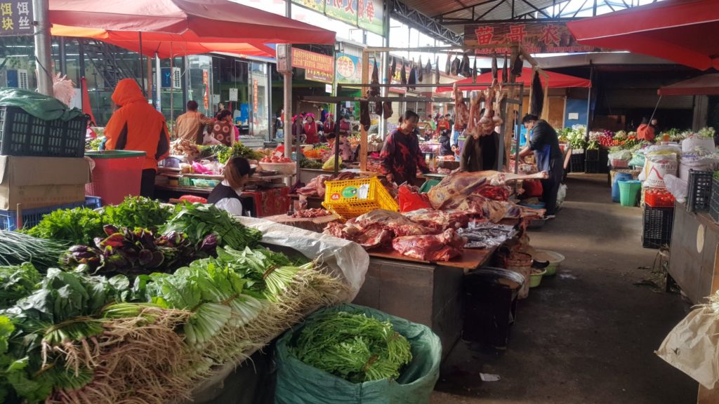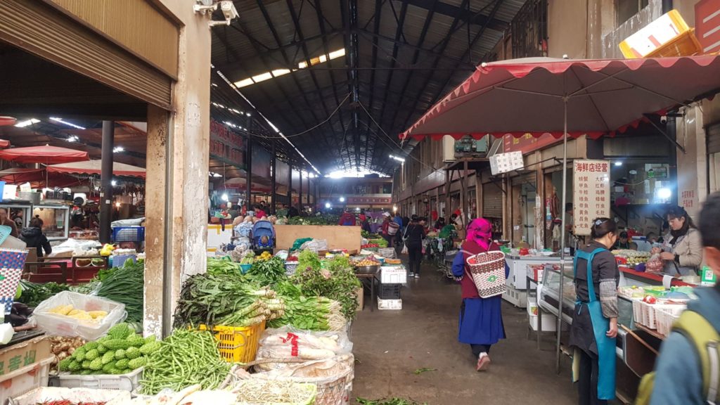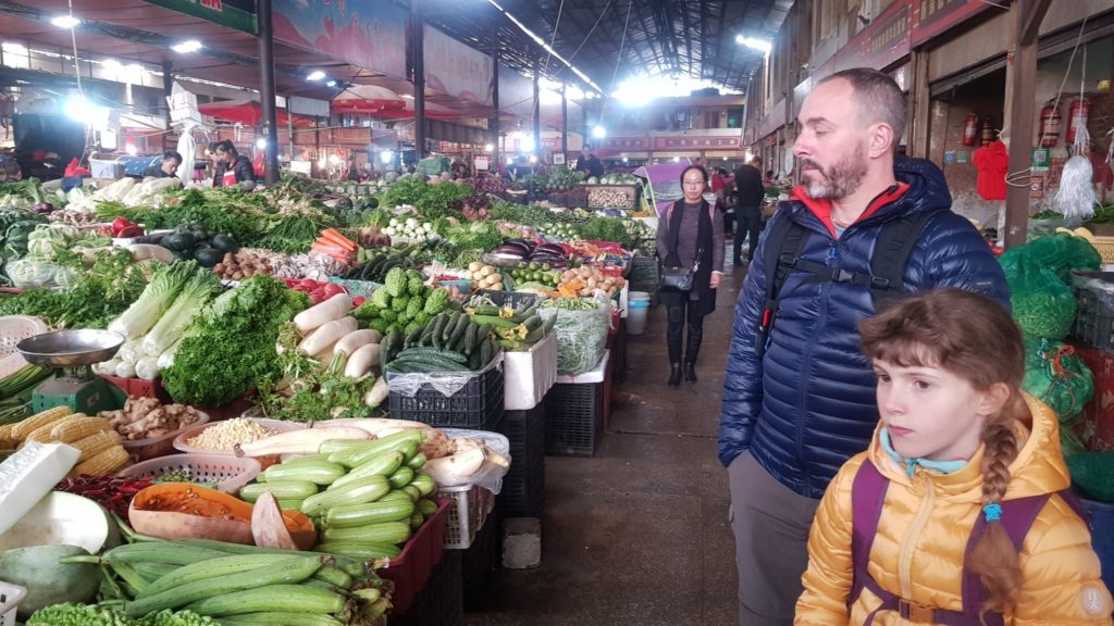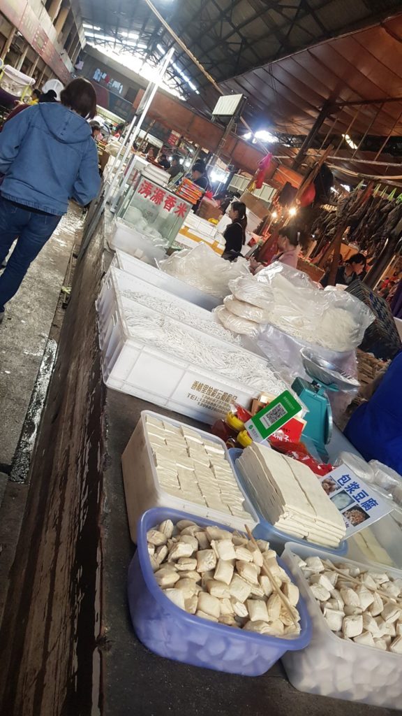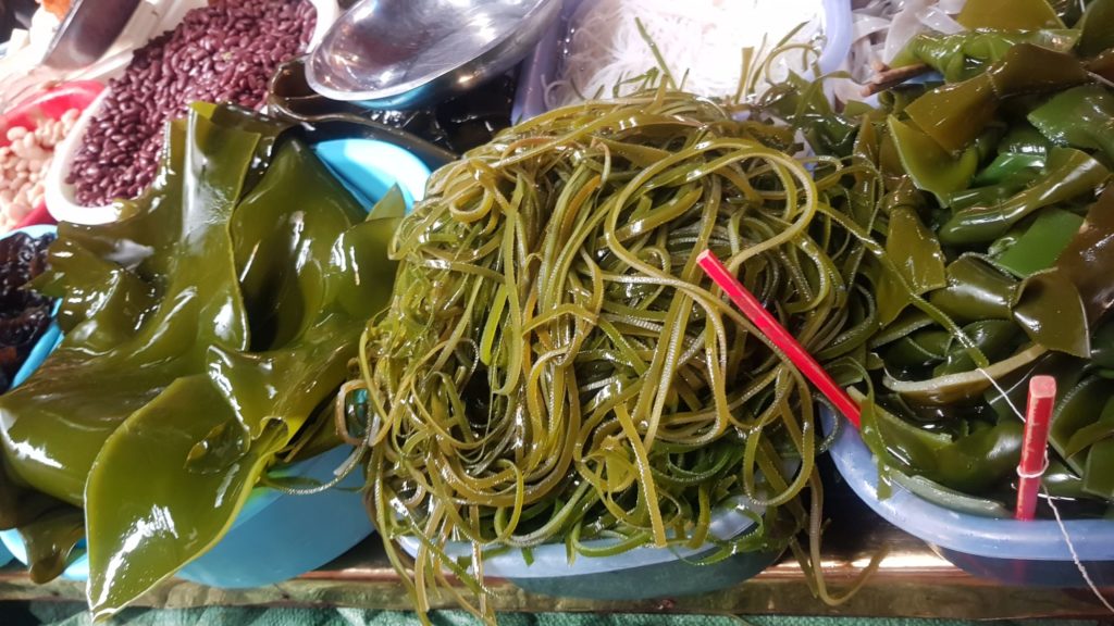 Nous partons ce matin au marché de la ville, dans une halle couverte. Nous aimons ce genre d’endroits en Asie où l’on enchaîne les odeurs (plus ou moins agréables…) et les couleurs.