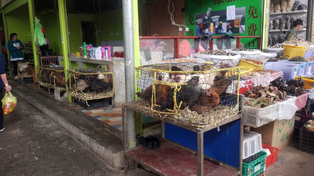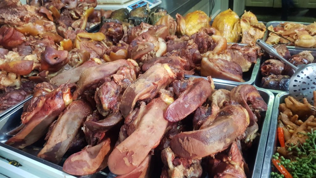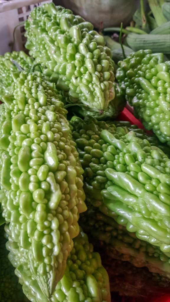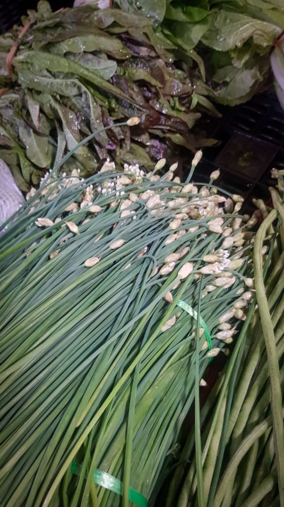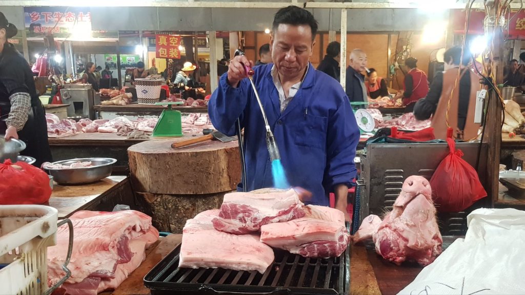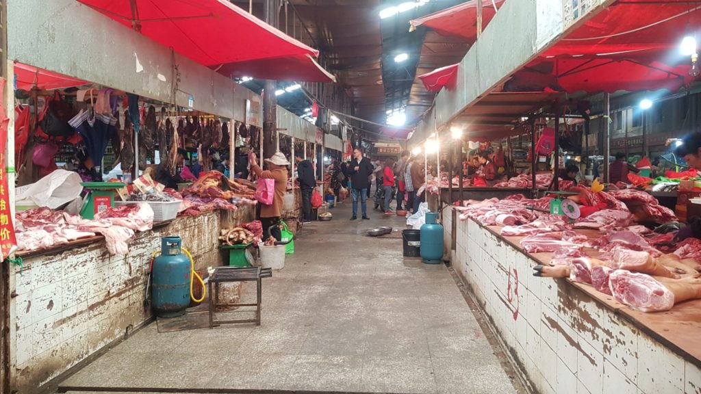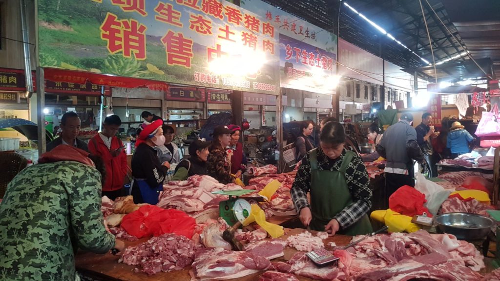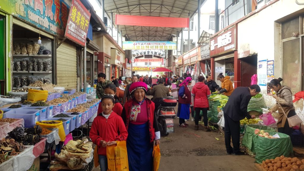 Nous partons ce matin au marché de la ville, dans une halle couverte. Nous aimons ce genre d’endroits en Asie où l’on enchaîne les odeurs (plus ou moins agréables…) et les couleurs.