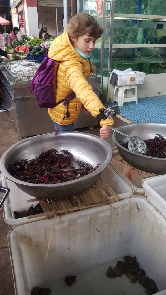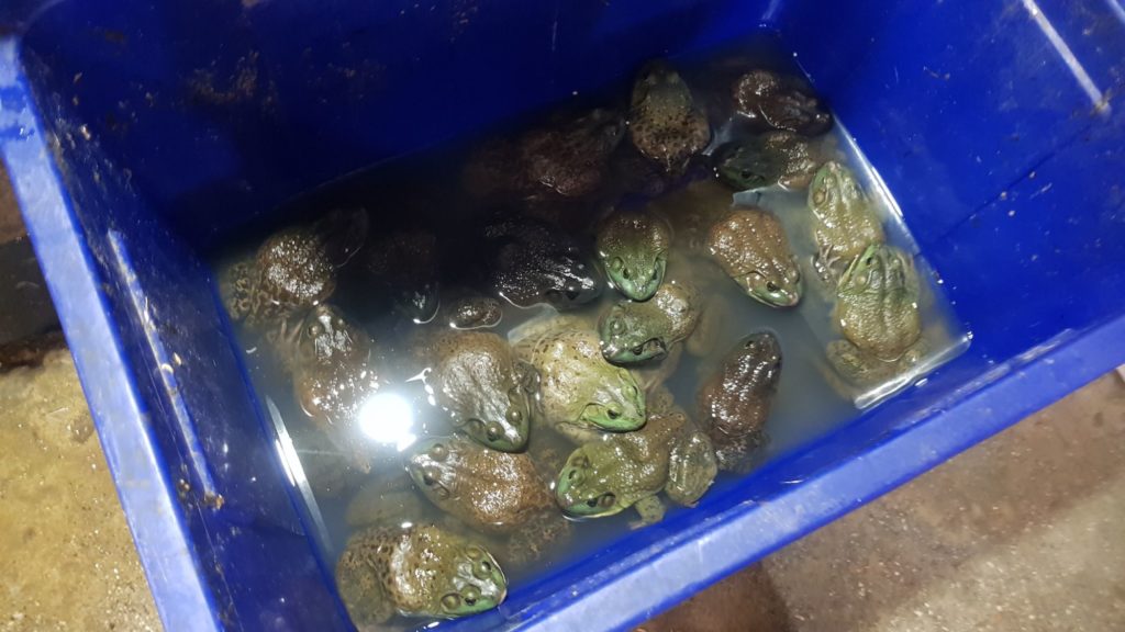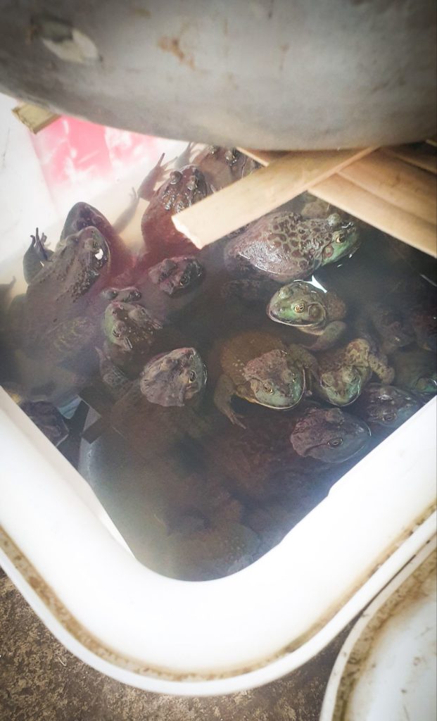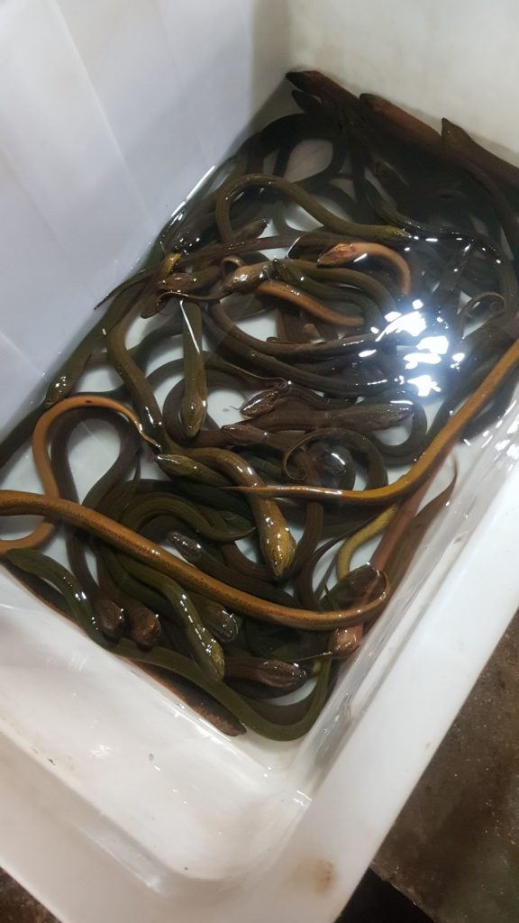 Du côté des poissons, tout est vivant bien sûr, comme pour les volailles d’ailleurs ! On y trouve des choses étonnantes : crapauds, grenouilles et autres anguilles…beurk !