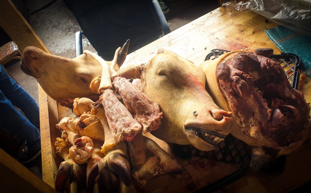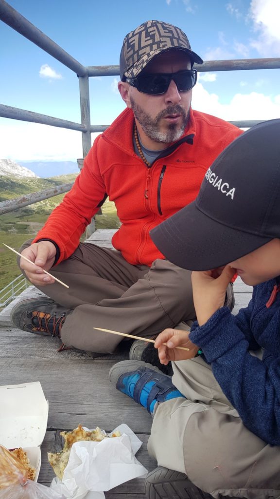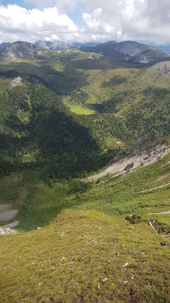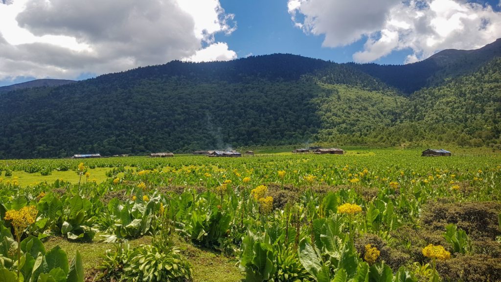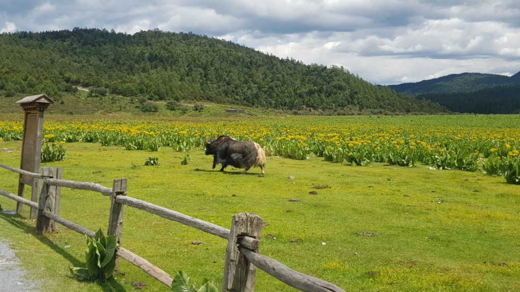 Nous reprenons le téléphérique pour accéder au 1er plateau où nous partons randonner sur des chemins balisés. Nous longeons une grande prairie où est installé un petit village de bergers tibétains. Les habitations sont composées de cabanes de bois d’où s’échappe de la fumée. Au bord du chemin, la végétation est basse, mais très dense, ce qui fait qu’on ne devine pas quels sont les animaux qui s’y cachent. C’est donc d’un seul coup que des cochons accompagnés de leurs petits débouchent devant nous ! Nous les observons de loin, on ne sait jamais !
