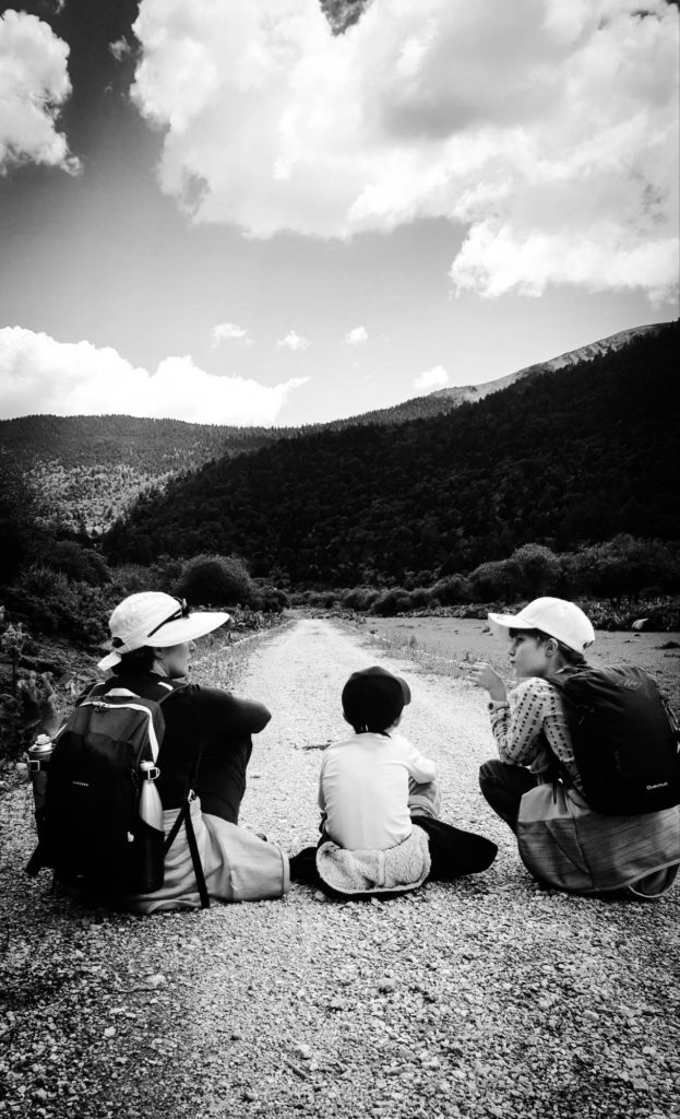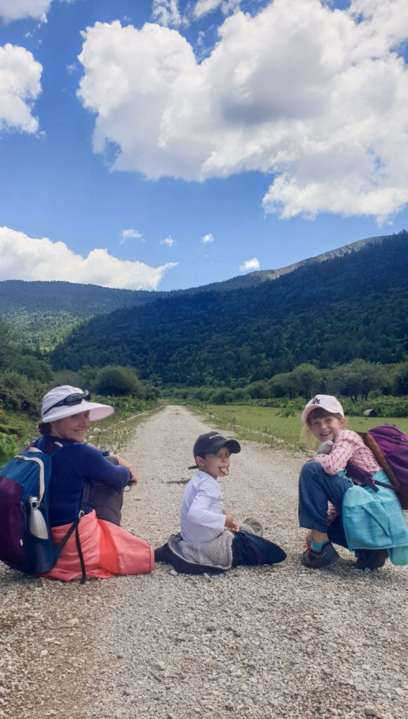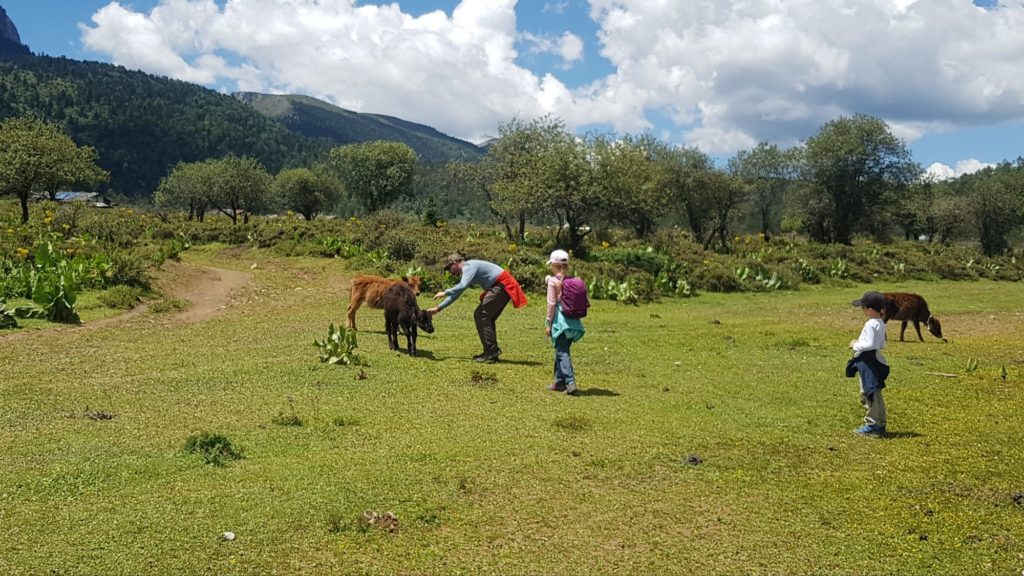 Nous entendons des cloches tout près de nous, il doit y avoir des yaks pas loin… effectivement, c’est tout un troupeau qui débarque juste derrière nous, sortis des broussailles et qui remontent vers le village et les étables. Nous nous mettons sur le côté, pour ne pas les déranger et les effrayer. Derrière les adultes, il y a toute une bande de veaux qui galopent dans tous les sens ! Parmi eux, un s’est coincé une pâte avant dans son collier et n’arrive pas à avancer. Nous vérifions qu’aucun yak adulte ne soit là, Eric et les enfants essaient de l’attraper pour le libérer. Le veau ne se laisse pas approcher. Je tente ma chance et lui saute dessus ! Je l’attrape par le collier et me dépêche de lui libérer la pâte. Il est un peu sonné quand je le lâche, il a eu la peur de sa vie ! 😉