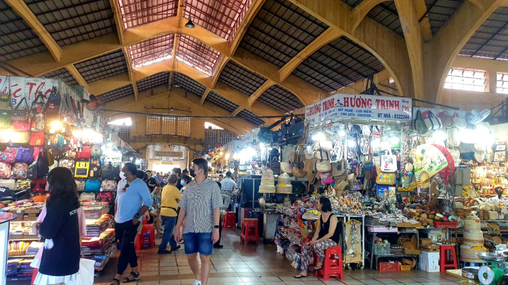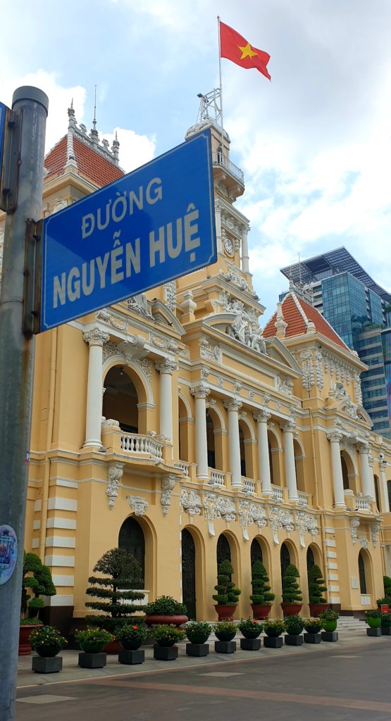 Nous avons trouvé sur un blog une proposition de circuit à pied qui nous mène d’abord au marché Bên Thành, le plus vieux marché couvert de la ville où les vendeurs se croient à Marrakech (ils t’interpellent, t’attrapent par le coude, c’est insupportable). Nous passons ensuite devant l’hôtel de ville, construit dans un style néo-renaissance et aujourd’hui siège du Comité populaire de la ville, et remontons la fameuse avenue Nguyen Huê, l’avenue chic de la ville.