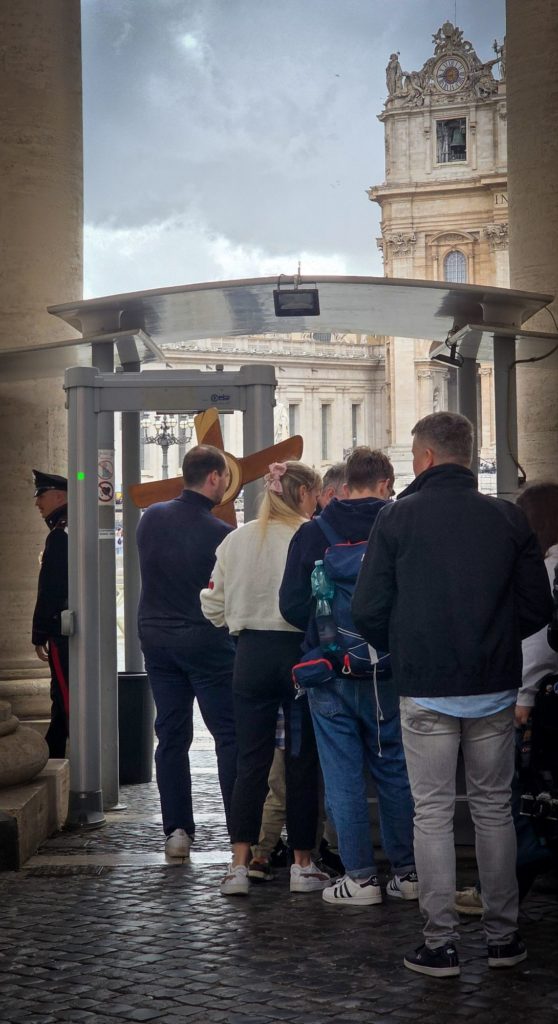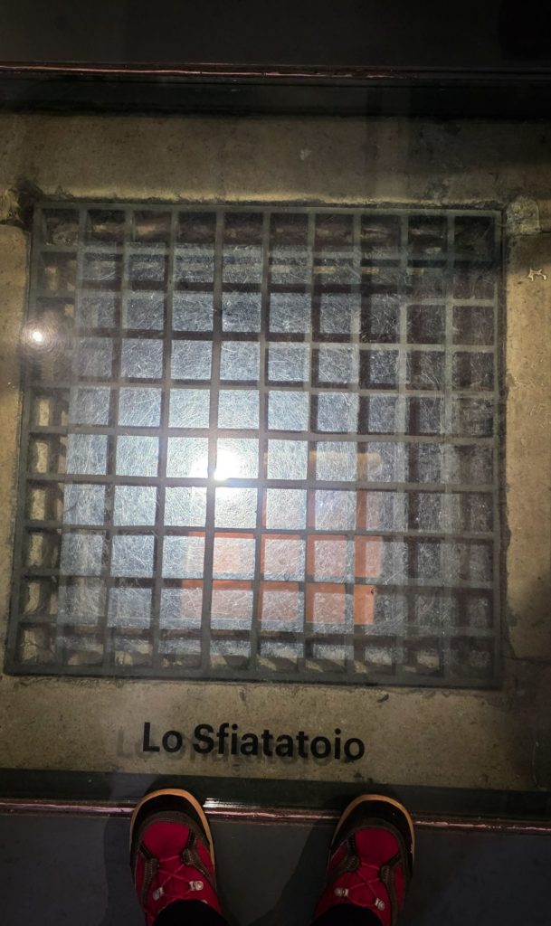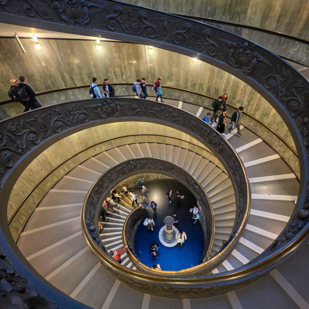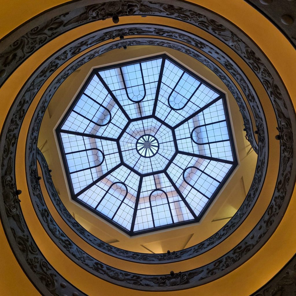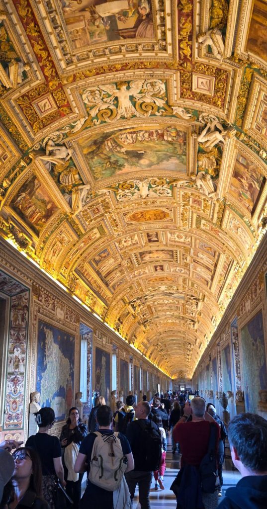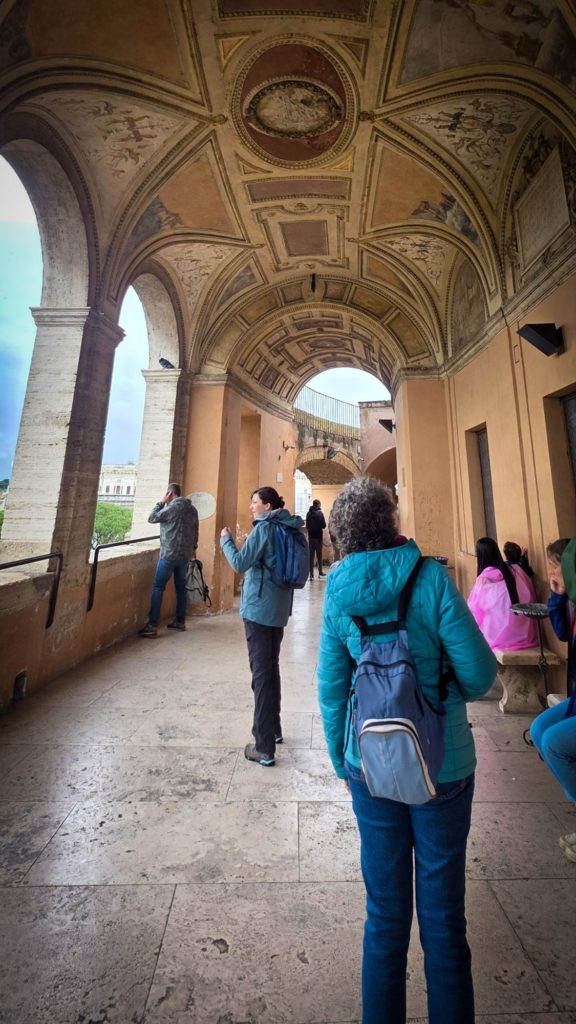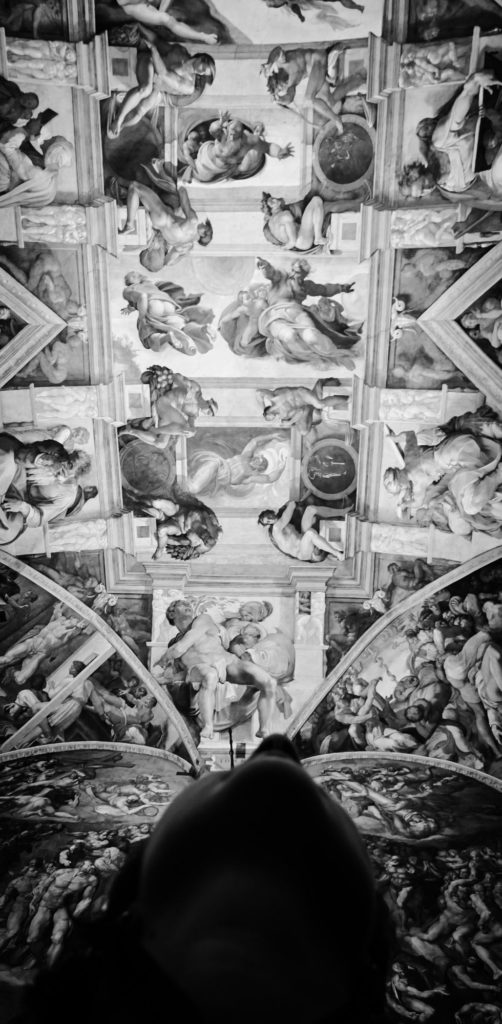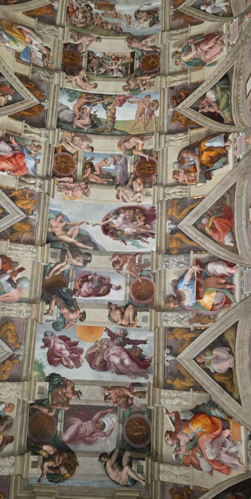 J’explique un peu l’histoire de Michel-Ange et de ses conditions de travail pour la réalisation du plafond et de la gigantesque fresque du Jugement dernier, car un peu plus loin, c’est l’arrivée à la Chapelle Sixtine…la célèbre !