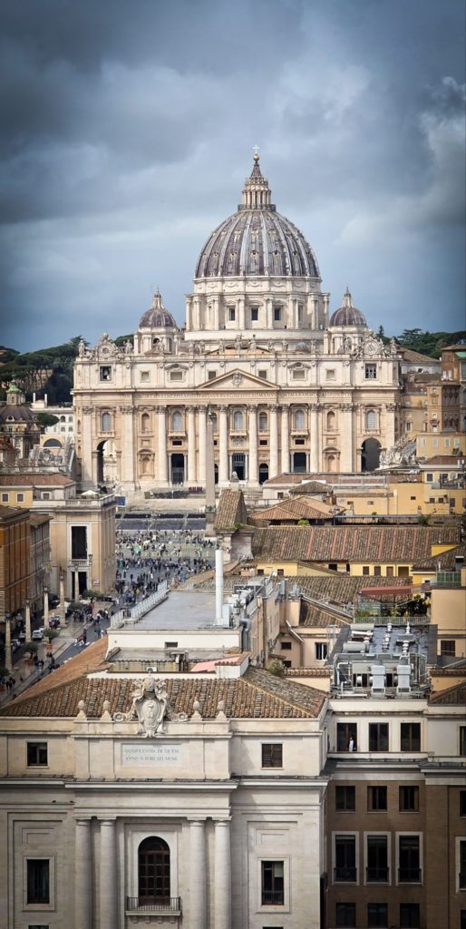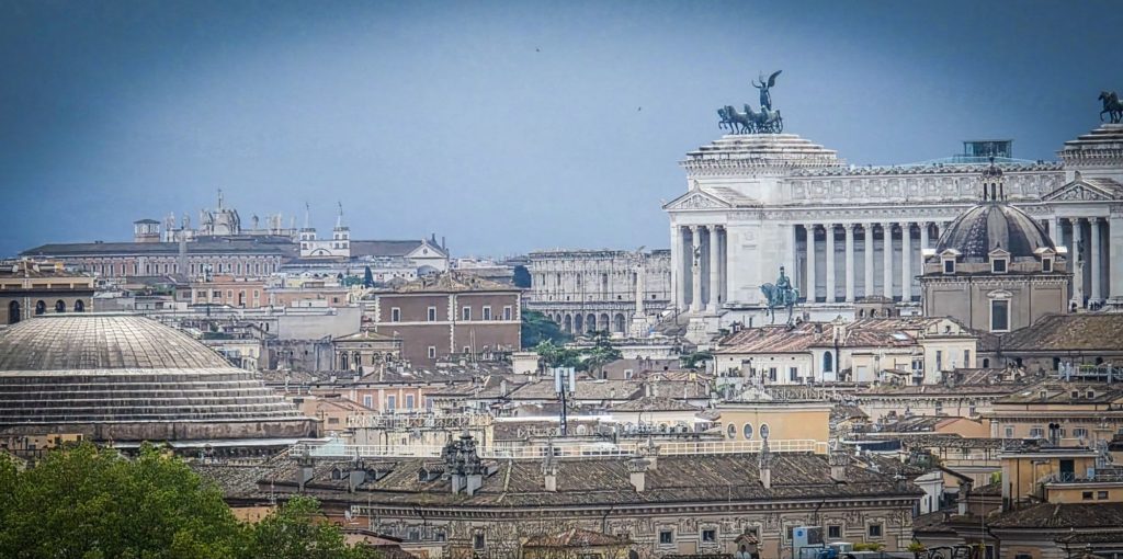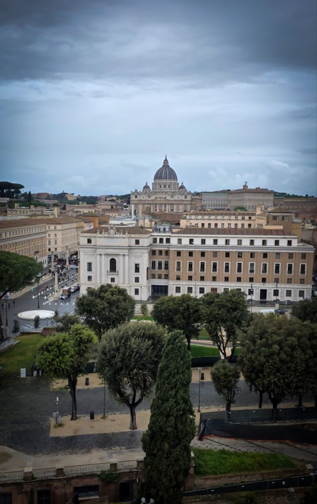 Du haut de la terrasse la plus élevée, nous avons, pile avec les rayons du soleil, une vue magnifique sur la basilique St Pierre, le Tibre, le reste de la ville… et de la pluie au loin qui semble arriver sur Rome !