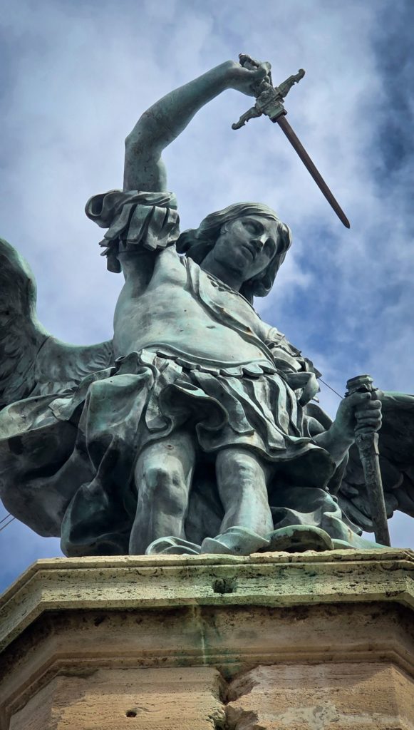 Ce monument tient son nom d’une légende selon laquelle un ange se serait posé sur le dôme, rangé son épée dans un fourreau pour annoncer la fin de l’épidémie de peste de 590.