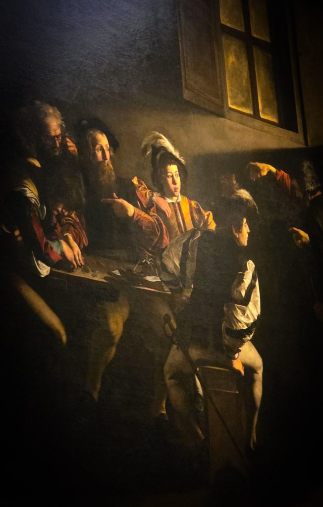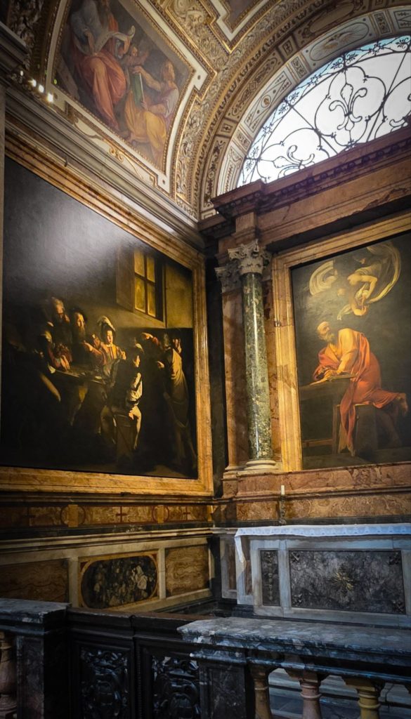 Nous remontons en direction de l’église Saint-Louis-des-Français, qui était fermée quand nous sommes passés devant tout à l’heure, pour admirer les 3 peintures monumentales du Caravage sur la vie de Saint Matthieu. Brutes, réalistes, avec une lumière de dingue et une obscurité incroyable, ces œuvres valent le détour !