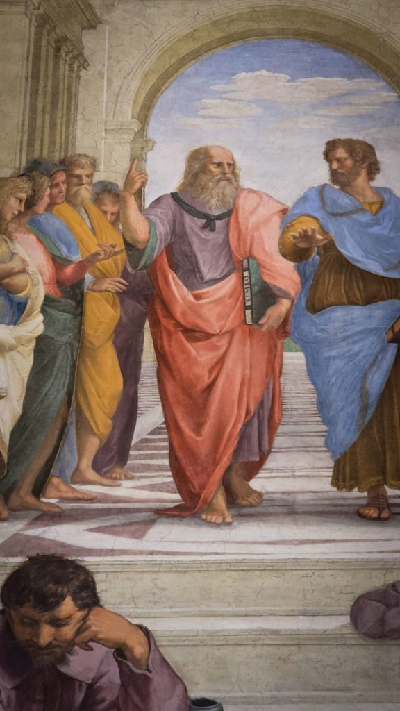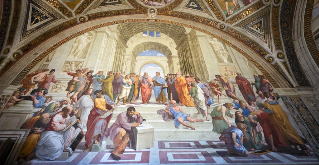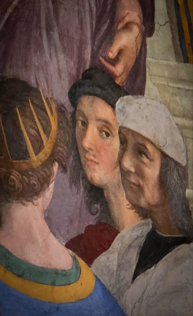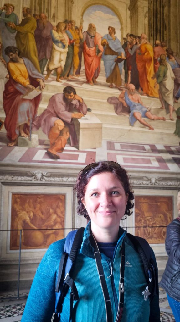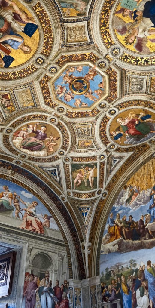 Des Giotto, Fra Angelico… nous ne nous attardons pas et remontons toutes les galeries pour atteindre les fameuses Chambres de Raphaël, avec notamment « l’Ecole d’Athènes », qui met en scène tous les grands penseurs de l’époque (c’est le principe de la Renaissance, l’Homme est au centre des préoccupations) sous les traits de ses amis (De Vinci, Michel-Ange, et lui-même).