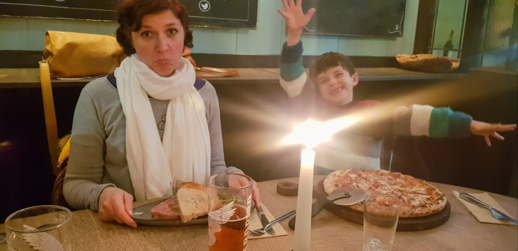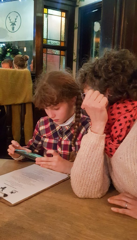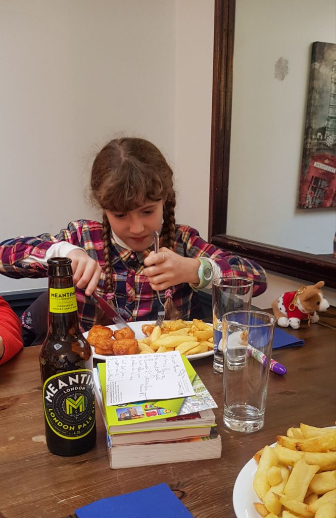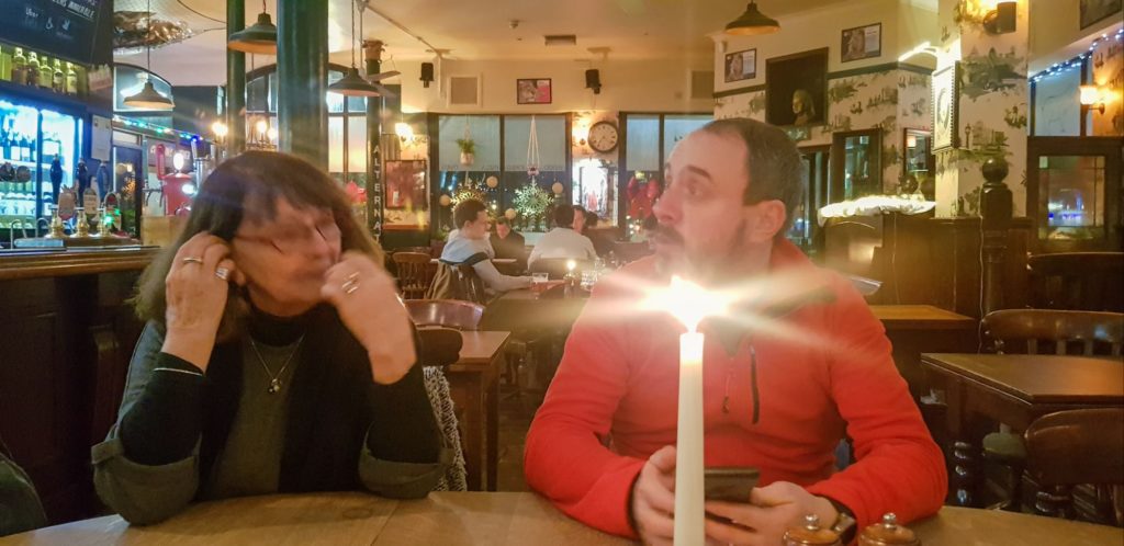 Le soir, pour le dîner, nous partons à pied dîner dans un vrai pub anglais, non loin de notre hôtel. Ambiance cosy, bougies sur les tables, musique de Noël, intérieur en bois et bonne bière, le lieu est super sympa ! Nous commandons des plats, vraiment bons, et des bières évidemment !