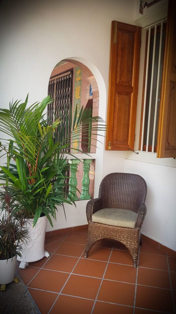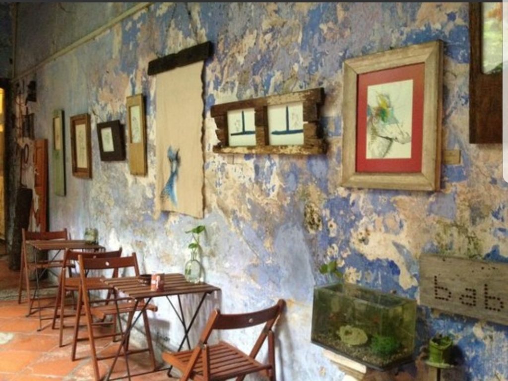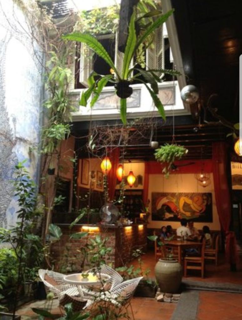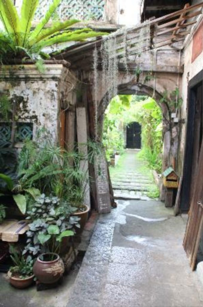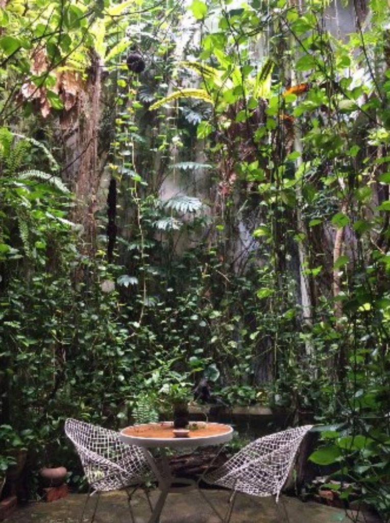 A l’intérieur, nous traversons une première pièce qui ressemble à un temple puis nous débouchons sur un patio dont les murs sont recouverts de plantes et d’oeuvres d’art. C’est sublime…