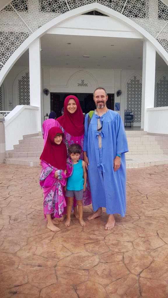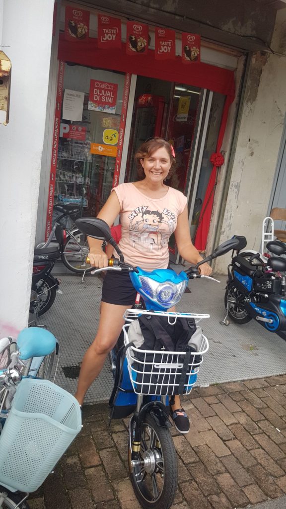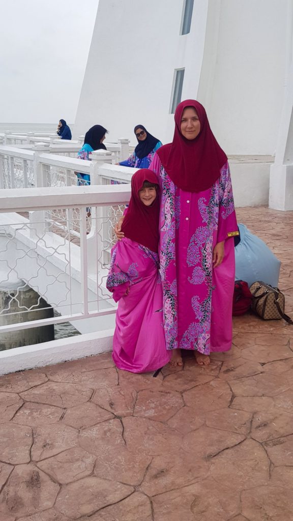 Après la sieste, nous repartons visiter la mosquée du centre, qui n’avait pas un grand intérêt, puis nous louons des scooters électriques pour aller voir la mosquée sur l’eau, en bord de mer. Nous avons dû enfiler les tenues adéquates, les images parlent d’elles mêmes…