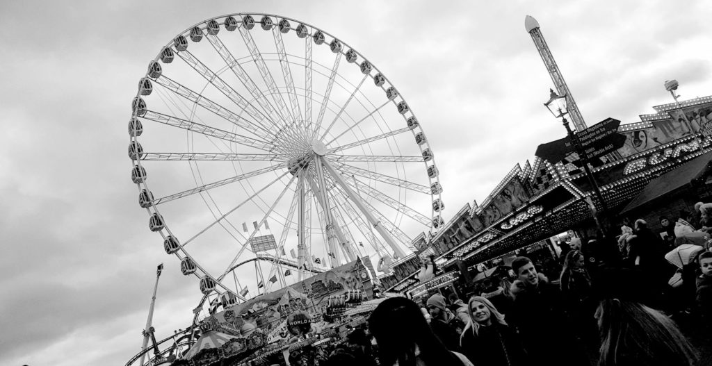 Nous arrivons à Hyde Park, où est installé pour les fêtes de Noël le Winter Wonderland, une énorme fête foraine ! La foule qui s’y presse est énorme elle aussi !! C’est im-pres-sion-nant ! Des manèges en tout genre, des grands huits…ça sent les crêpes, les gaufres, la barbe à papa et le vin chaud. J’ai envie d’une crêpe…les 8 livres affichées pour en avoir une toute simple me coupent l’appétit !