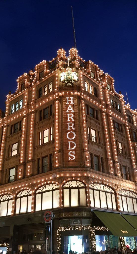 La nuit est tombée, il commence à faire très froid. Nous sortons du parc et marchons jusqu’à chez Harrods où nous espérons pouvoir nous poser dans un des cafés. Malheureusement, tout est bondé, nous nous sommes perdus dans les rayons du magasin, nous décidons de rentrer à l’hôtel nous poser et prendre un goûter.
