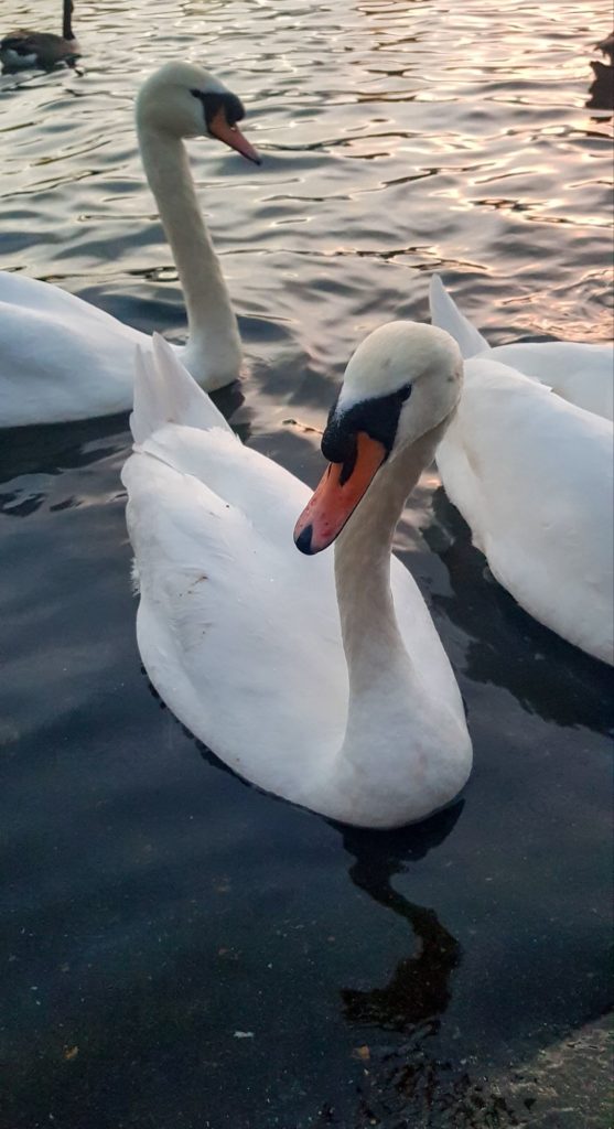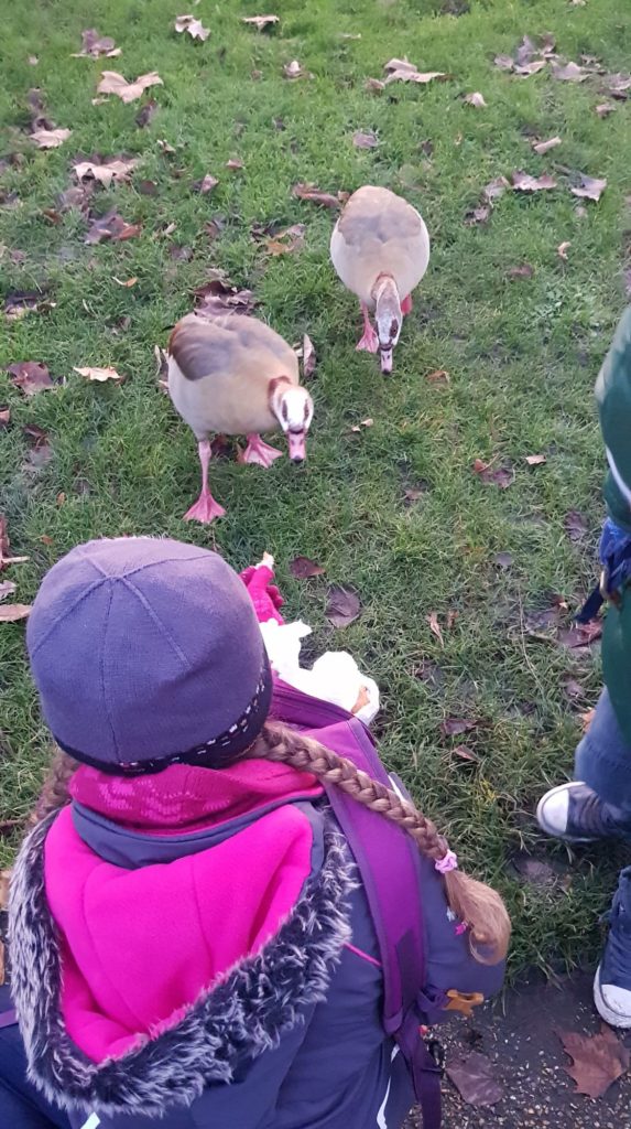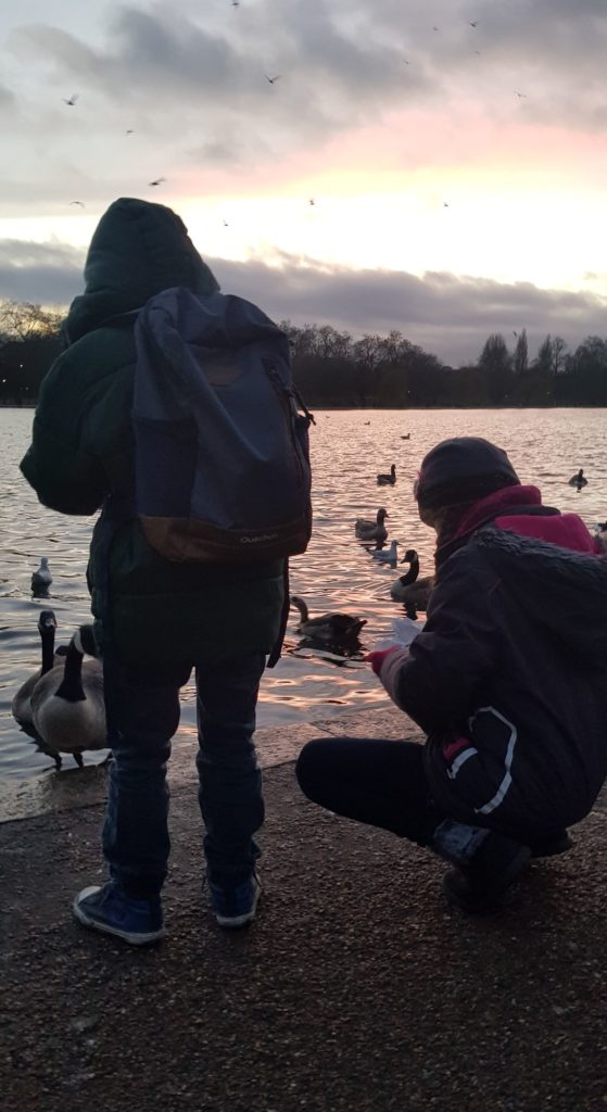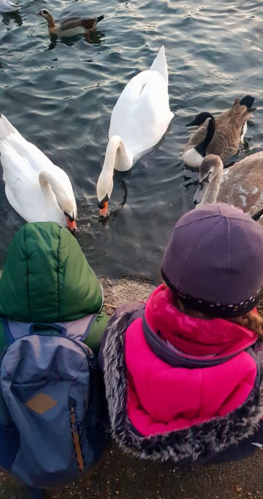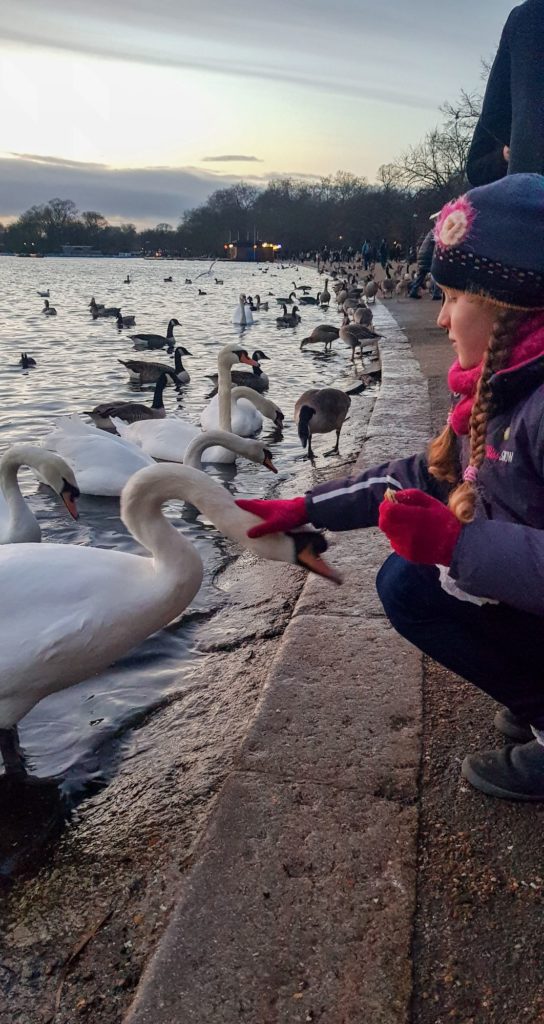 Les enfants font quelques tours de manège, puis nous quittons le lieu pour aller donner à manger aux écureuils et aux cygnes sur le lac dans Hyde Park.